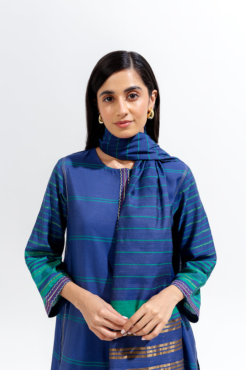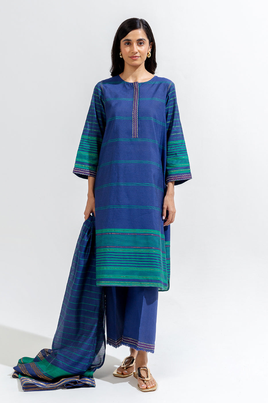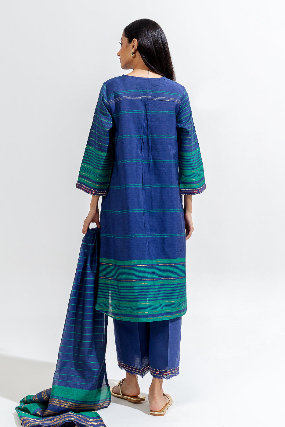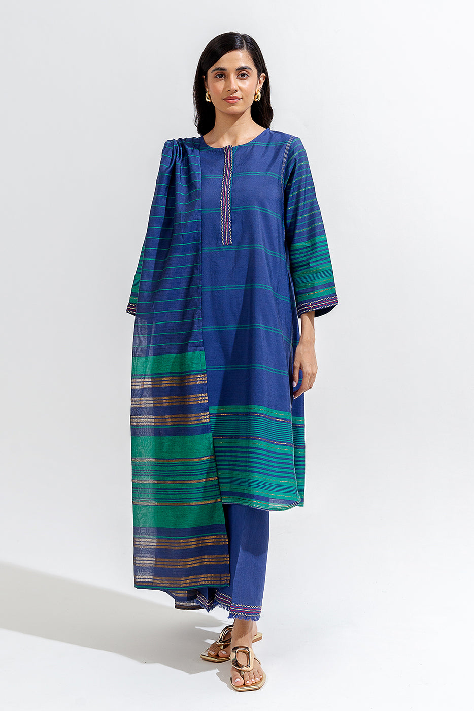 description: jacquard three piece set with baadla embroidery detail on neck, sleeves and trouser hem finished with frayed edges fabric: yarn dyed what you'll get: shirt+pant+dupatta fit: casual fit size & fit: model height is 5'6" model is wearing 8 size