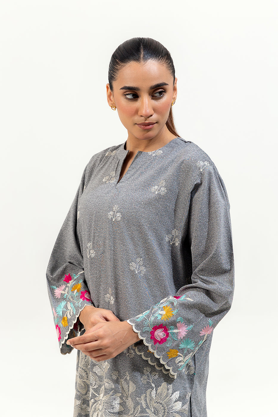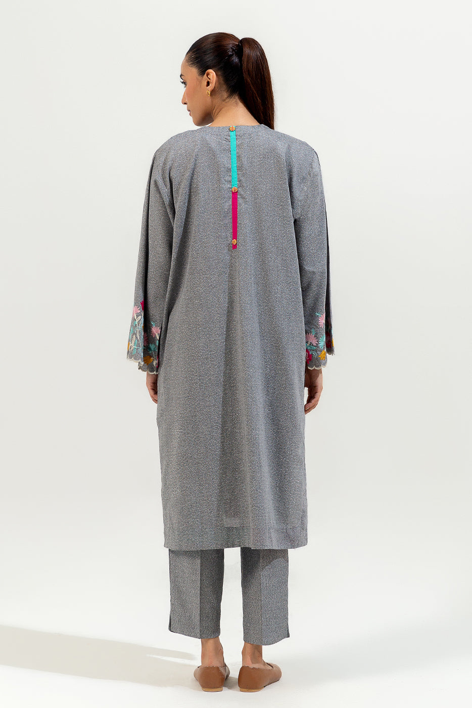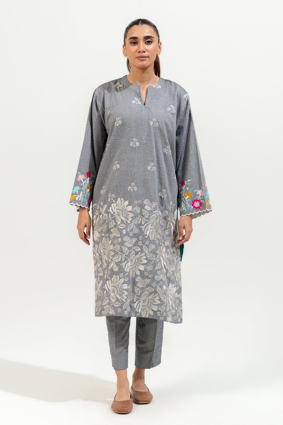 description: embroidered shirt with round neckline and slit, all over embroidery on front and sleeves with contrasting facing detail. paired with straight pants to complete the look. fabric: karandi what you'll get: shirt+pant fit: casual fit size & fit: model height is 5'6" model is wearing 8 size