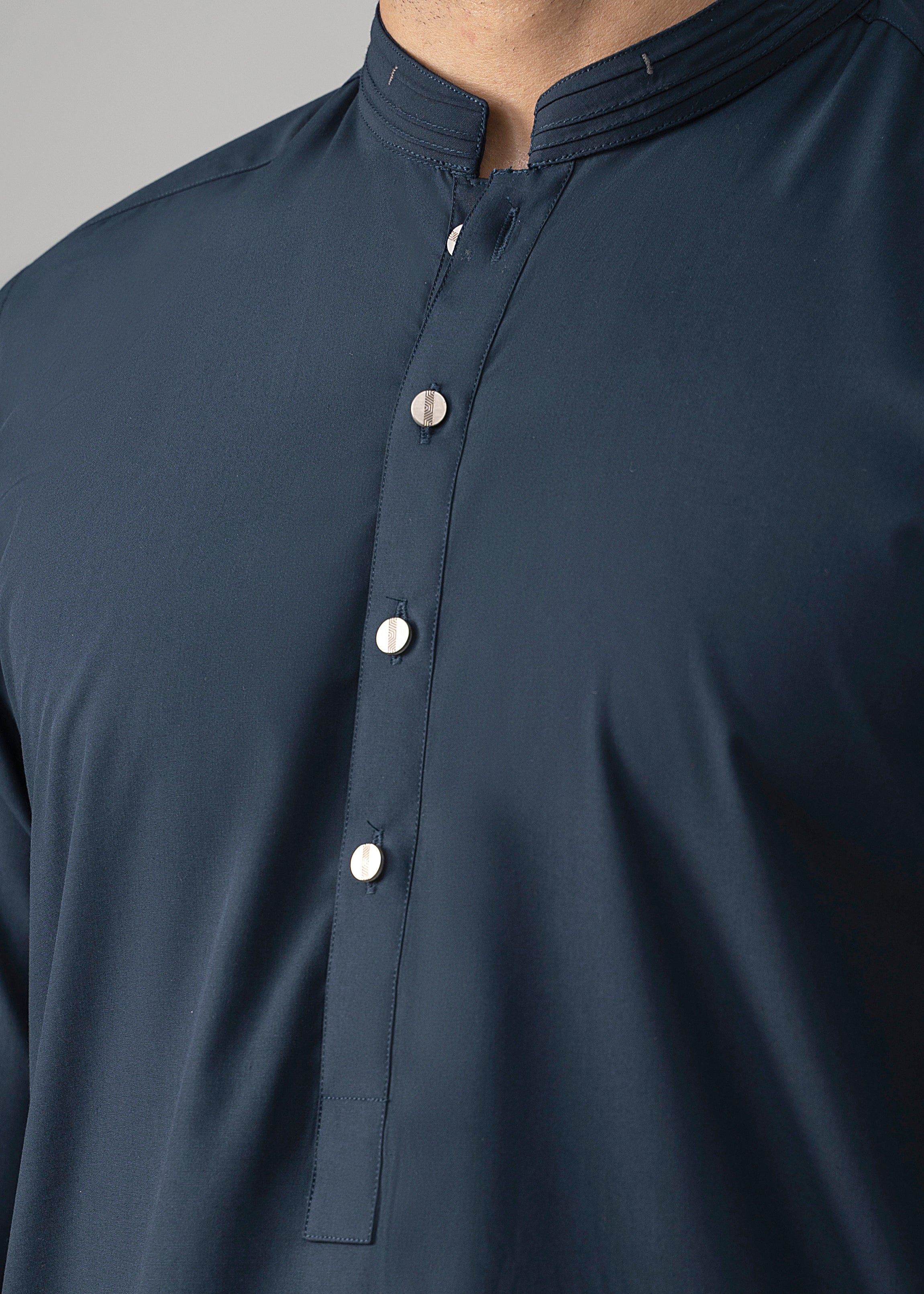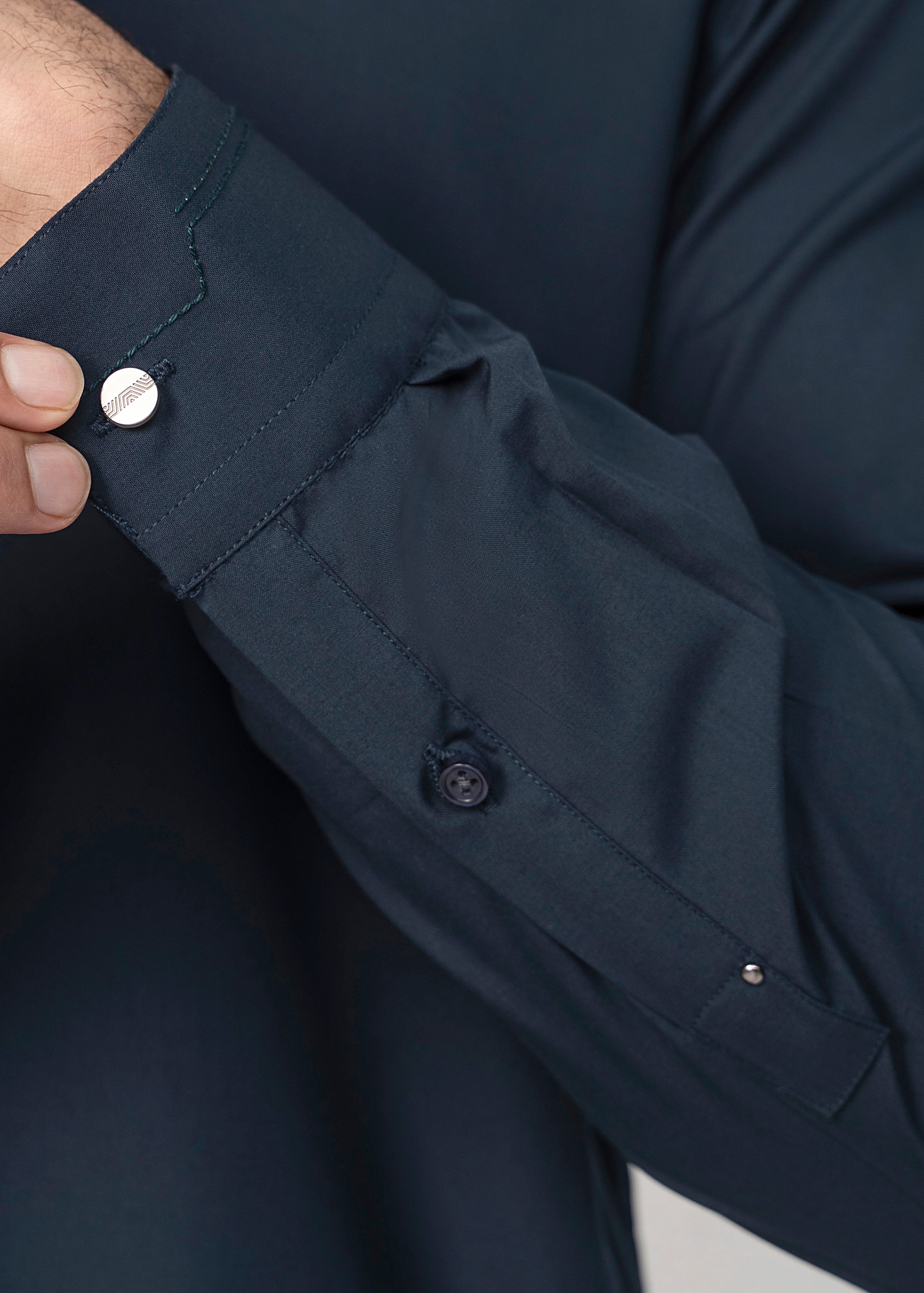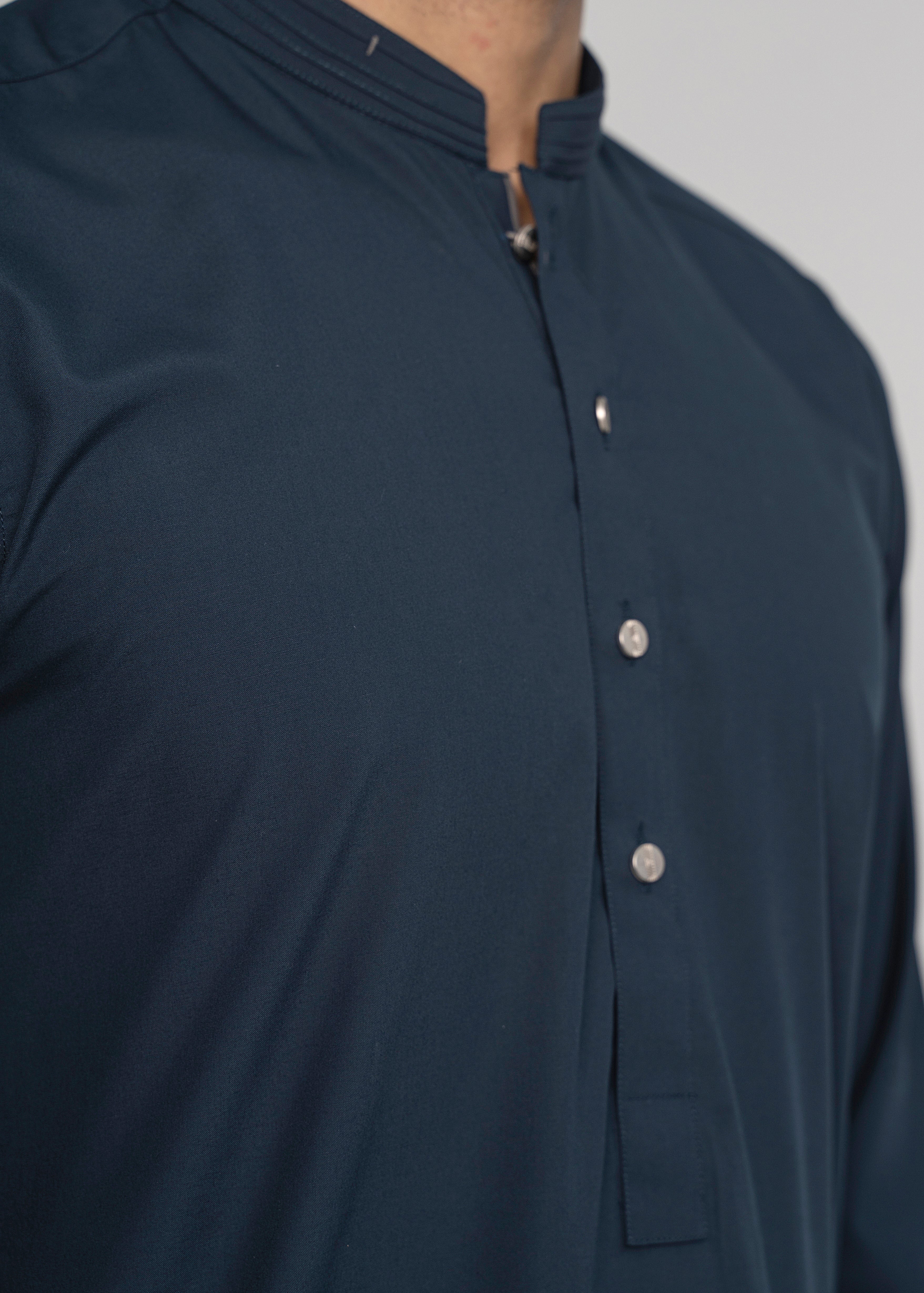 this fabric is the amalgamation of the two finest fibers of polyester and viscose. it has timeless appeal and versatile drape. this graceful cloth is available in beautiful dusky dark hues which are absolutely perfect for this winter season. mandarin ban stitching and bar-tack details on ban visible placket straight cuff stitching details on cuff straight hem special buttons premium blended fabric
