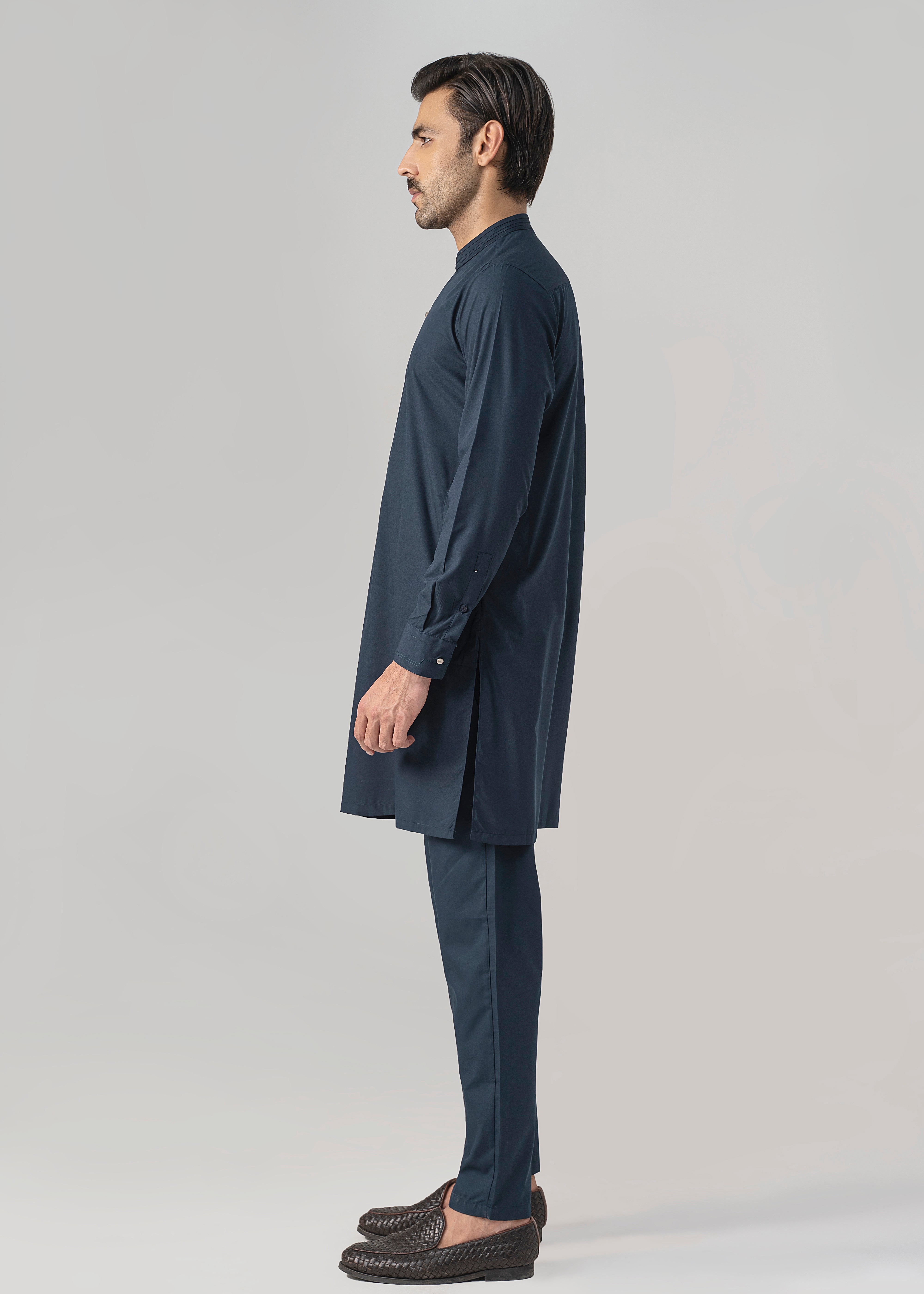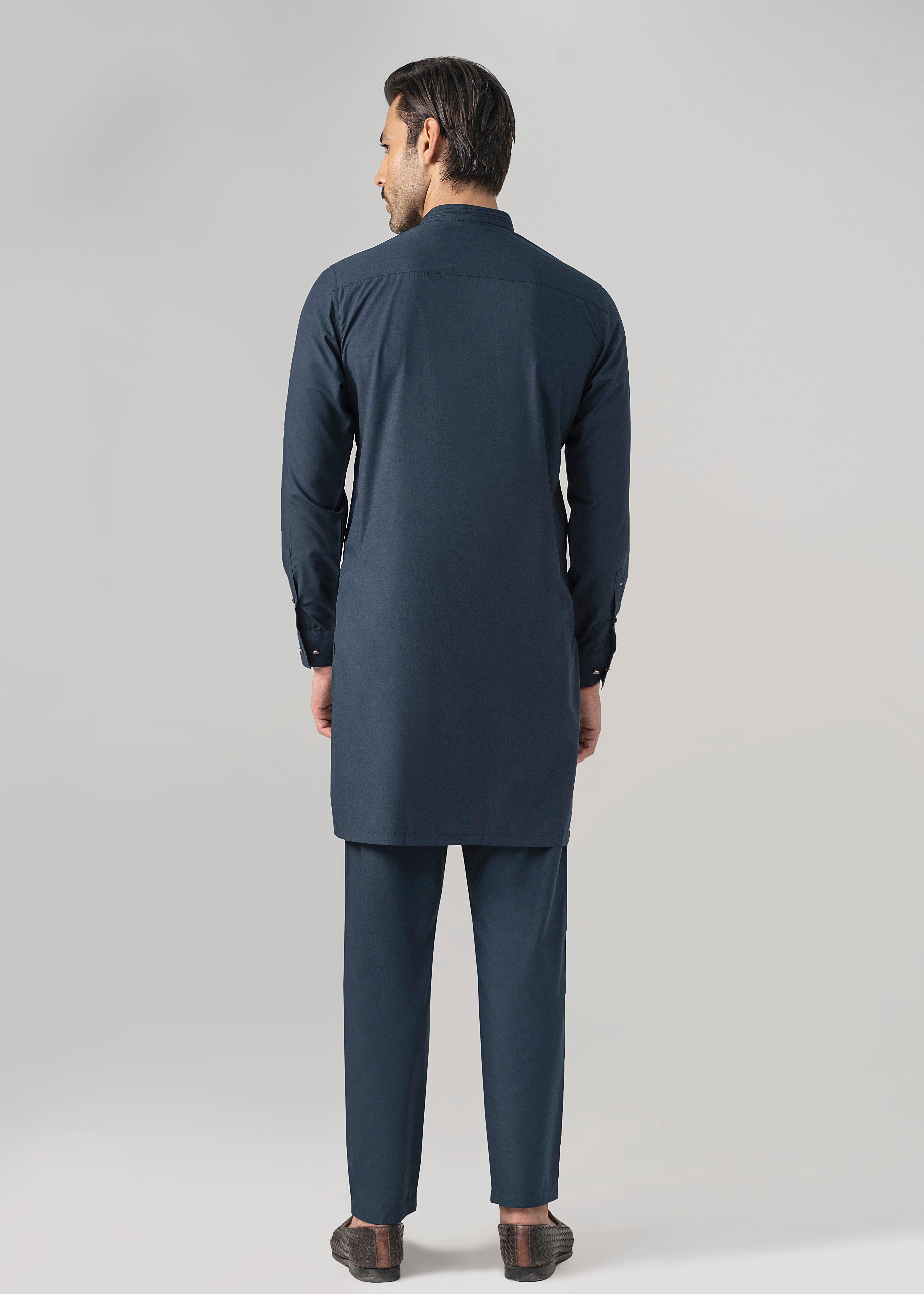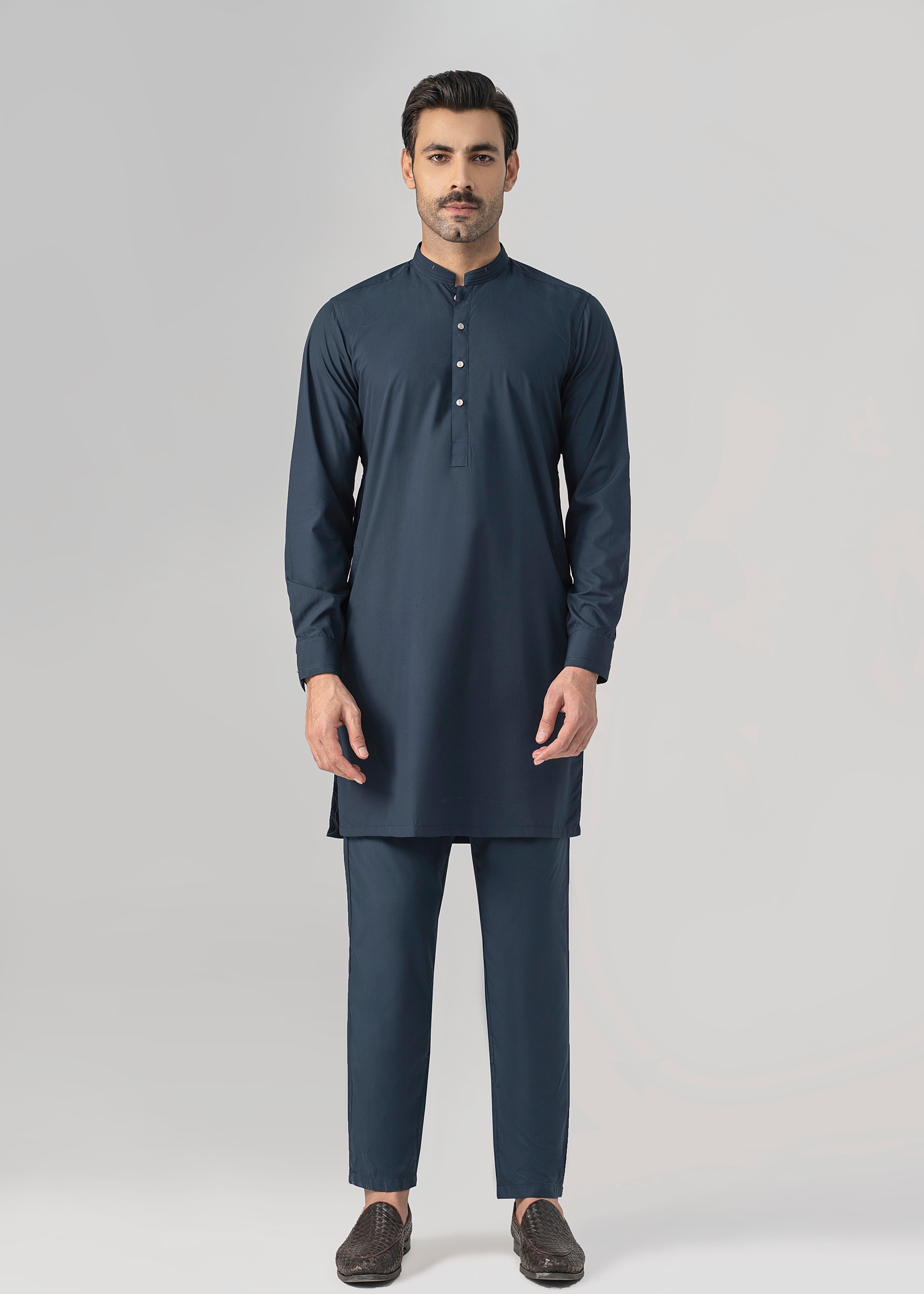 this fabric is the amalgamation of the two finest fibers of polyester and viscose. it has timeless appeal and versatile drape. this graceful cloth is available in beautiful dusky dark hues which are absolutely perfect for this winter season. mandarin ban stitching and bar-tack details on ban visible placket straight cuff stitching details on cuff straight hem special buttons premium blended fabric
