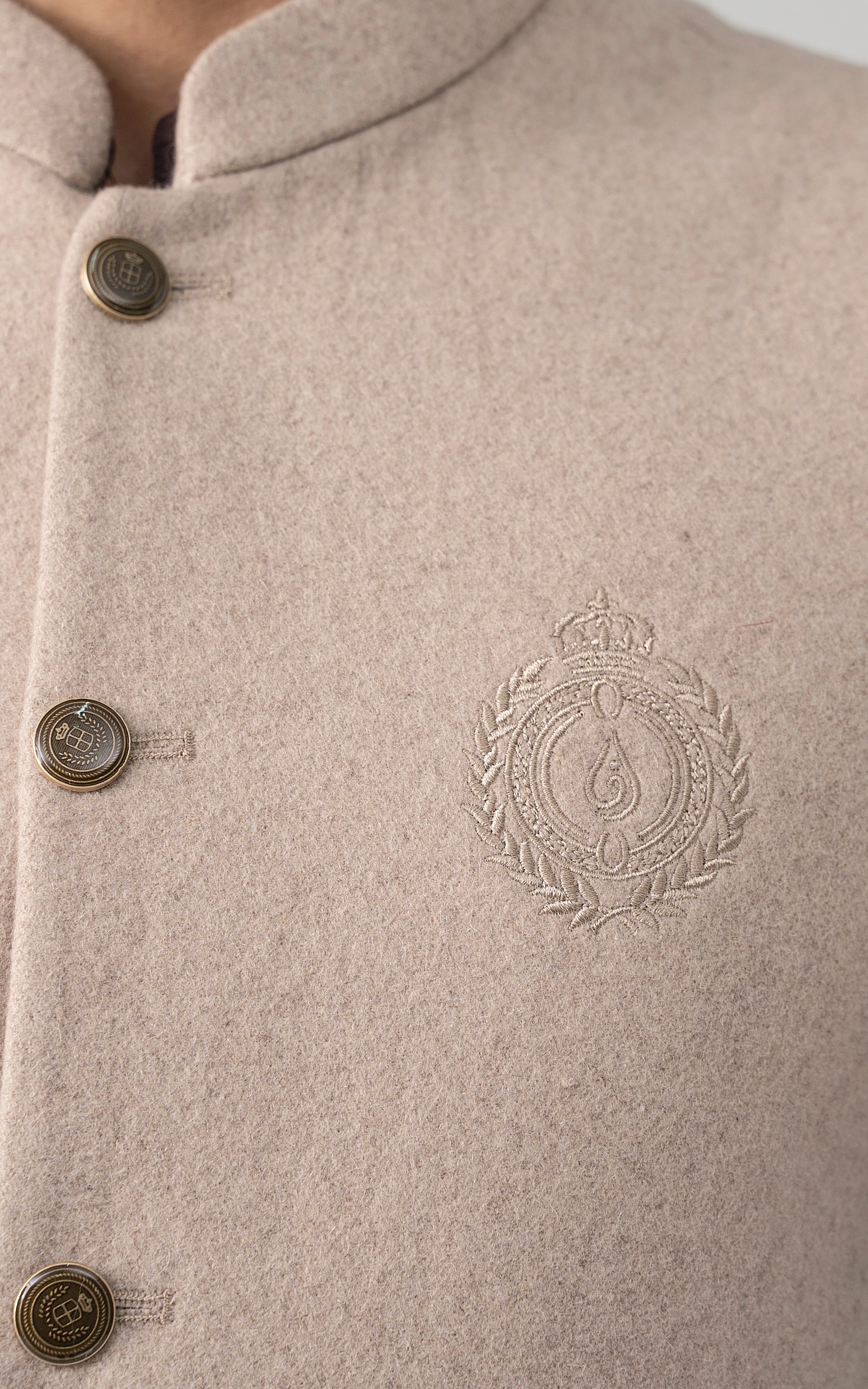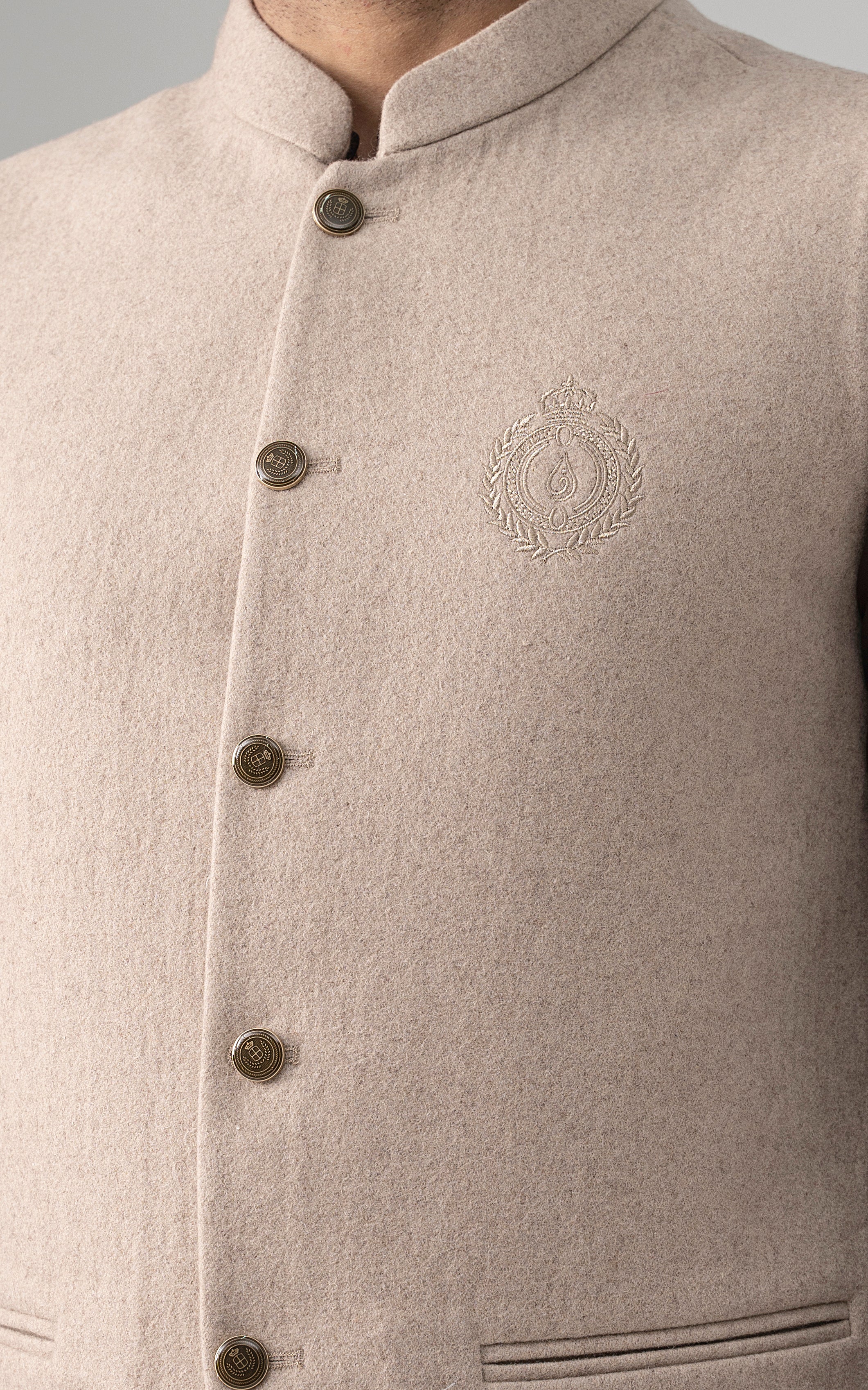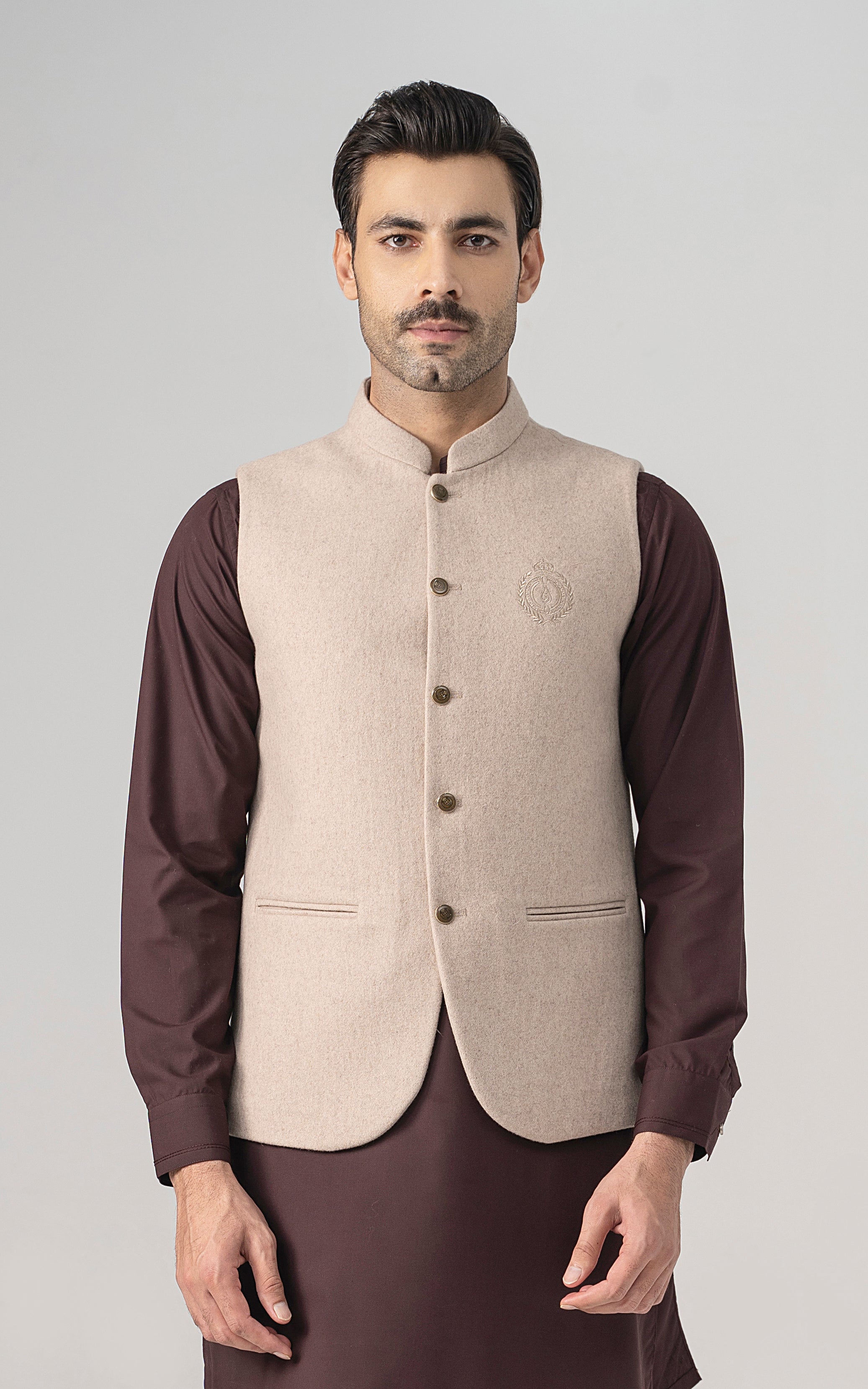 this woolen waistcoat with dtm signature embroidery is crafted with precision from luxurious wool. it includes mix of light and dark hues can be stylized with: the kurta-trouser suit or the classic shalwar kameez and the frontier shoe. round ban, signature logo embroidery on front double bone pockets on front visible placket full contrast lining inside round hem special buttons blended woolen waistcoat