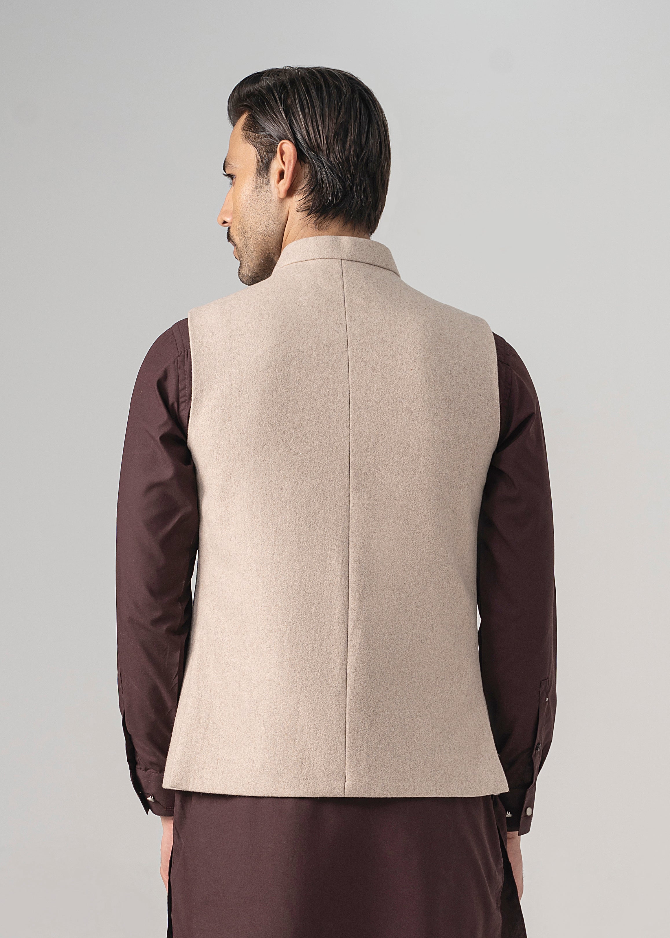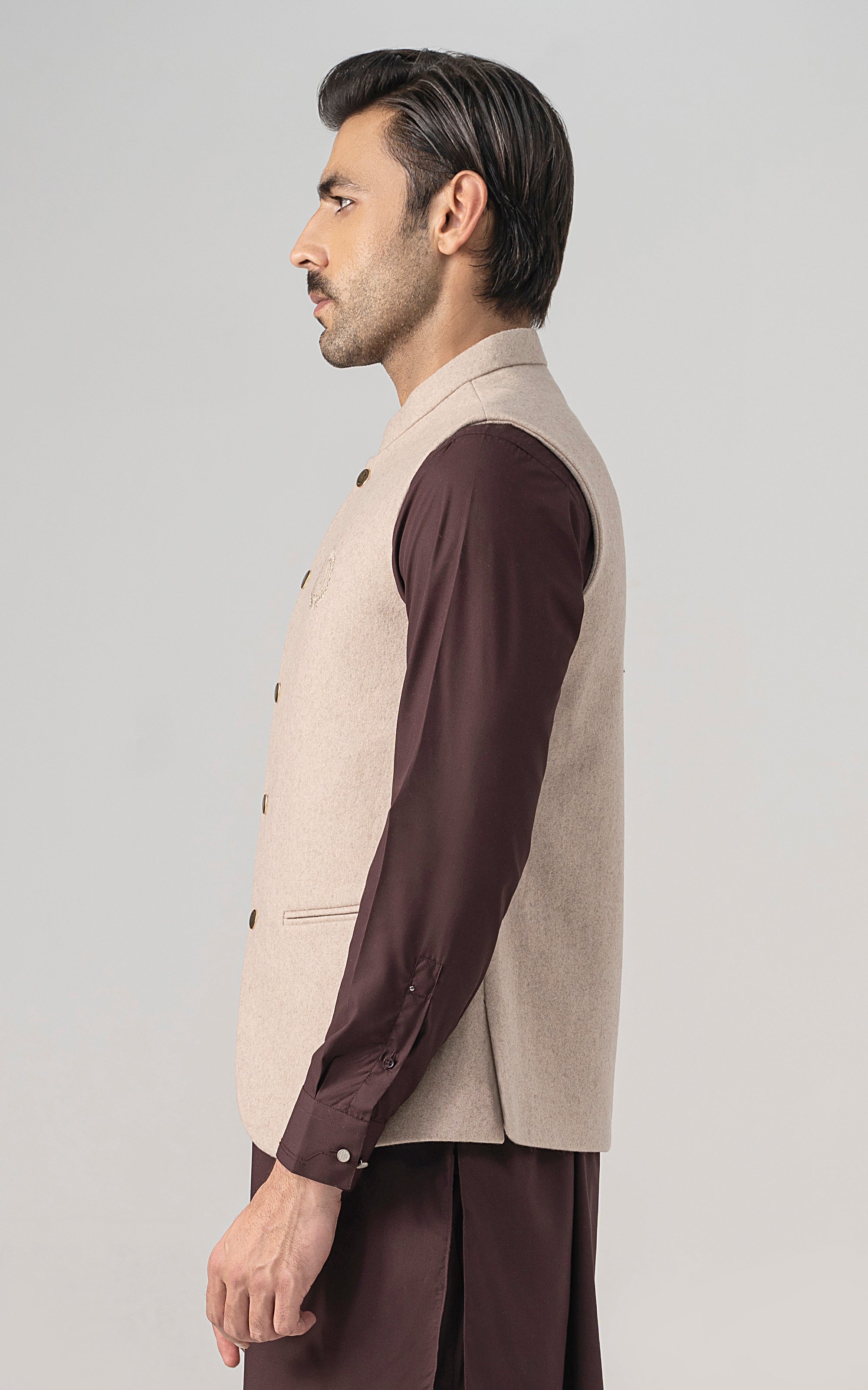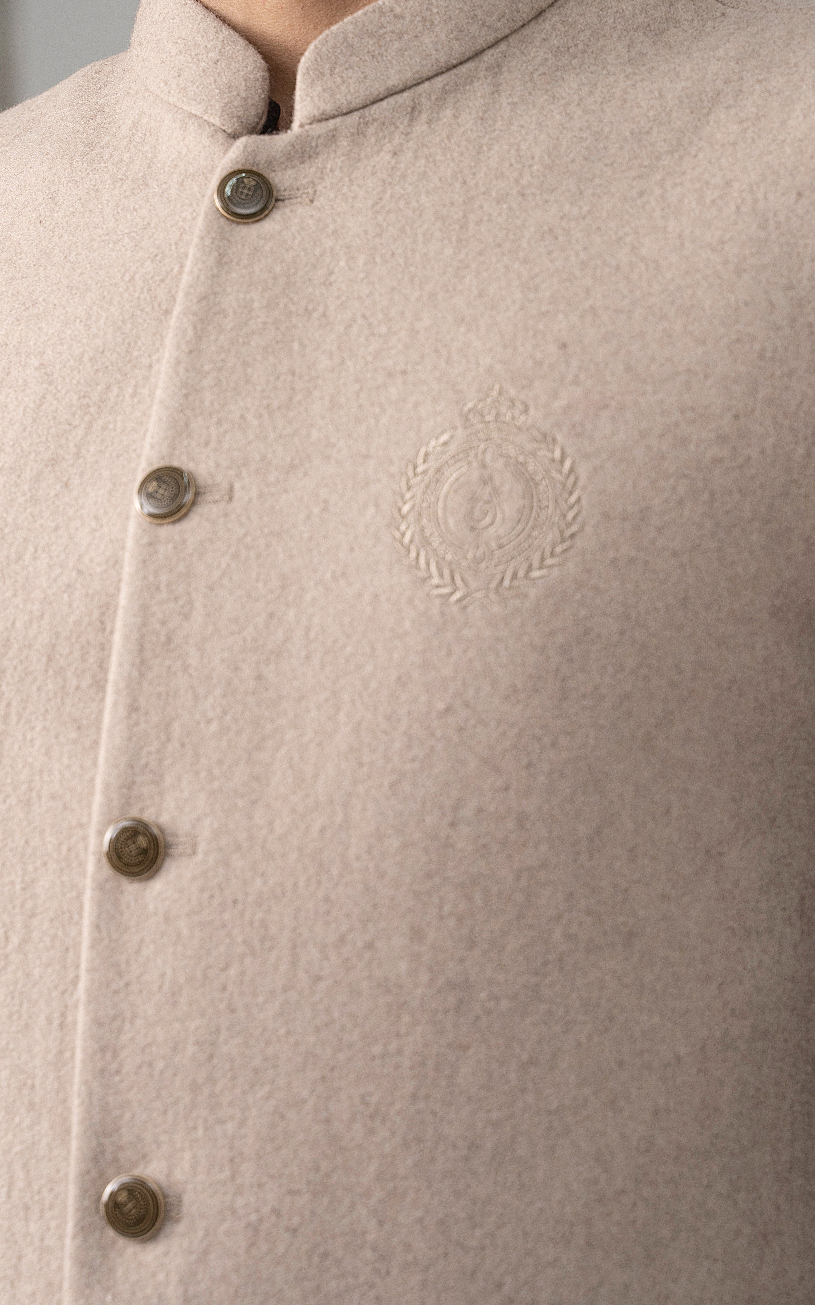 this woolen waistcoat with dtm signature embroidery is crafted with precision from luxurious wool. it includes mix of light and dark hues can be stylized with: the kurta-trouser suit or the classic shalwar kameez and the frontier shoe. round ban, signature logo embroidery on front double bone pockets on front visible placket full contrast lining inside round hem special buttons blended woolen waistcoat