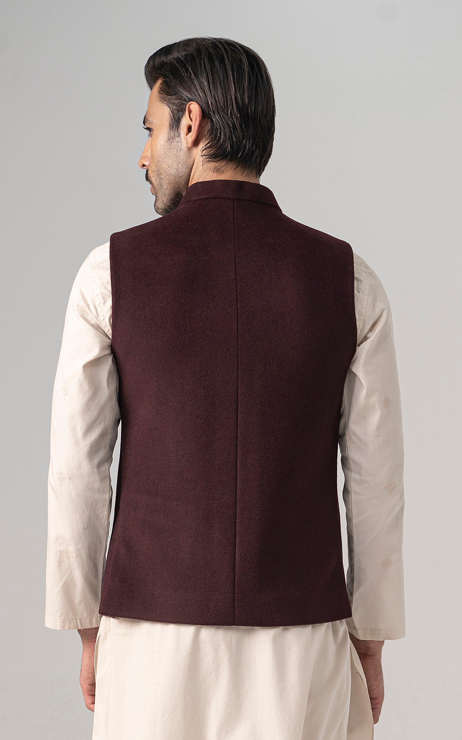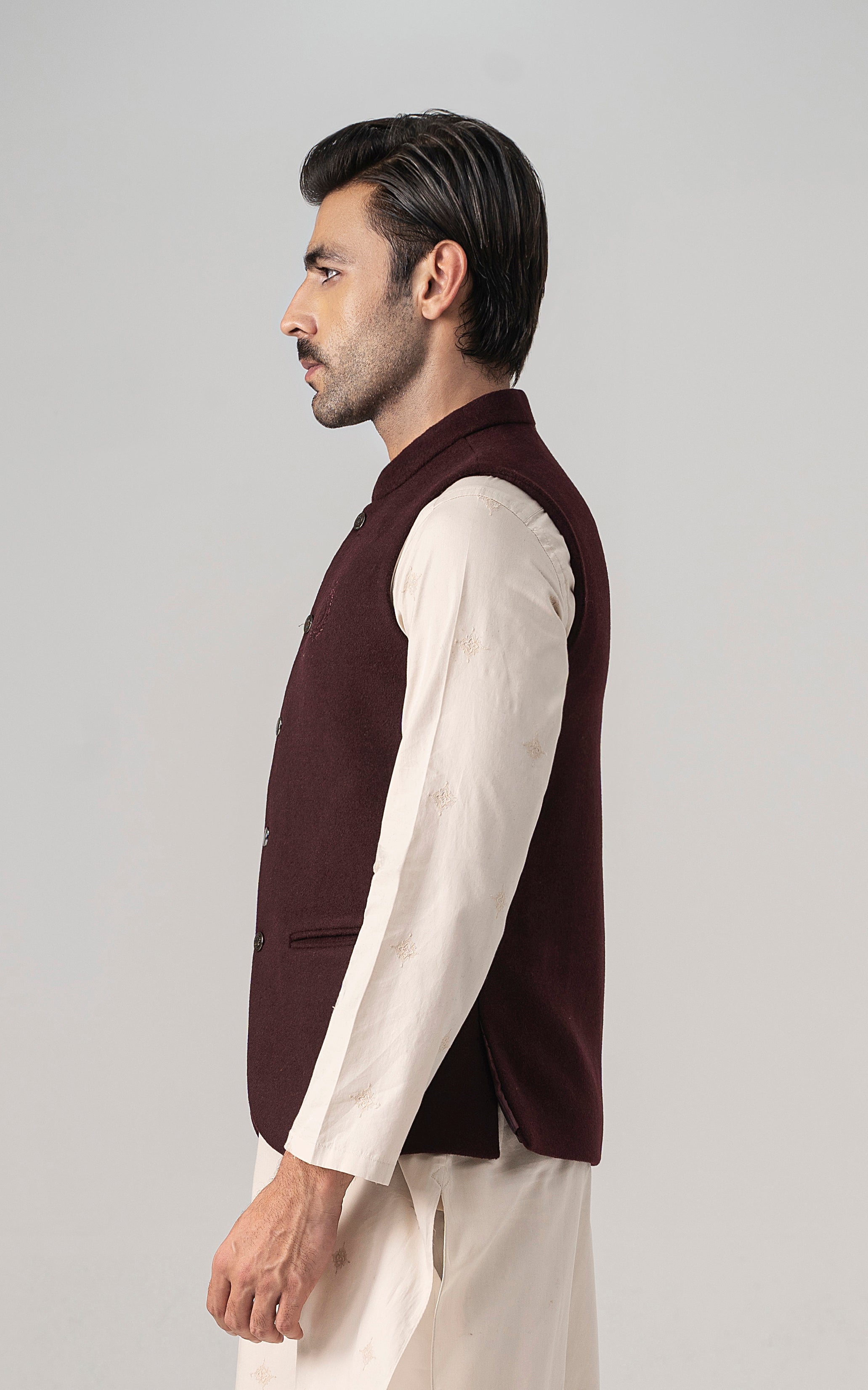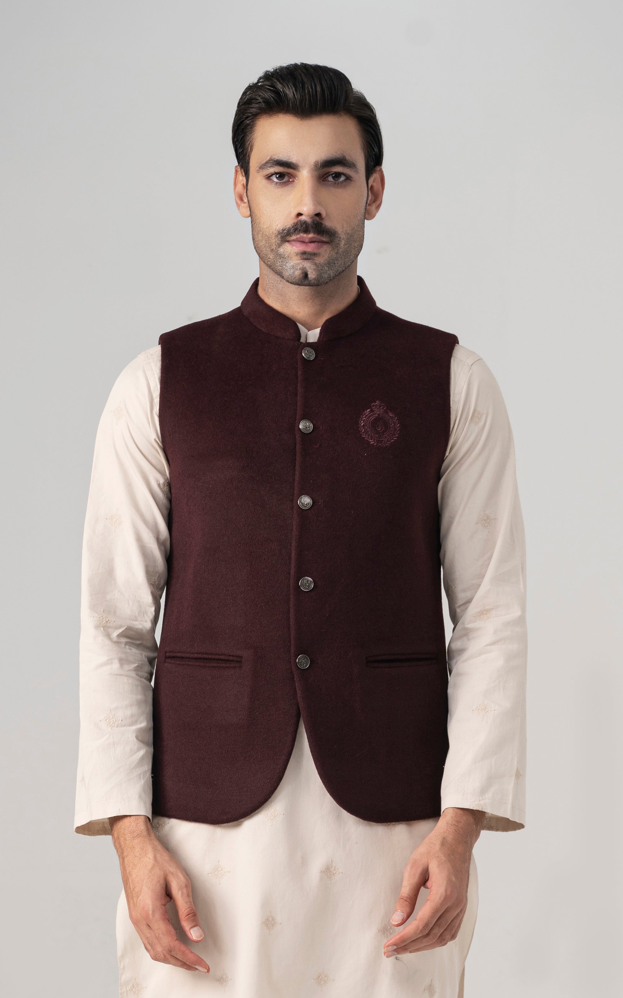 this woolen waistcoat with dtm signature embroidery is crafted with precision from luxurious wool. it includes mix of light and dark hues can be stylized with: the kurta-trouser suit or the classic shalwar kameez and the frontier shoe. round ban, signature logo embroidery on front double bone pockets on front visible placket full contrast lining inside round hem special buttons blended woolen waistcoat