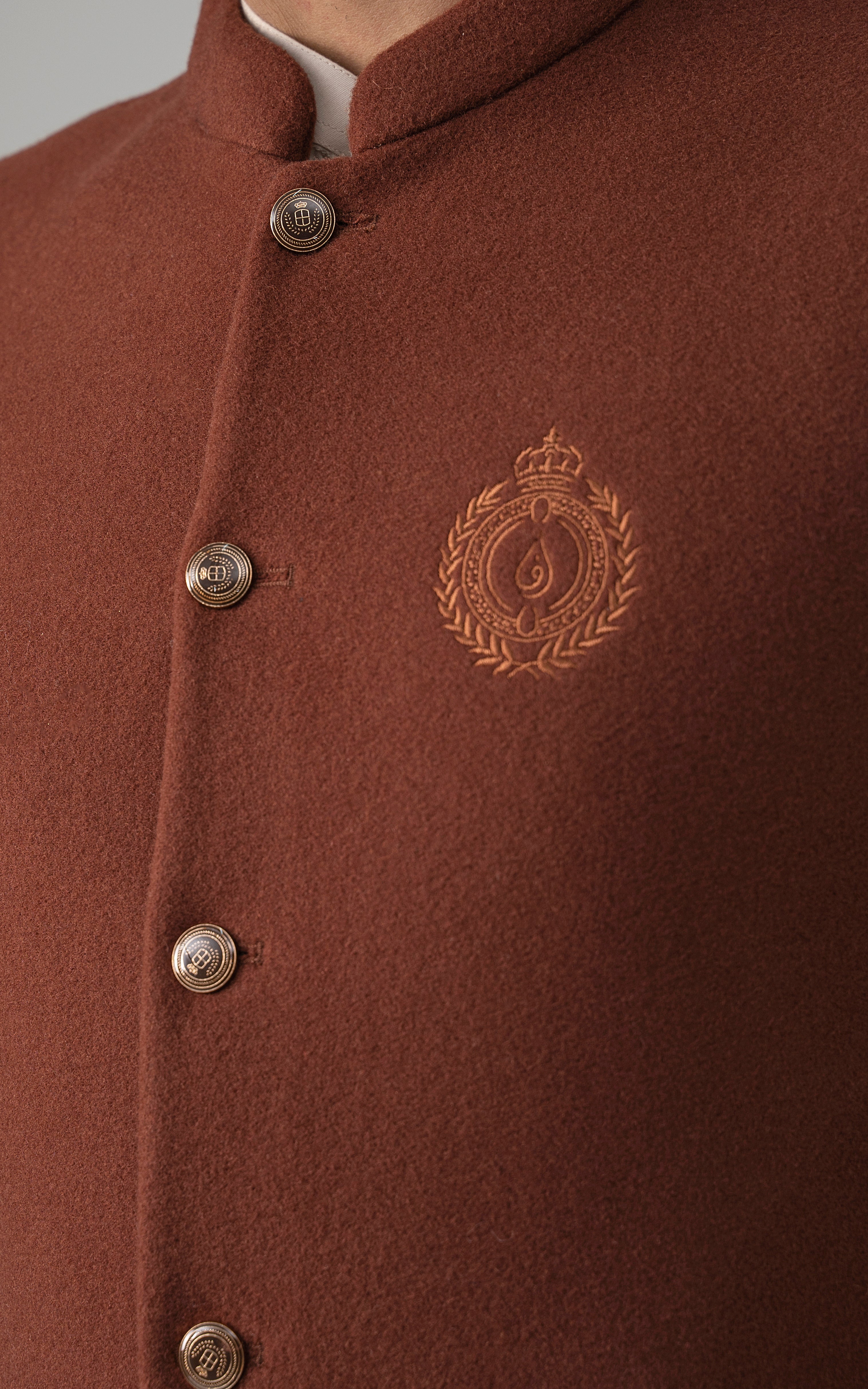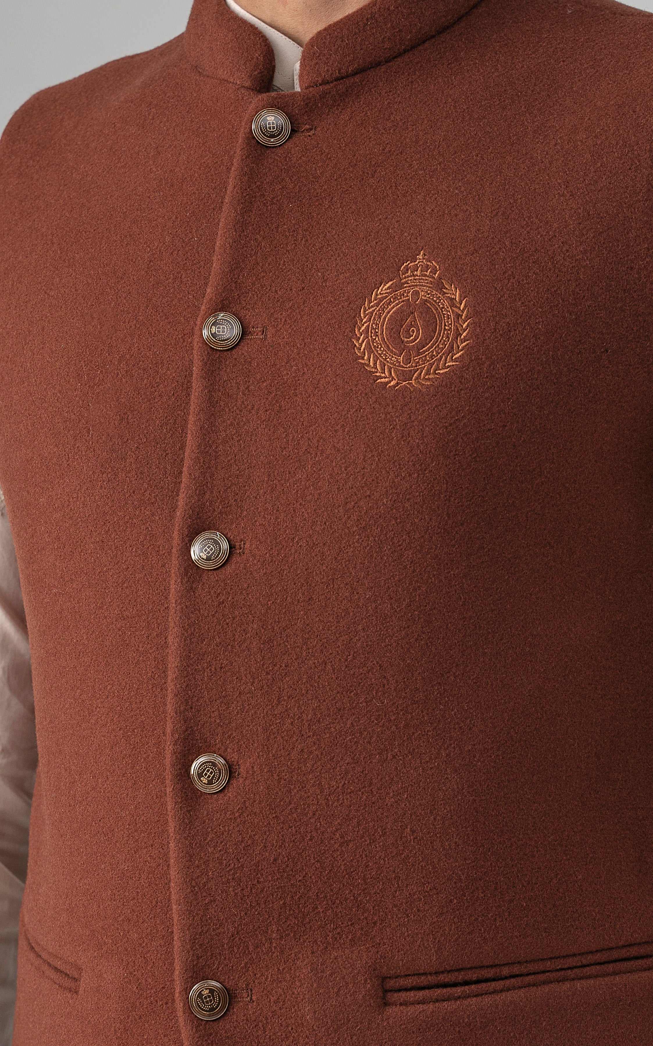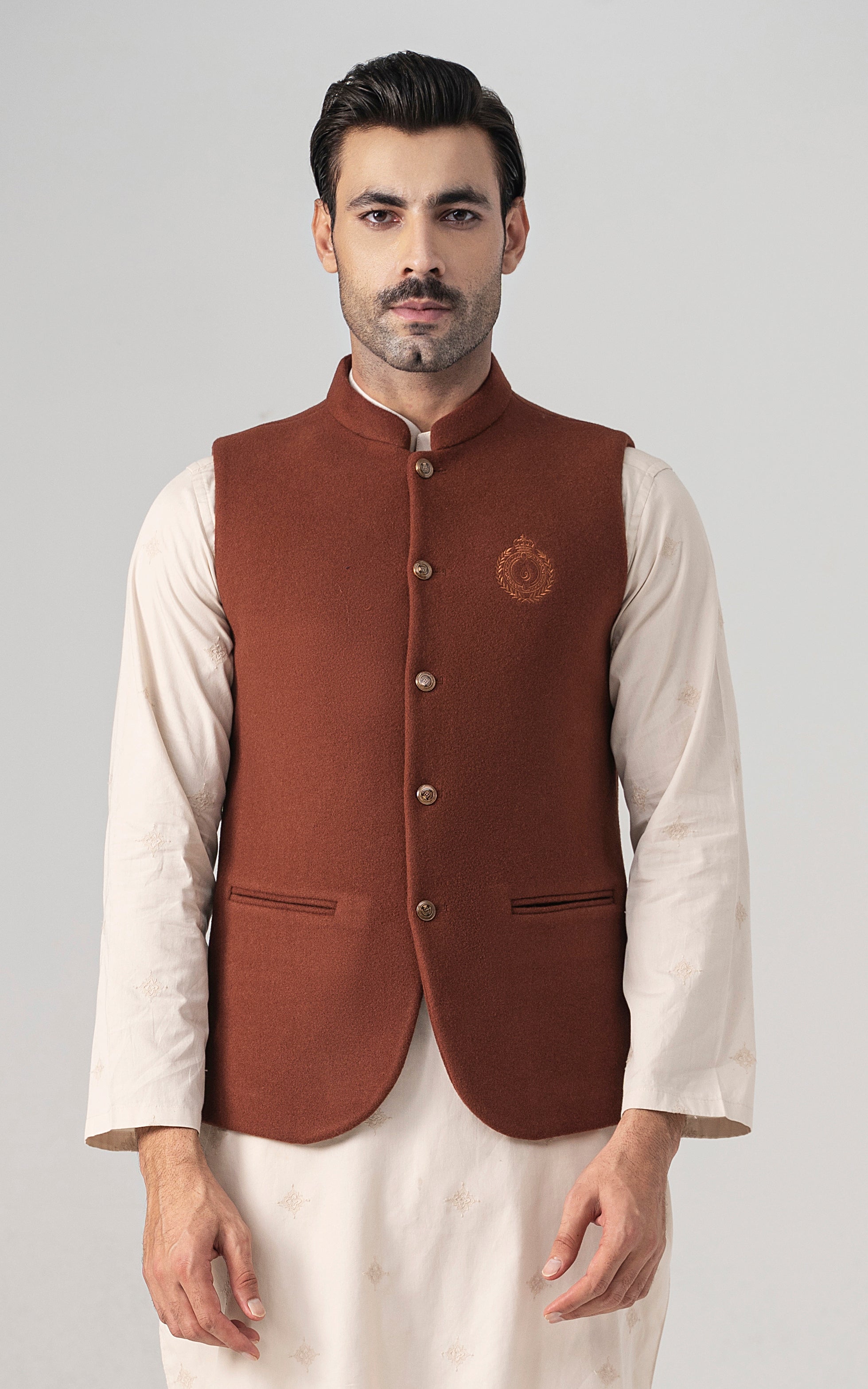 this woolen waistcoat with dtm signature embroidery is crafted with precision from luxurious wool. it includes mix of light and dark hues can be stylized with: the kurta-trouser suit or the classic shalwar kameez and the frontier shoe. round ban, signature logo embroidery on front double bone pockets on front visible placket full contrast lining inside round hem special buttons blended woolen waistcoat