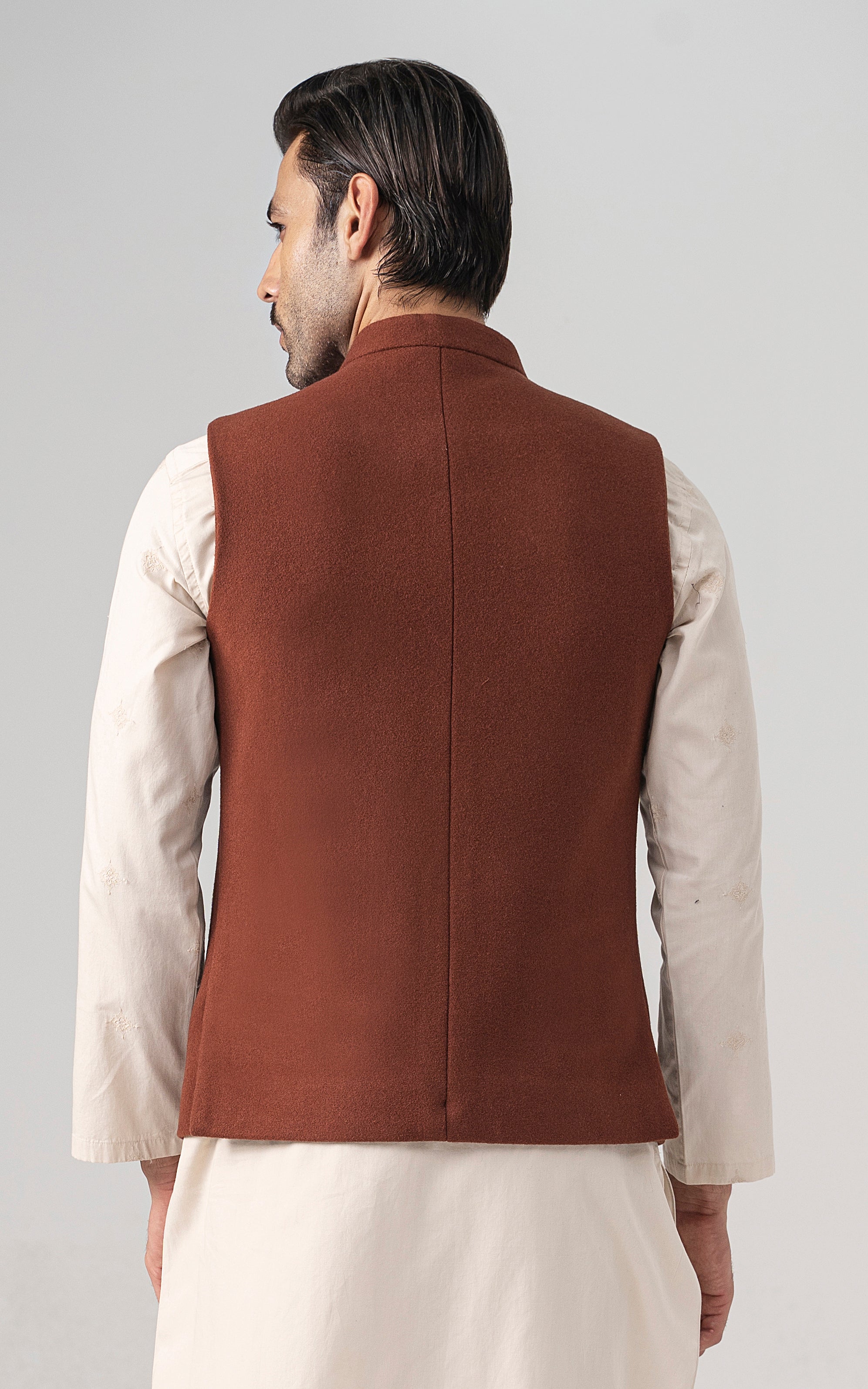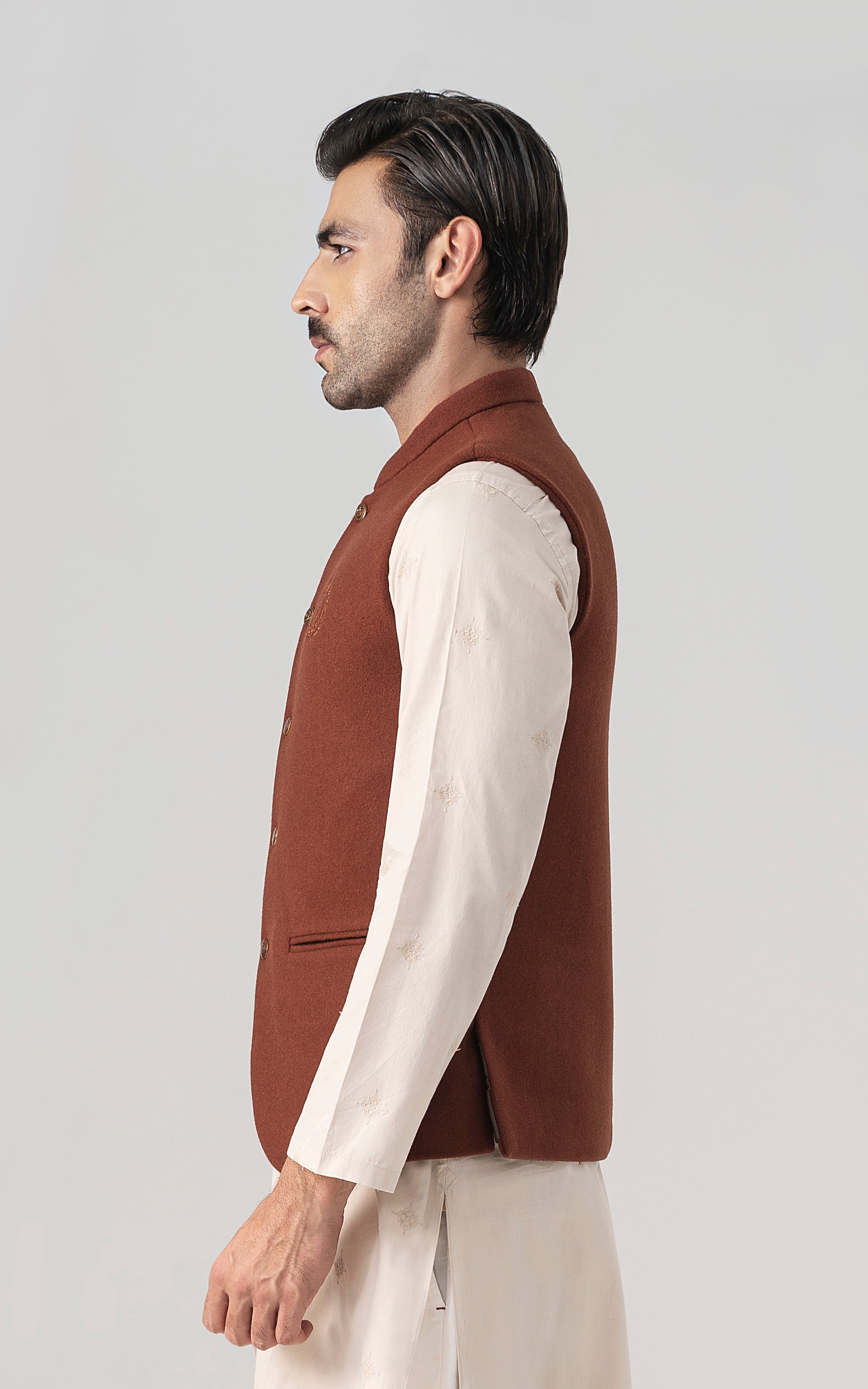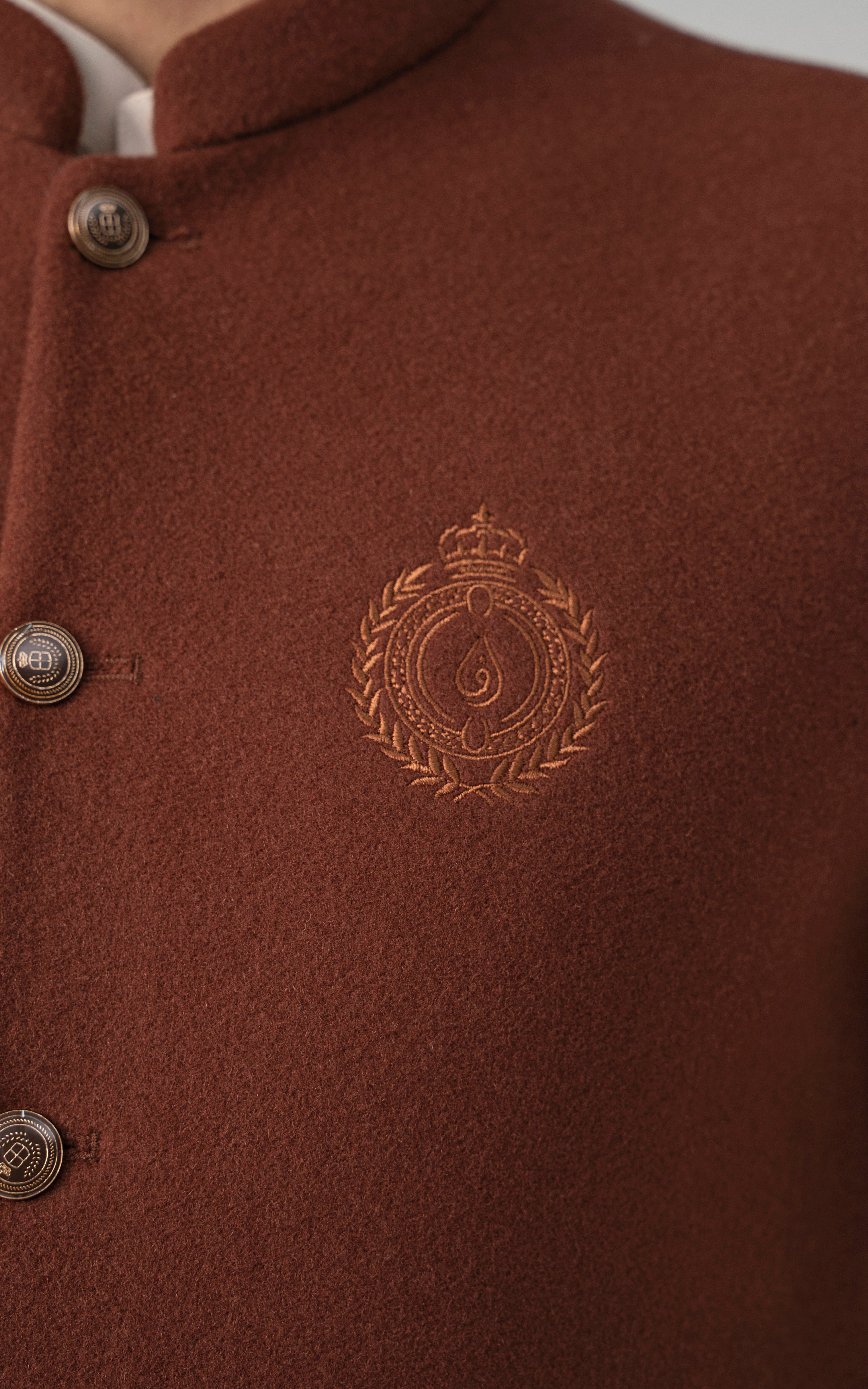 this woolen waistcoat with dtm signature embroidery is crafted with precision from luxurious wool. it includes mix of light and dark hues can be stylized with: the kurta-trouser suit or the classic shalwar kameez and the frontier shoe. round ban, signature logo embroidery on front double bone pockets on front visible placket full contrast lining inside round hem special buttons blended woolen waistcoat