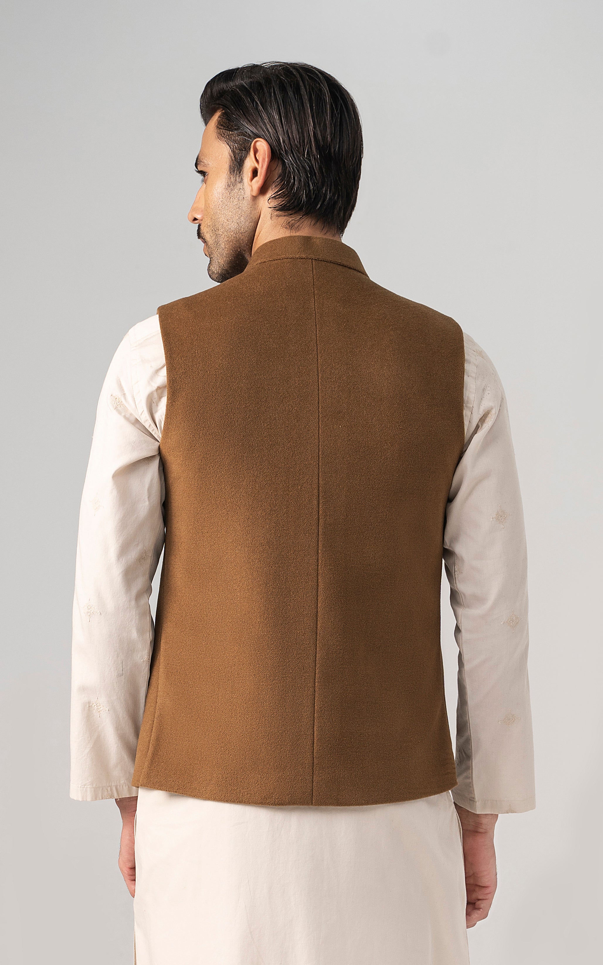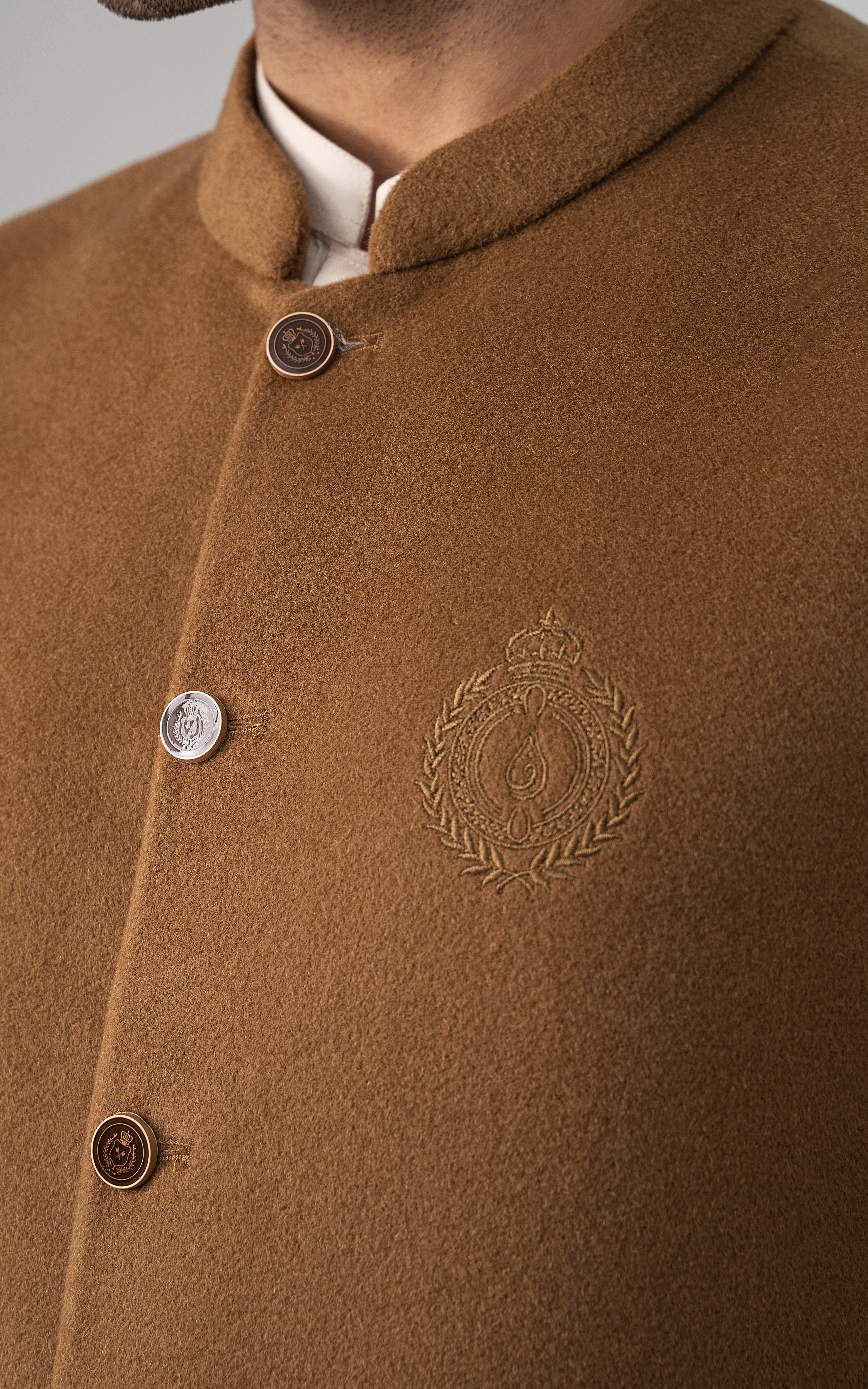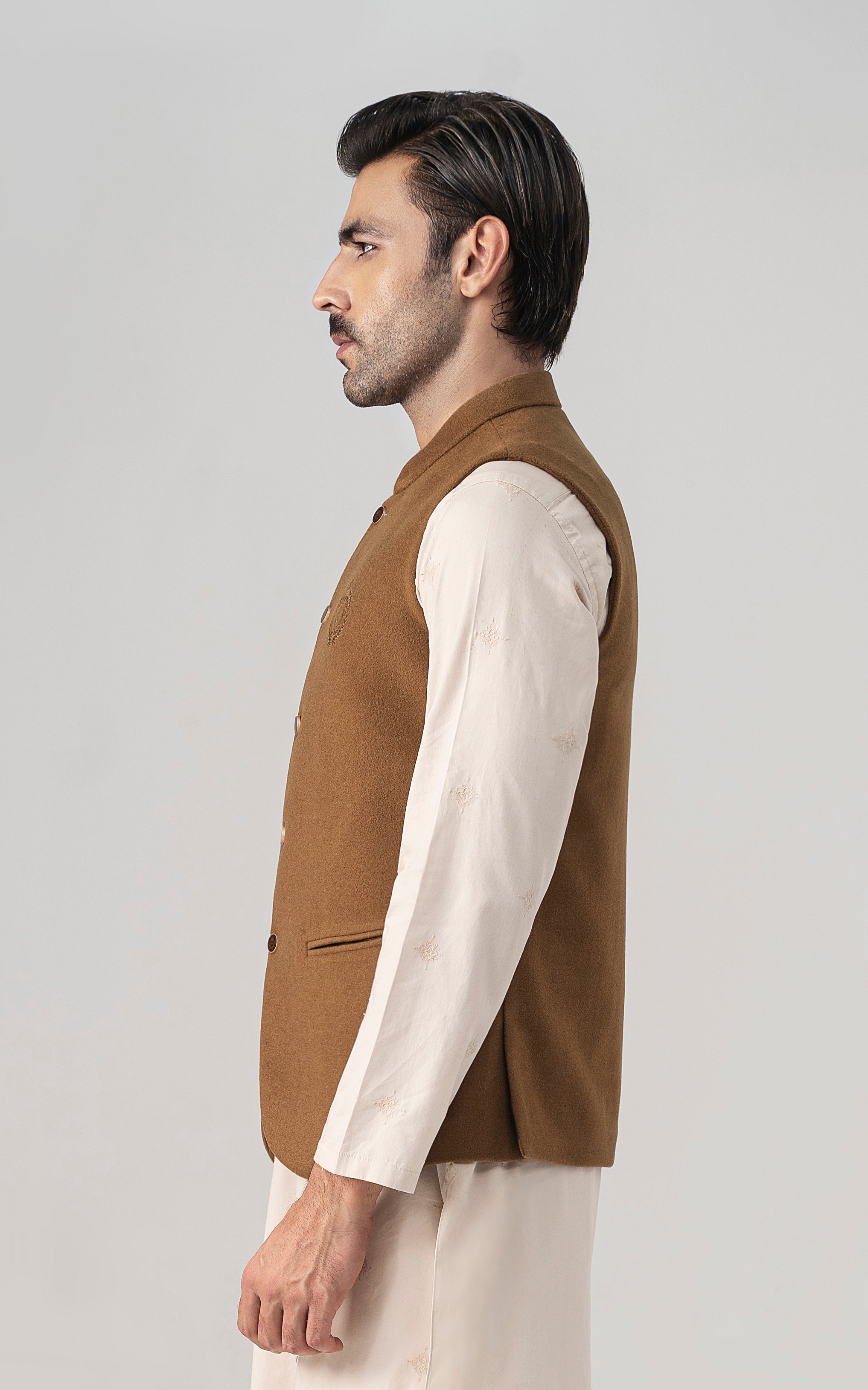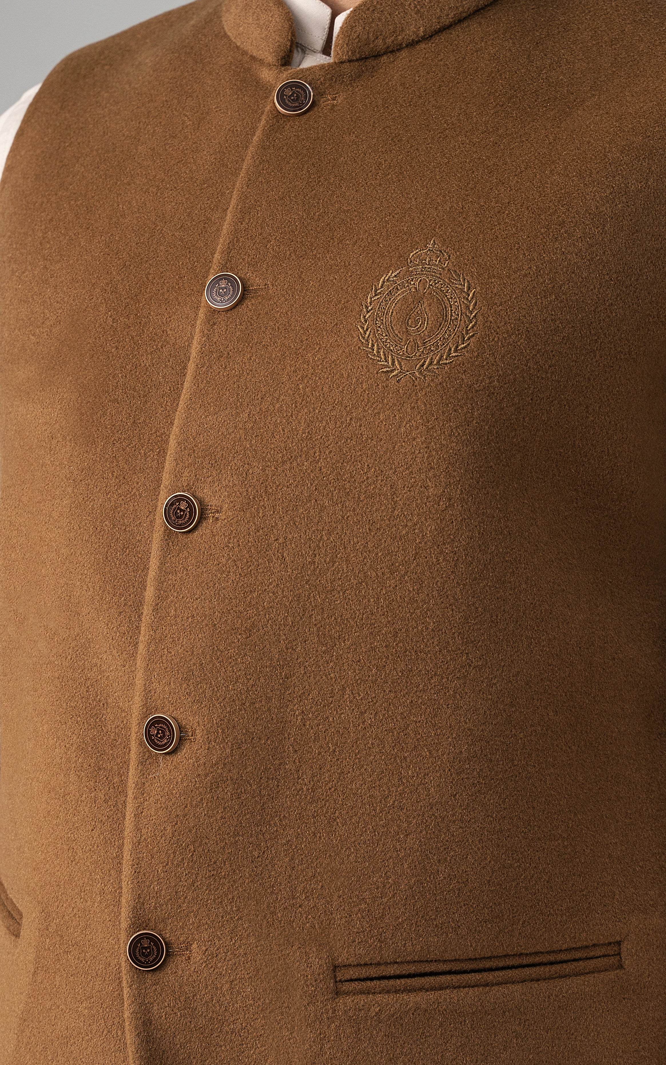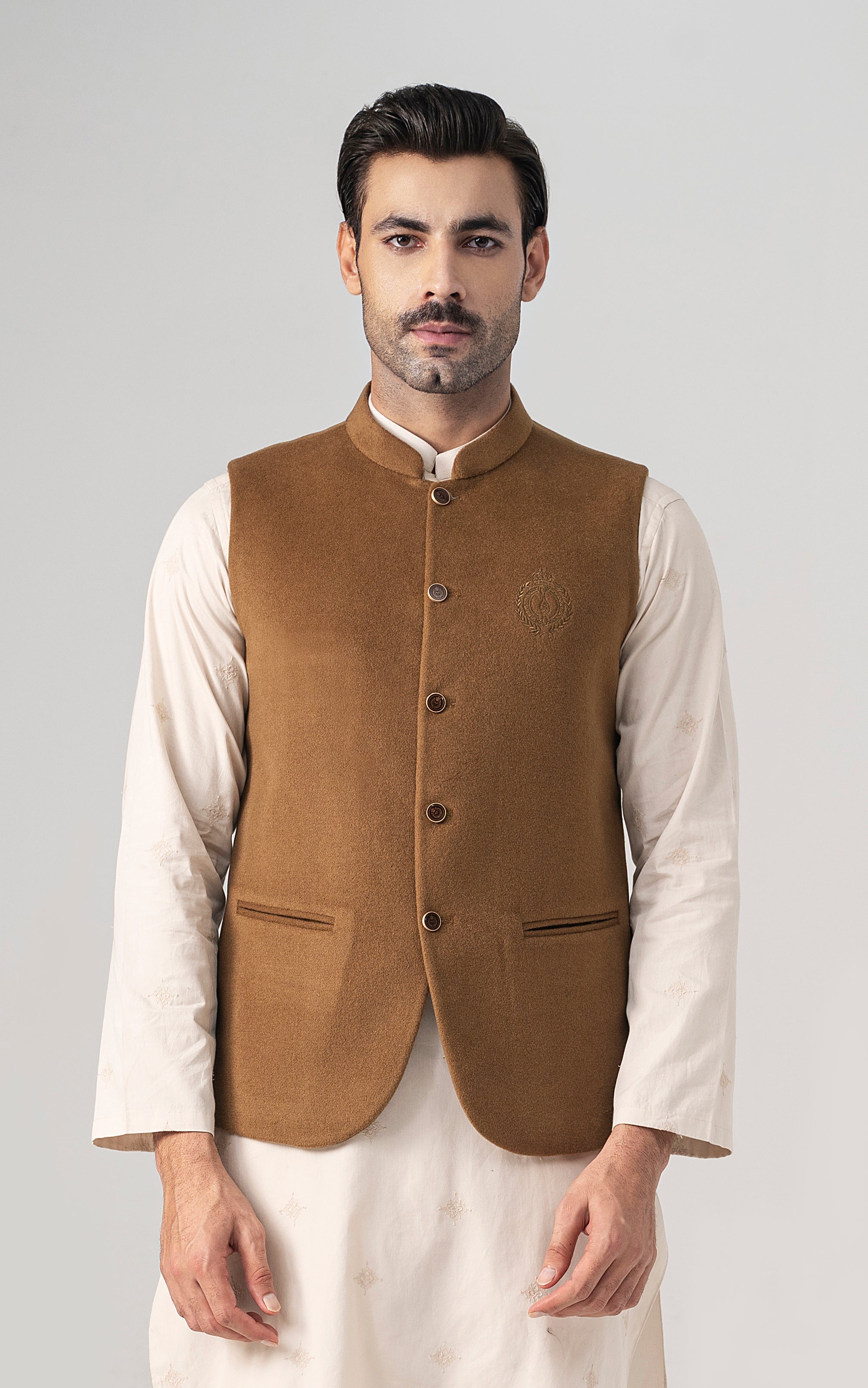 this woolen waistcoat with dtm signature embroidery is crafted with precision from luxurious wool. it includes mix of light and dark hues can be stylized with: the kurta-trouser suit or the classic shalwar kameez and the frontier shoe. round ban, signature logo embroidery on front double bone pockets on front visible placket full contrast lining inside round hem special buttons blended woolen waistcoat