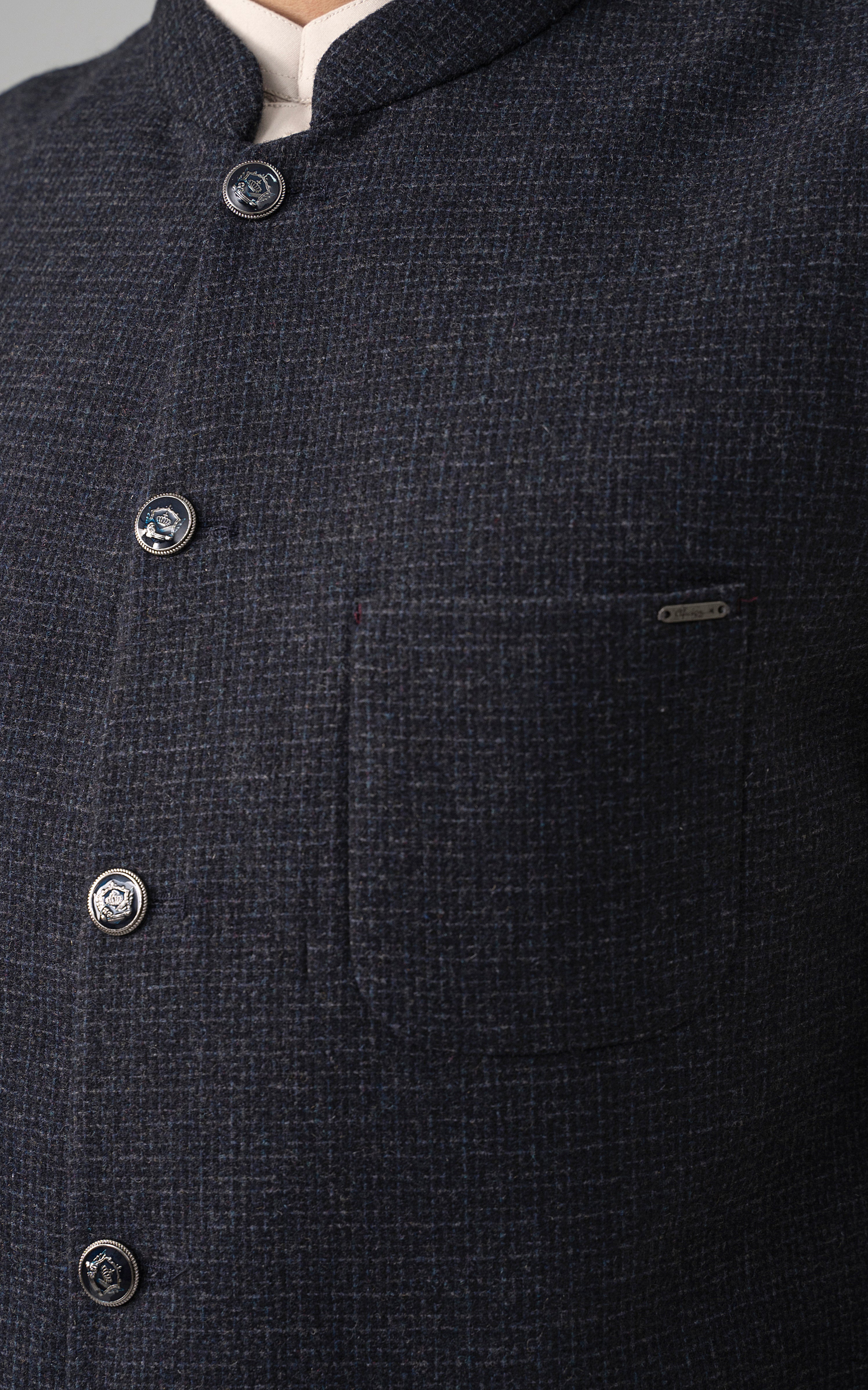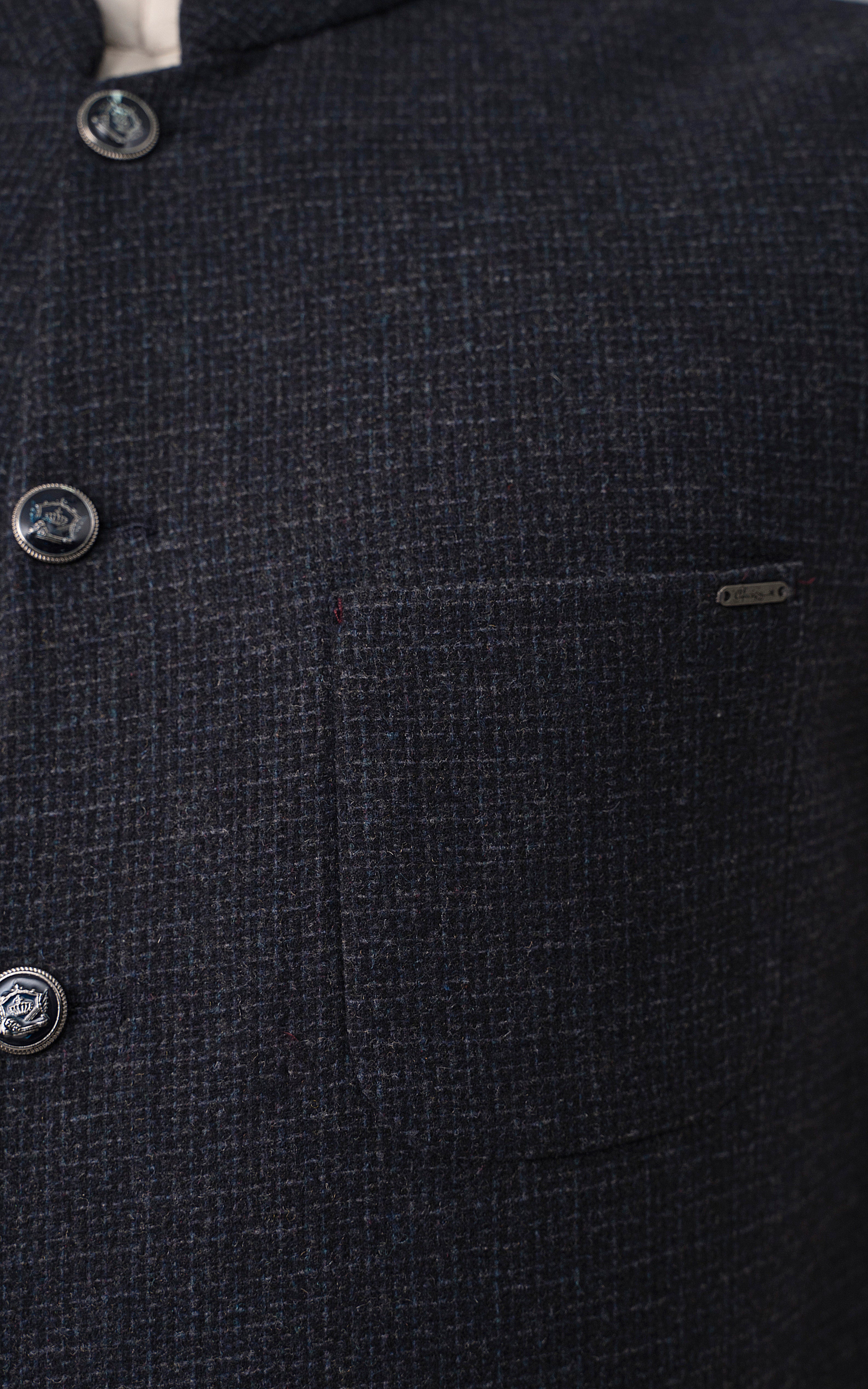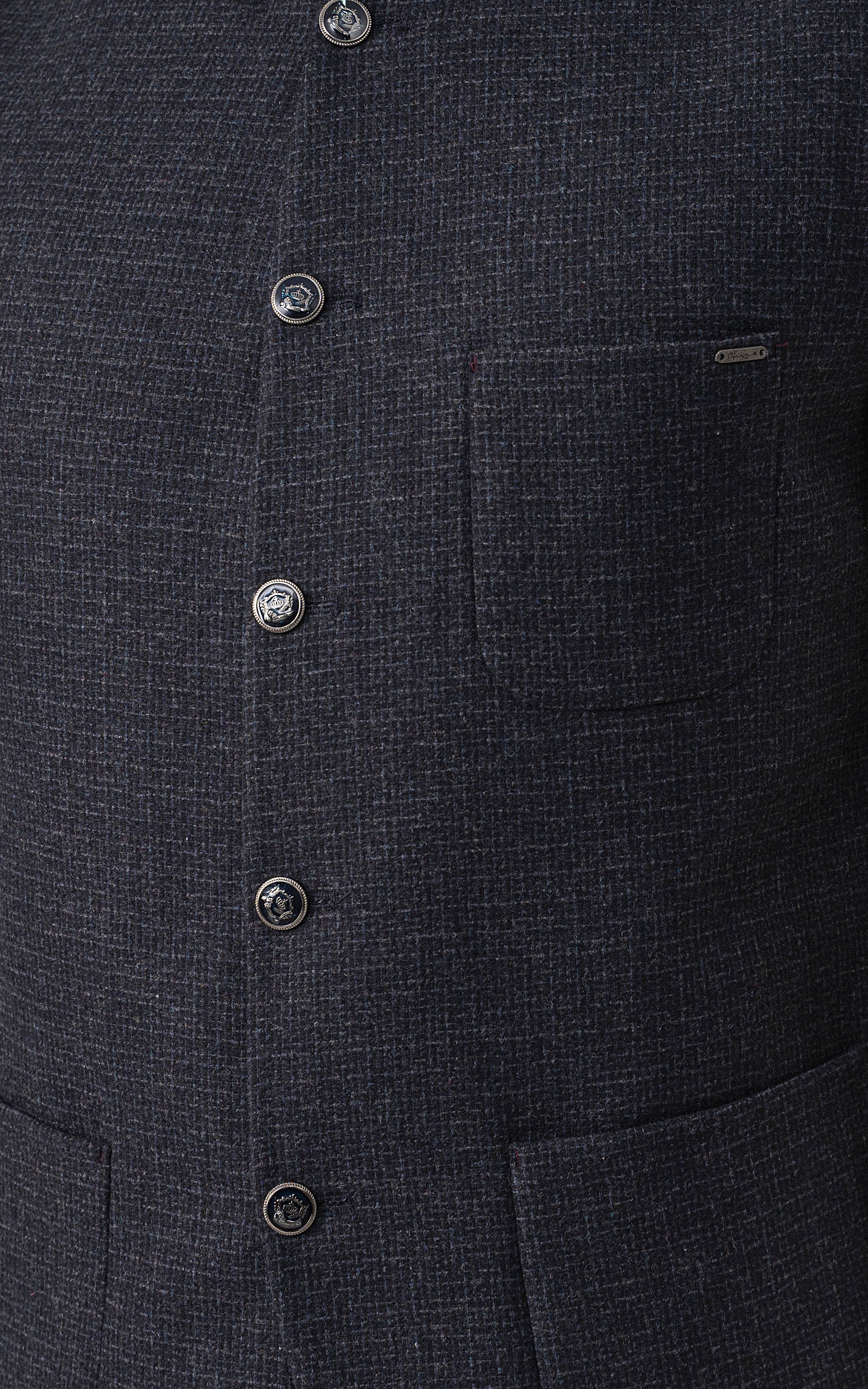 this is one of the most eminent fabric in our blended wool collection. this masterpiece is a class by itself when worn. the texture on this fabric will give you a classy look. the color palette consist of dark colors only. straight ban, upper front patch pocket with trim detail, patch pockets on front, visible placket, full contrast lining inside, round hem, special buttons, textured woolen waistcoat.