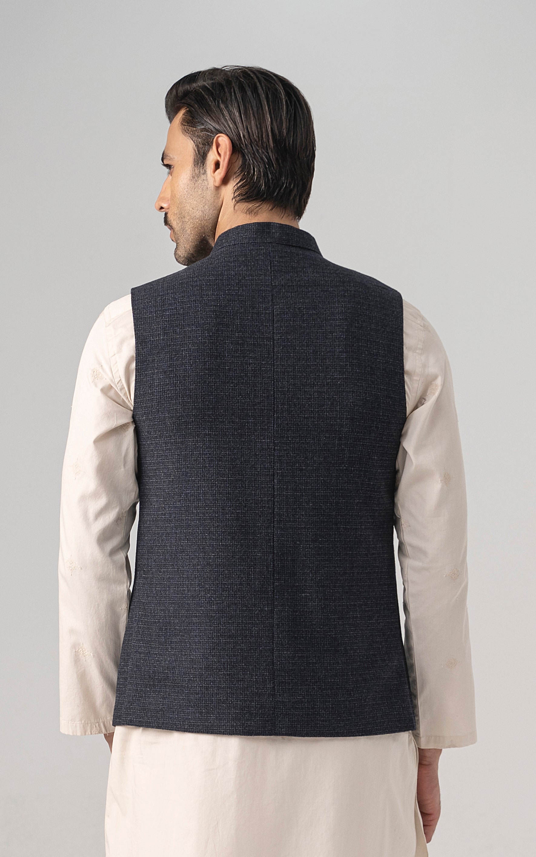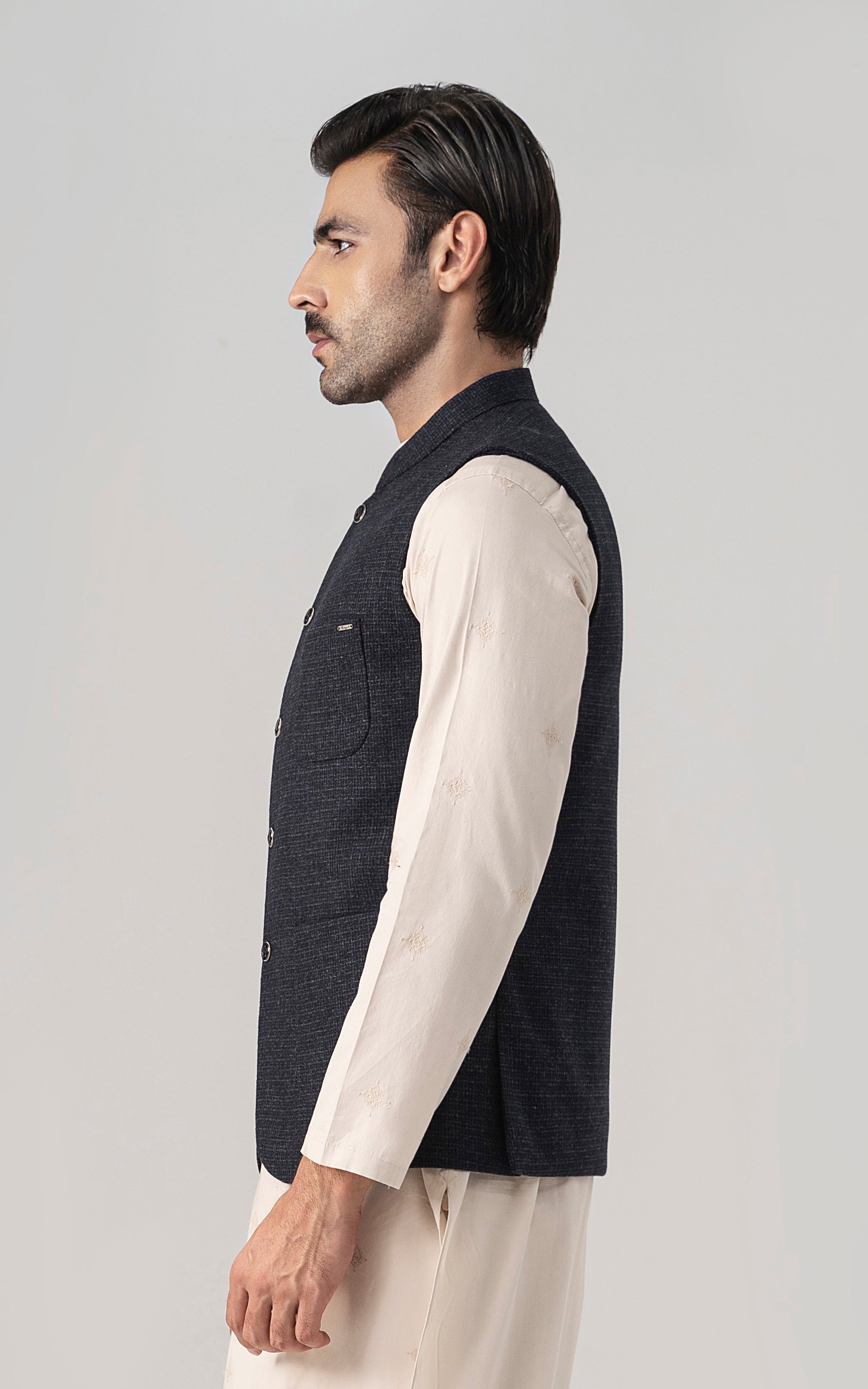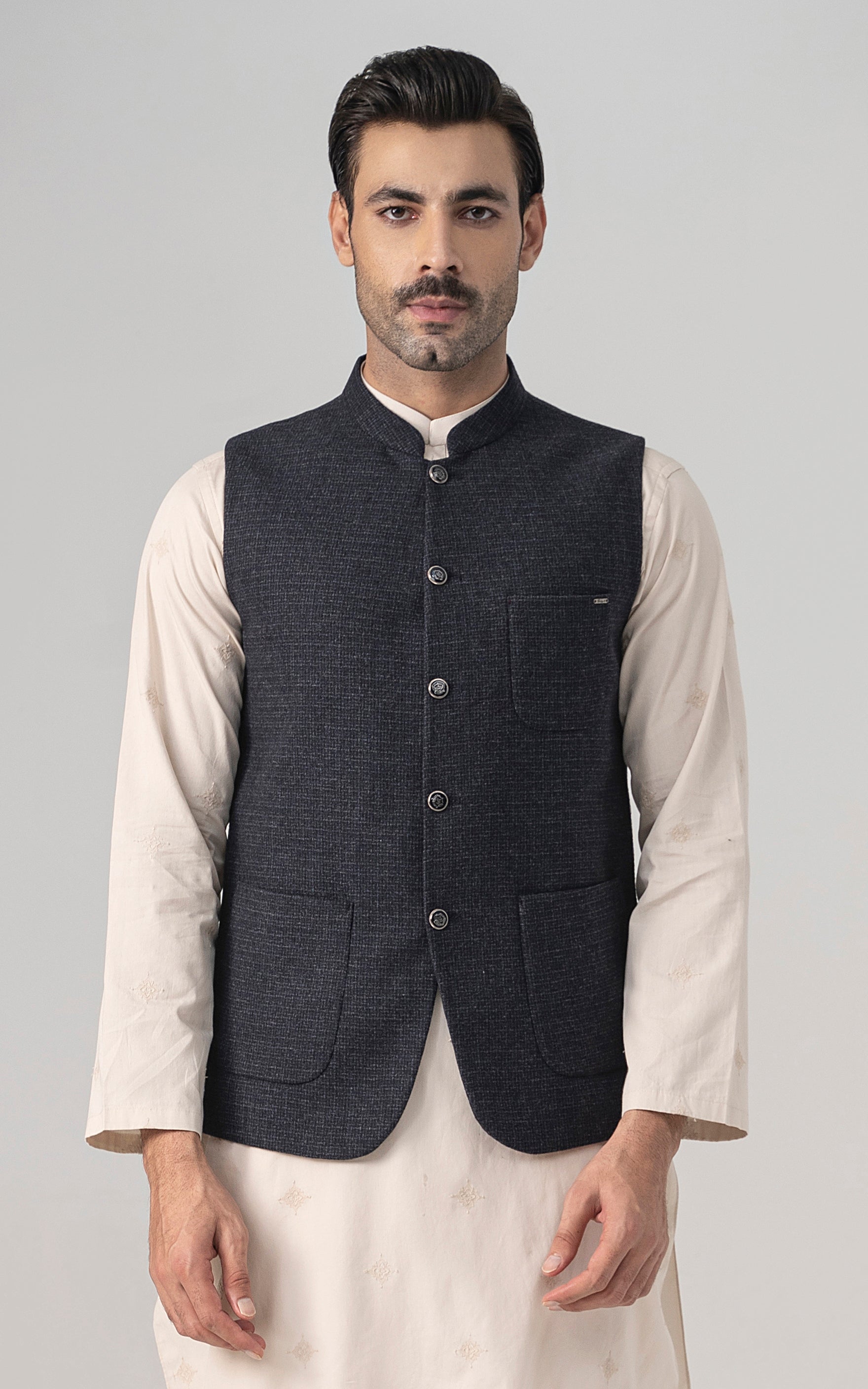 this is one of the most eminent fabric in our blended wool collection. this masterpiece is a class by itself when worn. the texture on this fabric will give you a classy look. the color palette consist of dark colors only. straight ban, upper front patch pocket with trim detail, patch pockets on front, visible placket, full contrast lining inside, round hem, special buttons, textured woolen waistcoat.