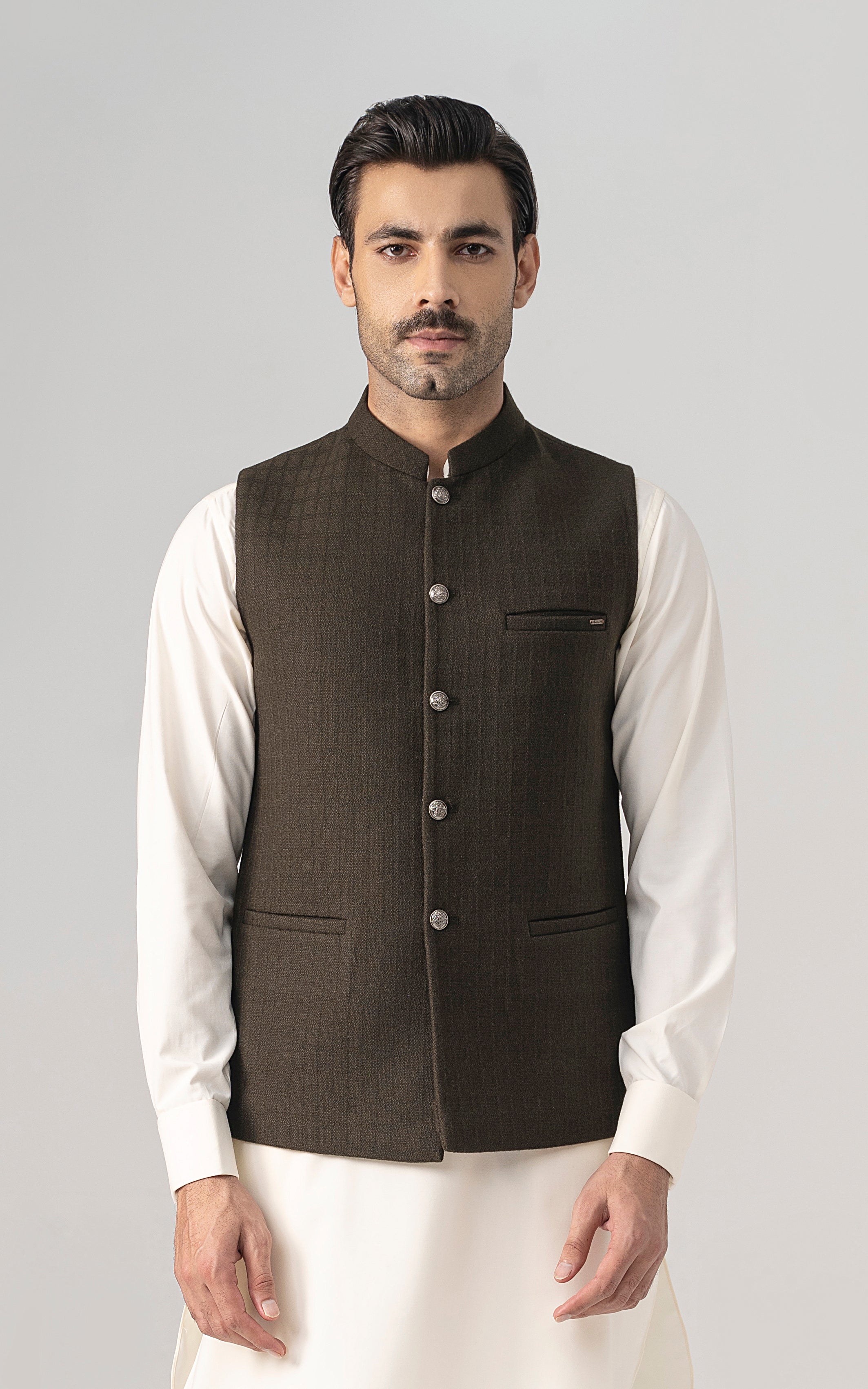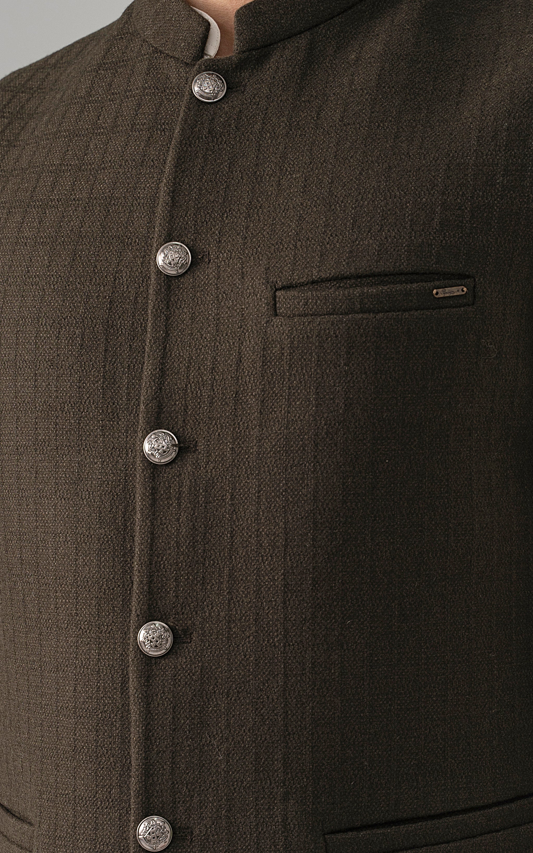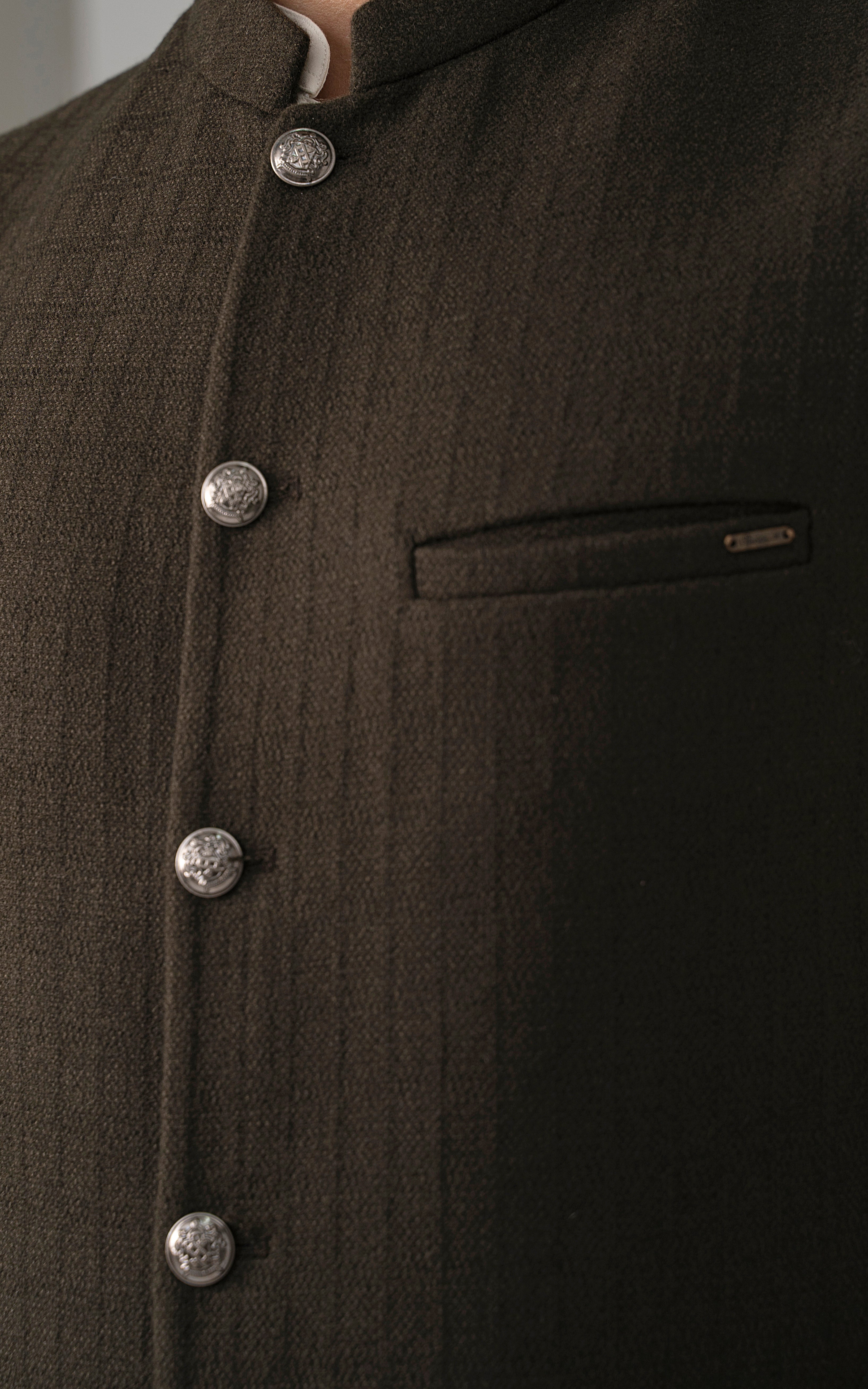 this is one of the most eminent fabric in our blended wool collection. this masterpiece is a class by itself when worn. this astonishing wool blend is an excellent fabric which will give you a classy look. it has only dark colors in its palette. straight ban upper front single bone pocket with trim detail single bone pockets on front visible placket full contrast lining inside straight hem special buttons textured woolen waistcoat