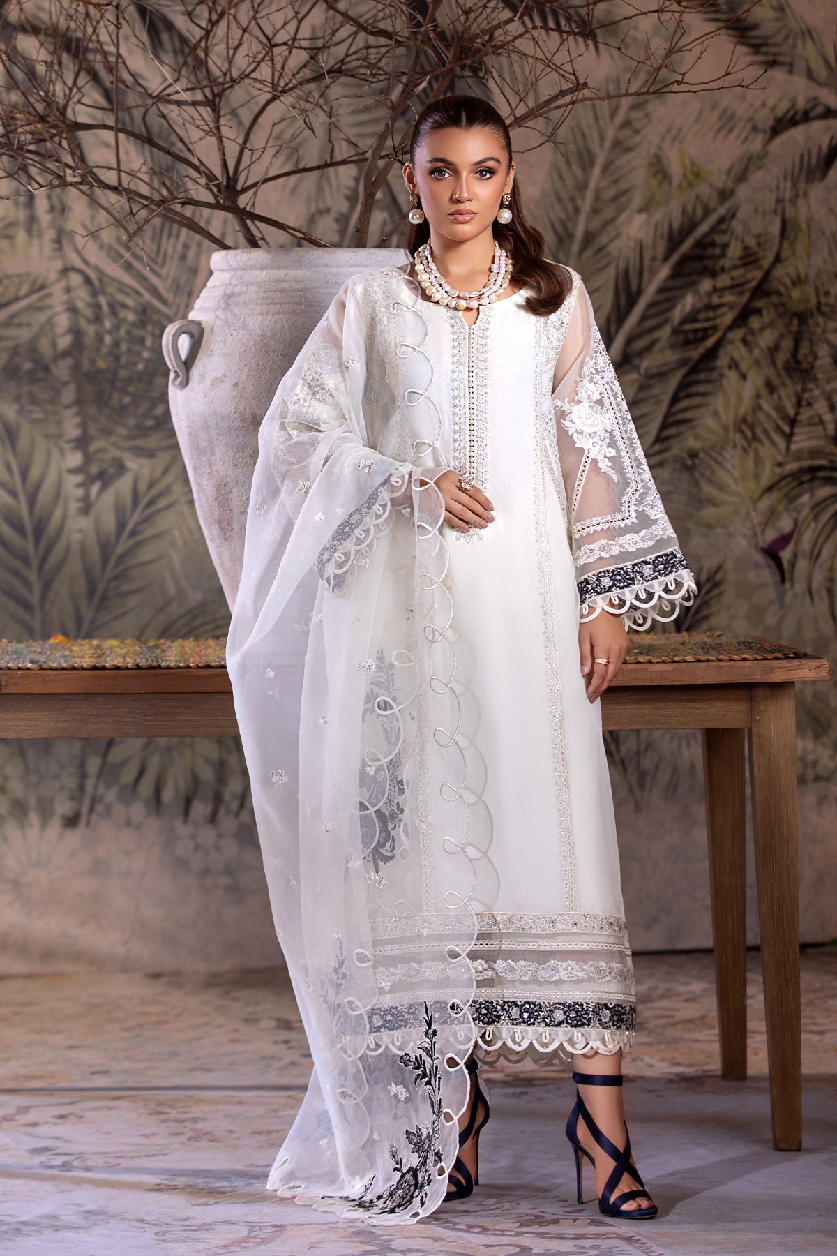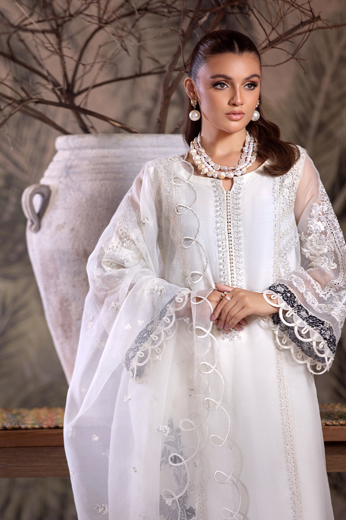 shirt : organza shirt with embroidered front,embroidered sleeves,embroidered back neck lace and daman lace. finished with stitching detail. raw silk inner. trouser : raw silk trouser. finished with stitching detail. dupatta : organza dupatta with embroidered 4 side dupatta pallu lace. size : s m l measurement length 52" 54" 56" flare/daman width 28" 30" 30"