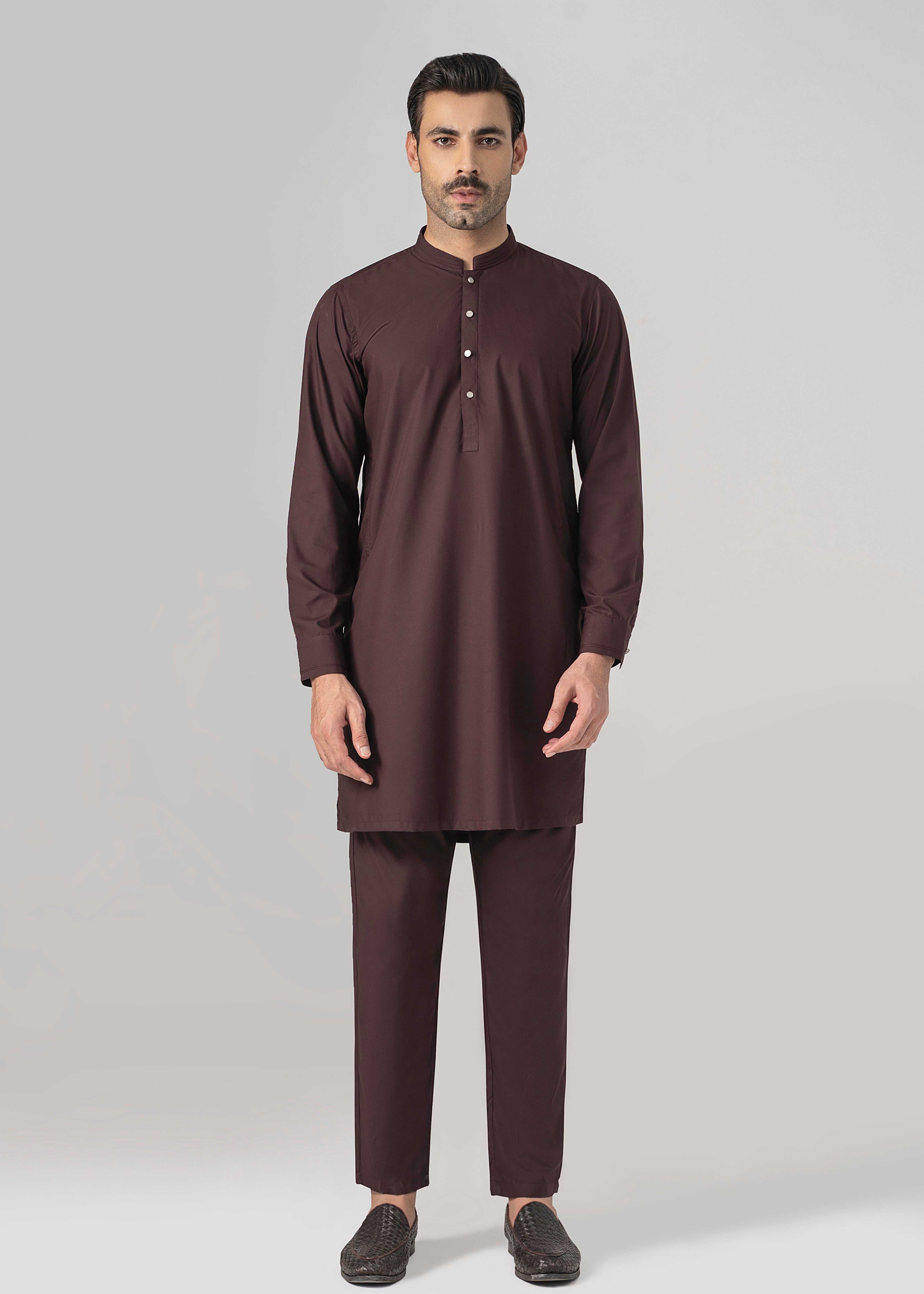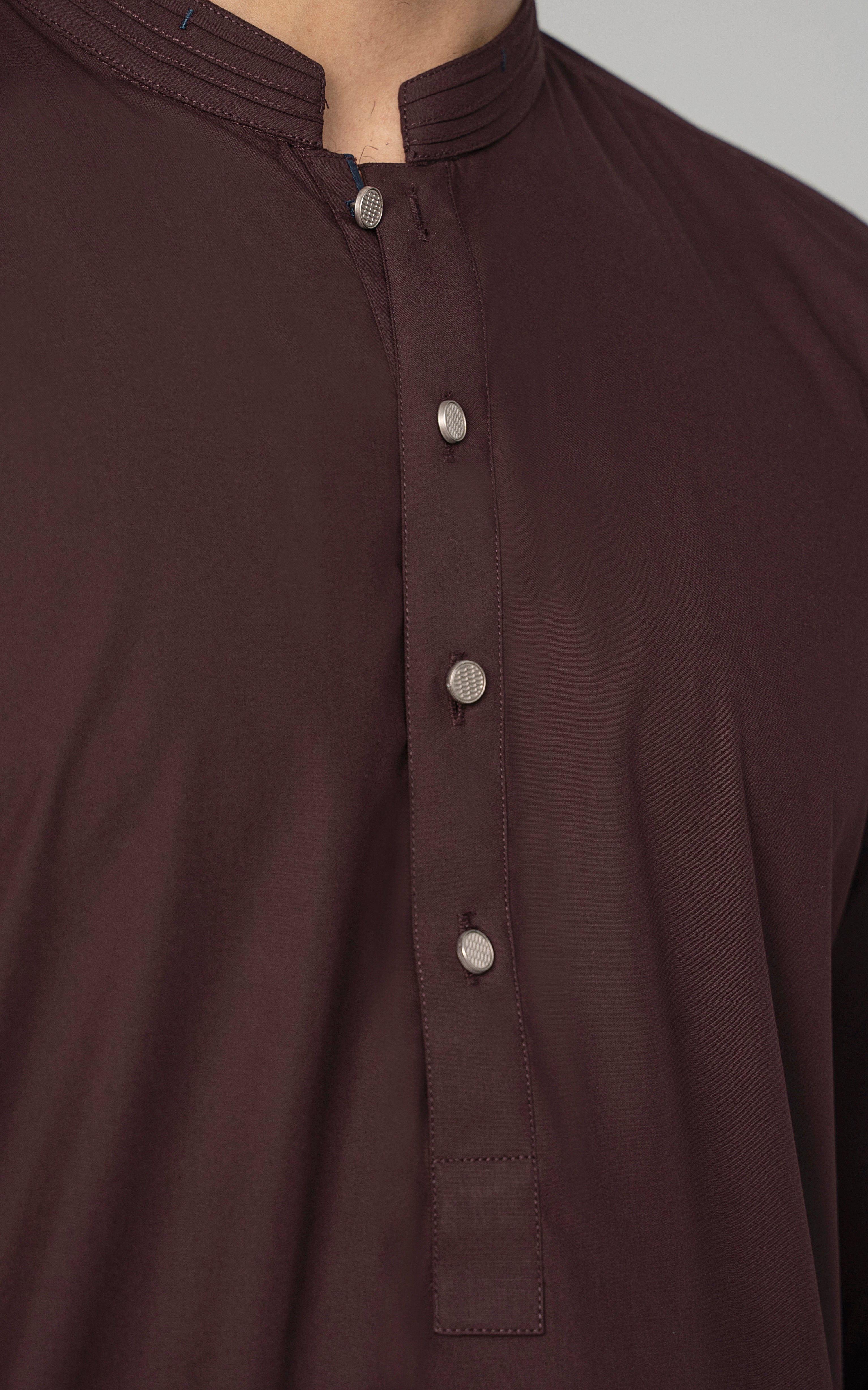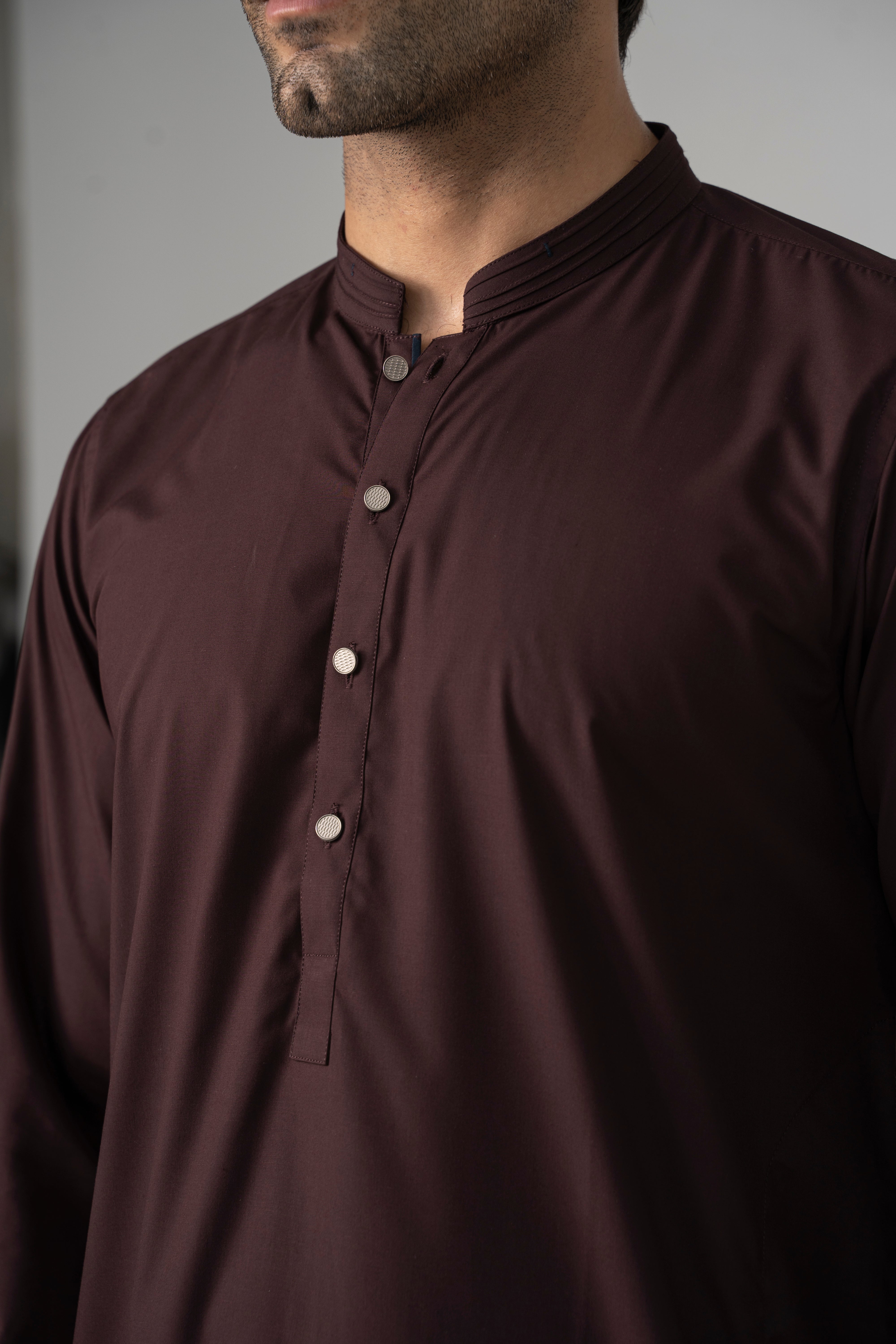 this fabric is the amalgamation of the two finest fibers of polyester and viscose. it has timeless appeal and versatile drape. this graceful cloth is available in beautiful dusky dark hues which are absolutely perfect for this winter season. mandarin ban stitching and bar-tack details on ban visible placket straight cuff stitching details on cuff straight hem special buttons premium blended fabric