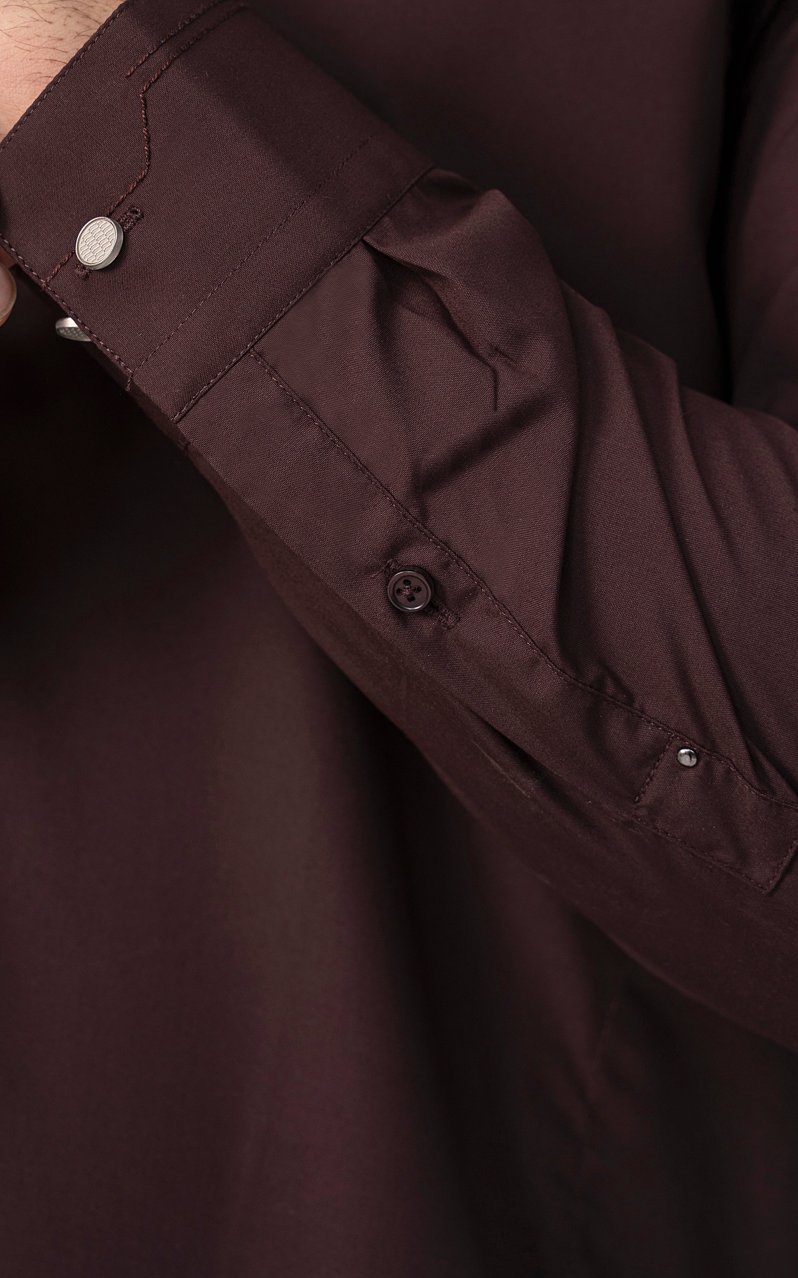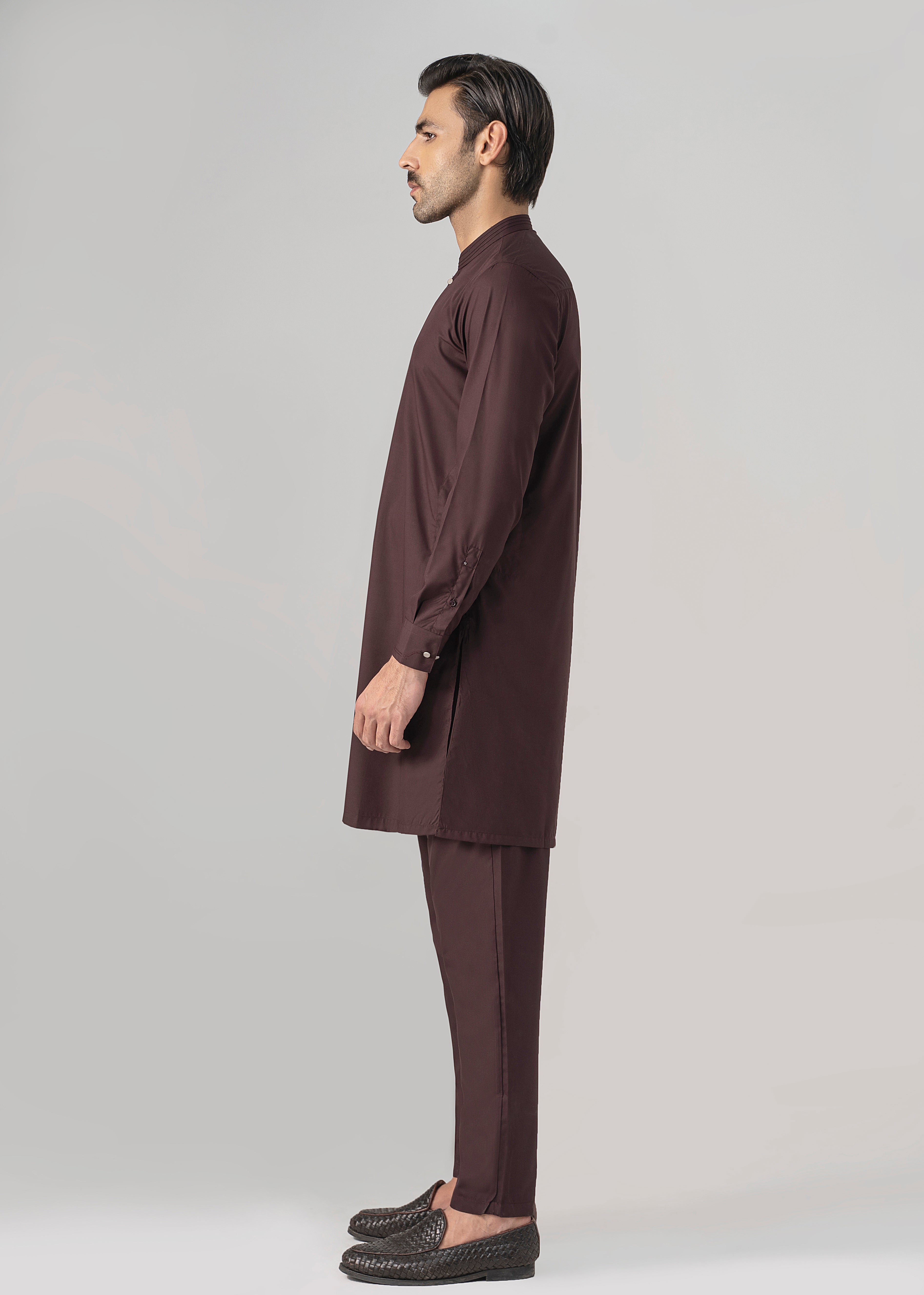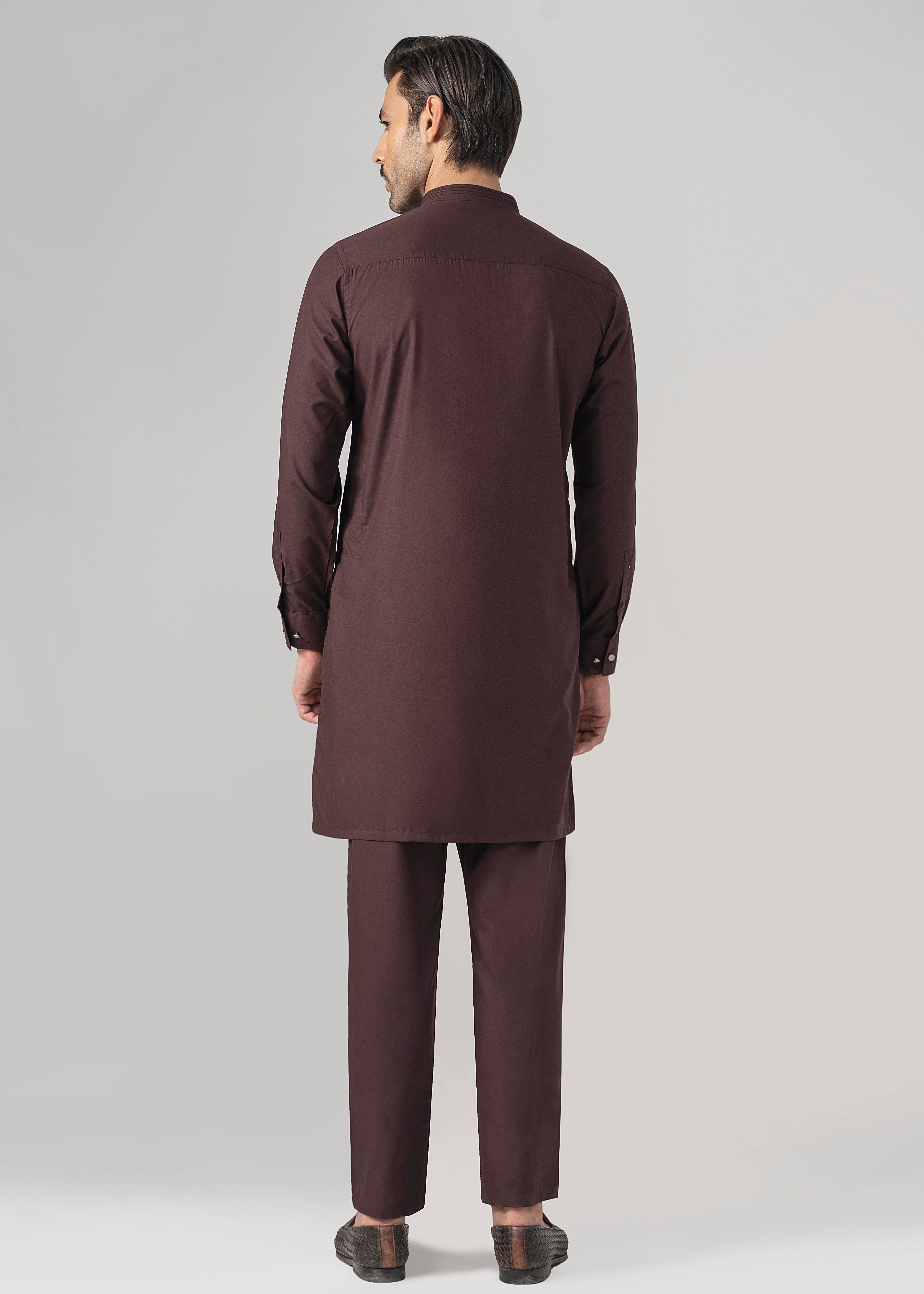 this fabric is the amalgamation of the two finest fibers of polyester and viscose. it has timeless appeal and versatile drape. this graceful cloth is available in beautiful dusky dark hues which are absolutely perfect for this winter season. mandarin ban stitching and bar-tack details on ban visible placket straight cuff stitching details on cuff straight hem special buttons premium blended fabric