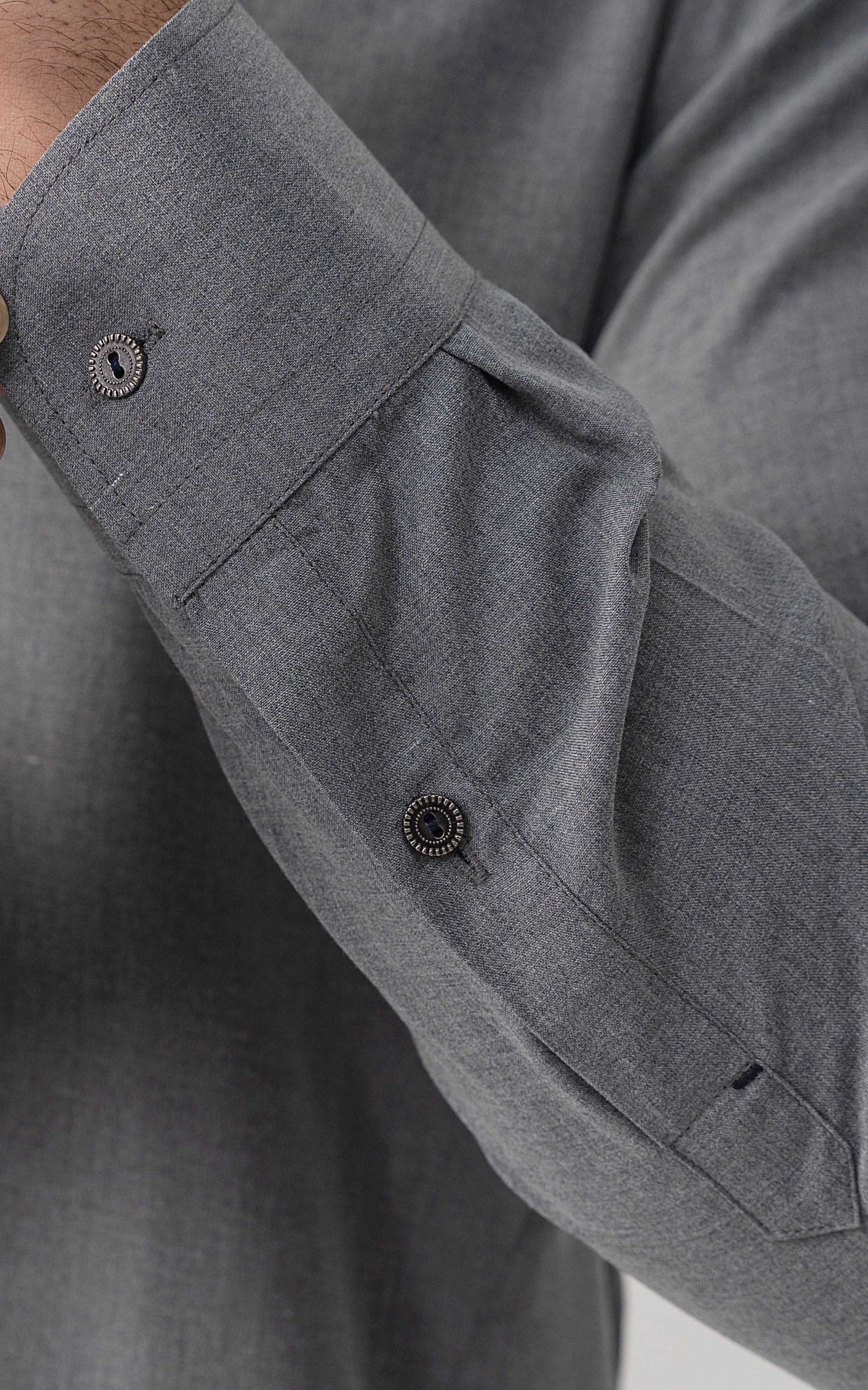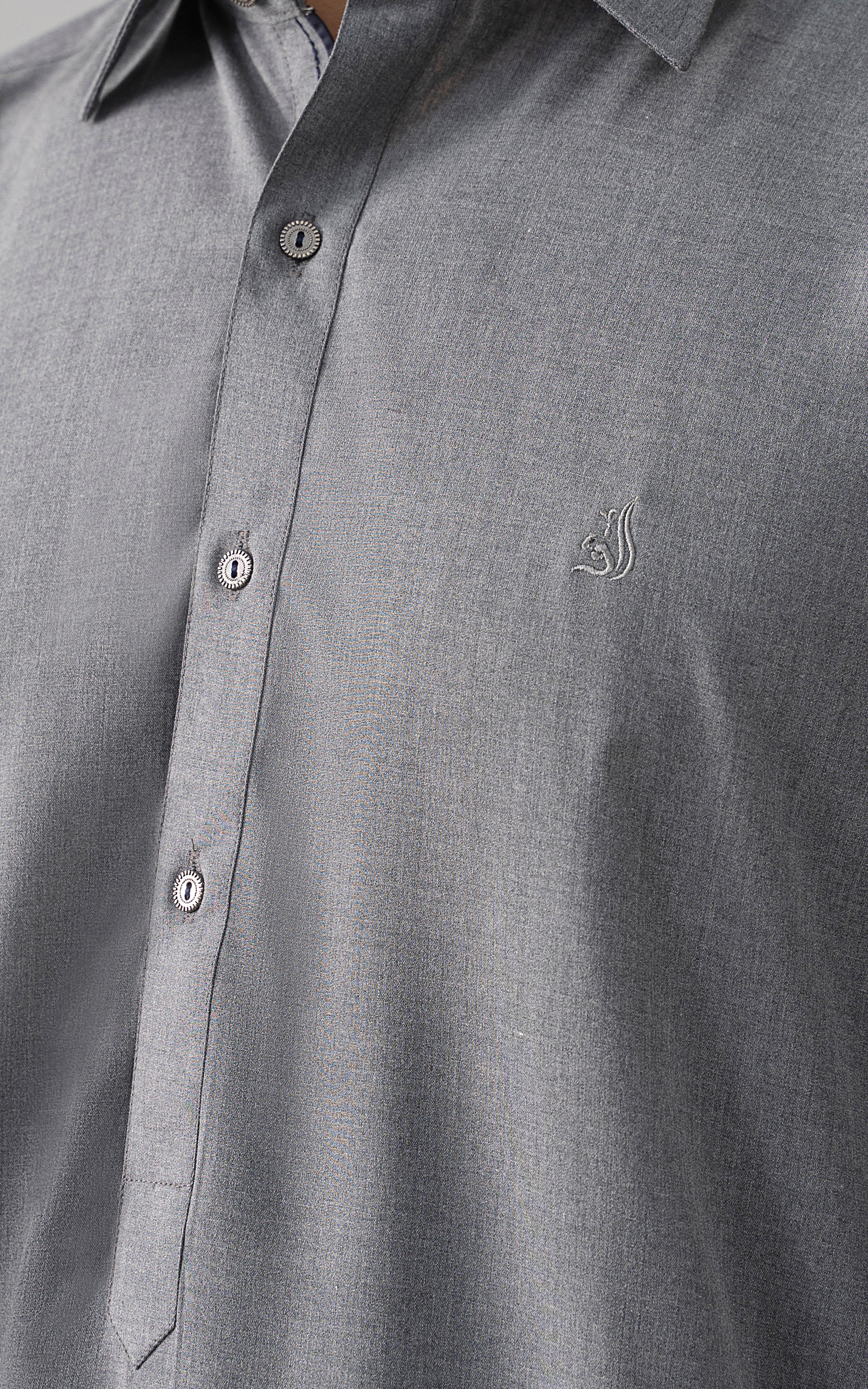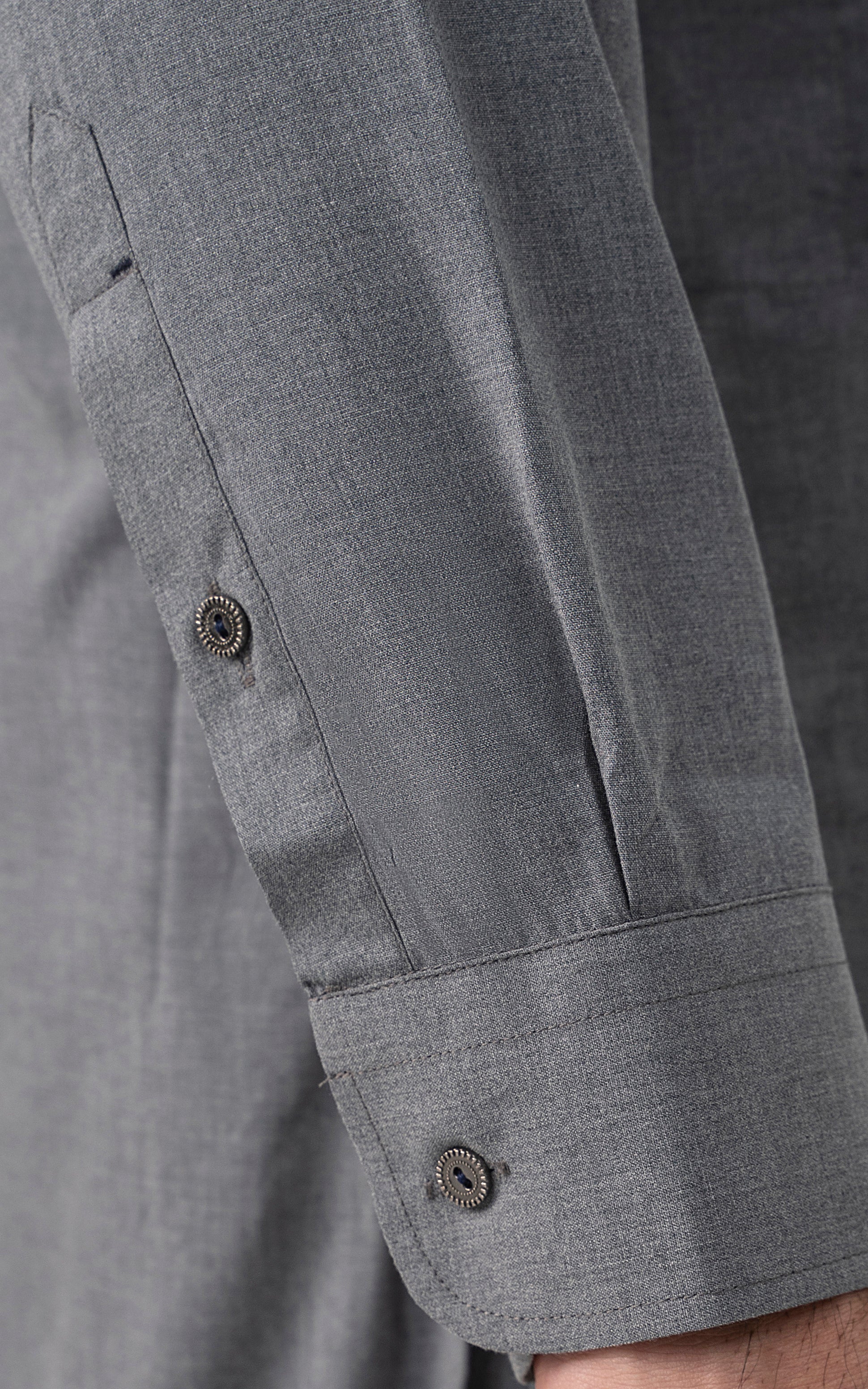 this mélange fabric is crafted from a opulent blend of viscose and polyester. this fibre dyed cloth is one of the finest fabrics to be manufactured and has elegance and royalty embedded in every fibre. light colors are available in this flawless fabric. regular collar piping and champa details on button placket signature logo embroidery on front bar-tack details on sleeve placket round cuff round hem metal buttons blended mélange fabric