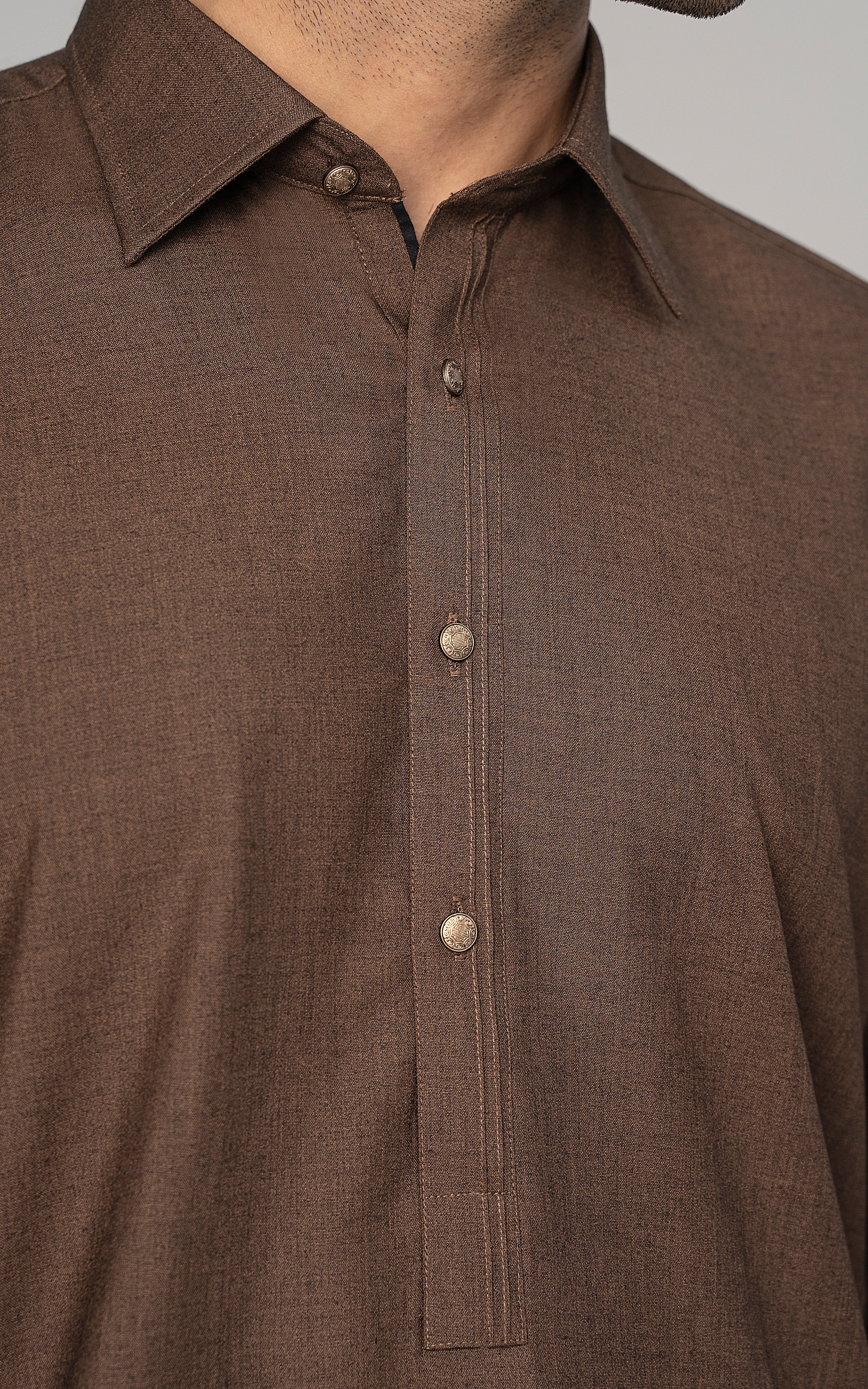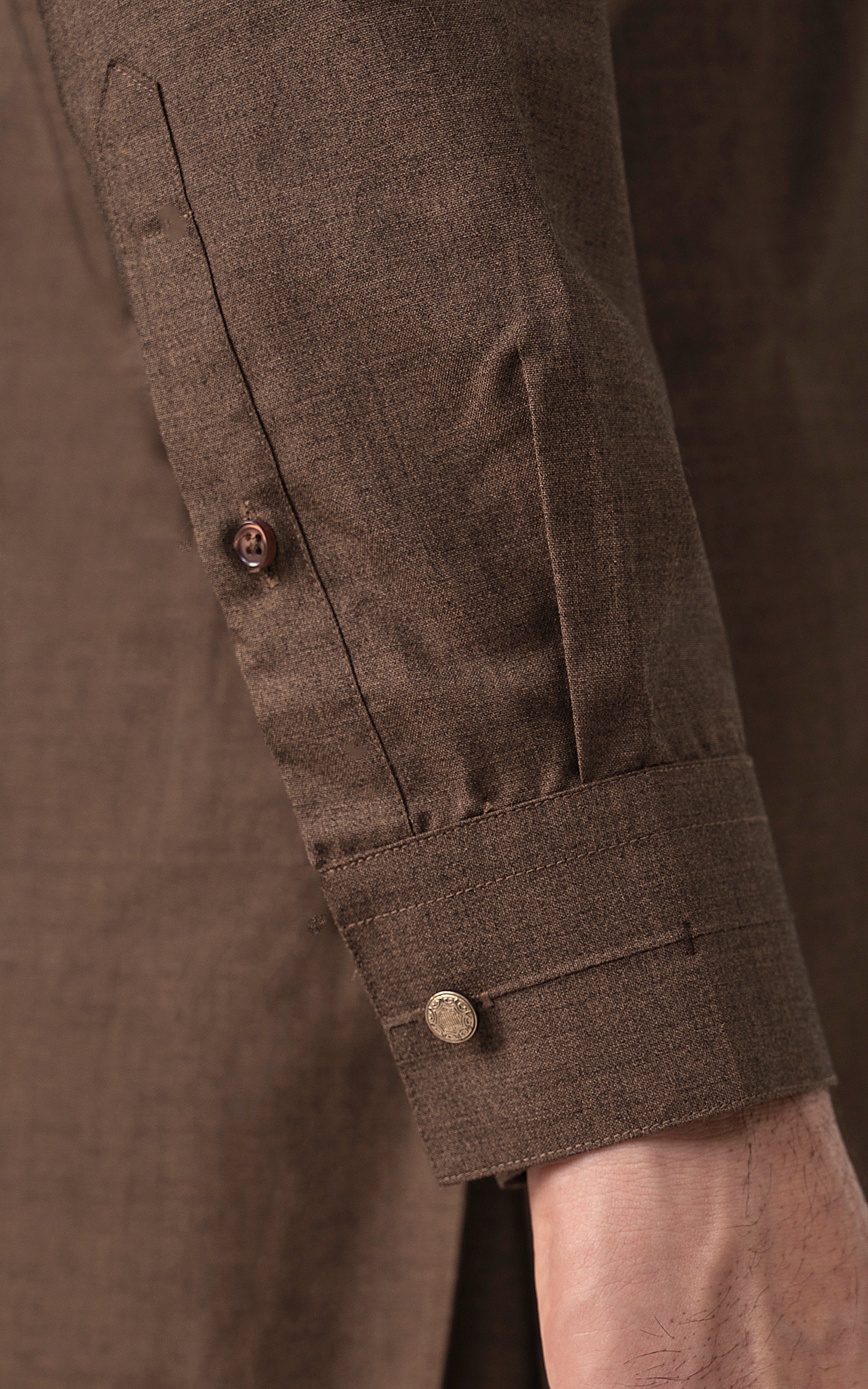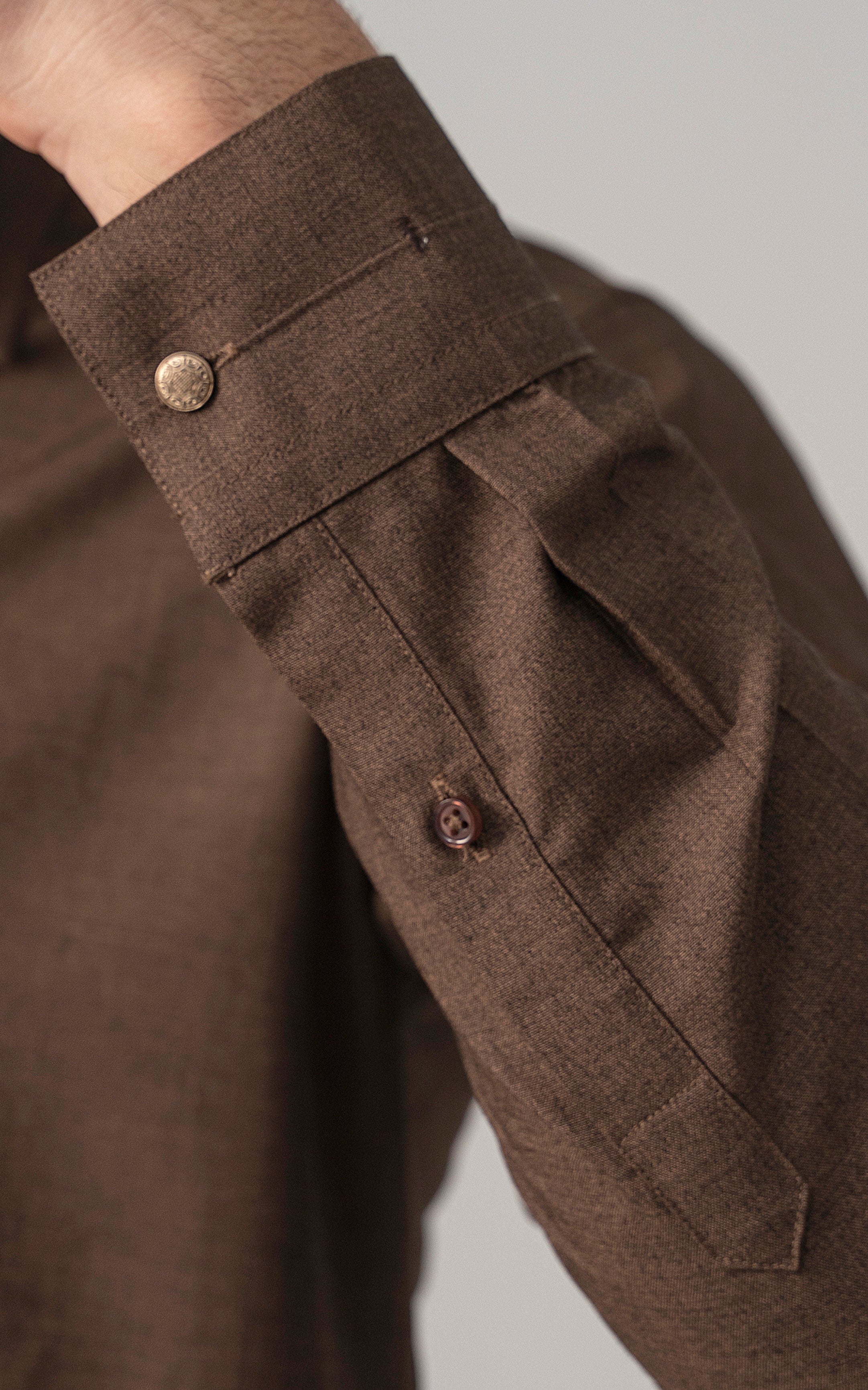 this yarn dyed fabric is a blend of fine fibers of polyester and viscose with that accentuating silky touch. a masterpiece from our blended collection, it epitomizes sophistication and innovation. the article is accessible in light and medium hues. regular collar piping on button placket stitching details on front placket visible placket stitching and bar-tack details on cuff straight cuff round hem special buttons blended woolen mélange fabric