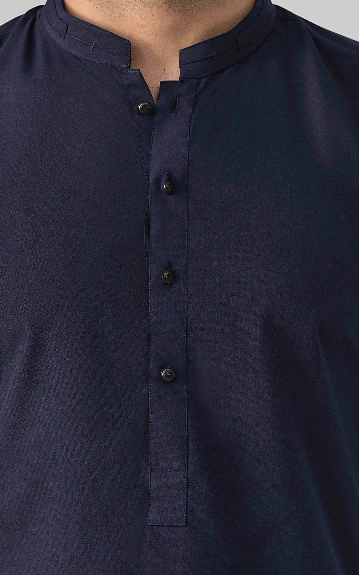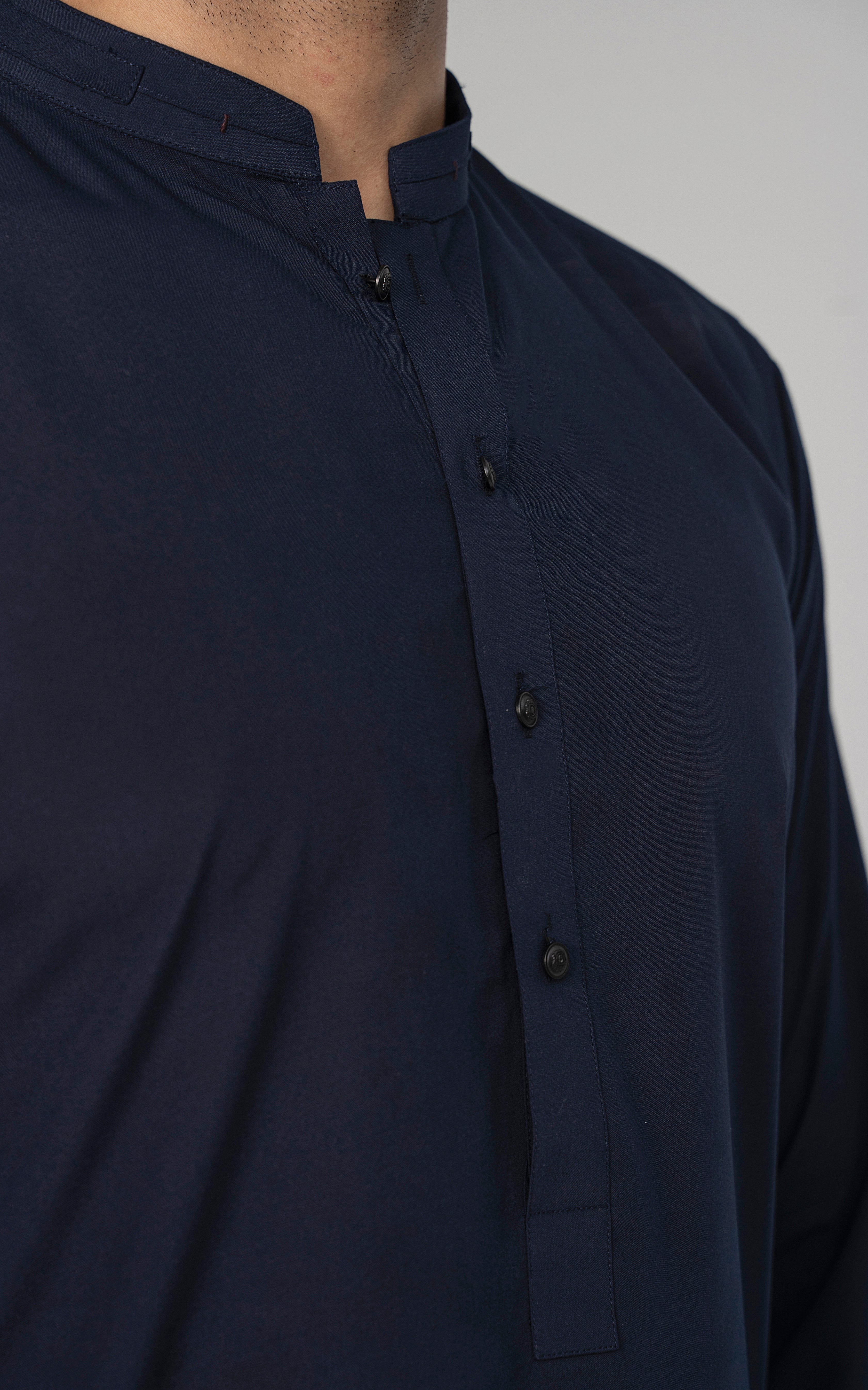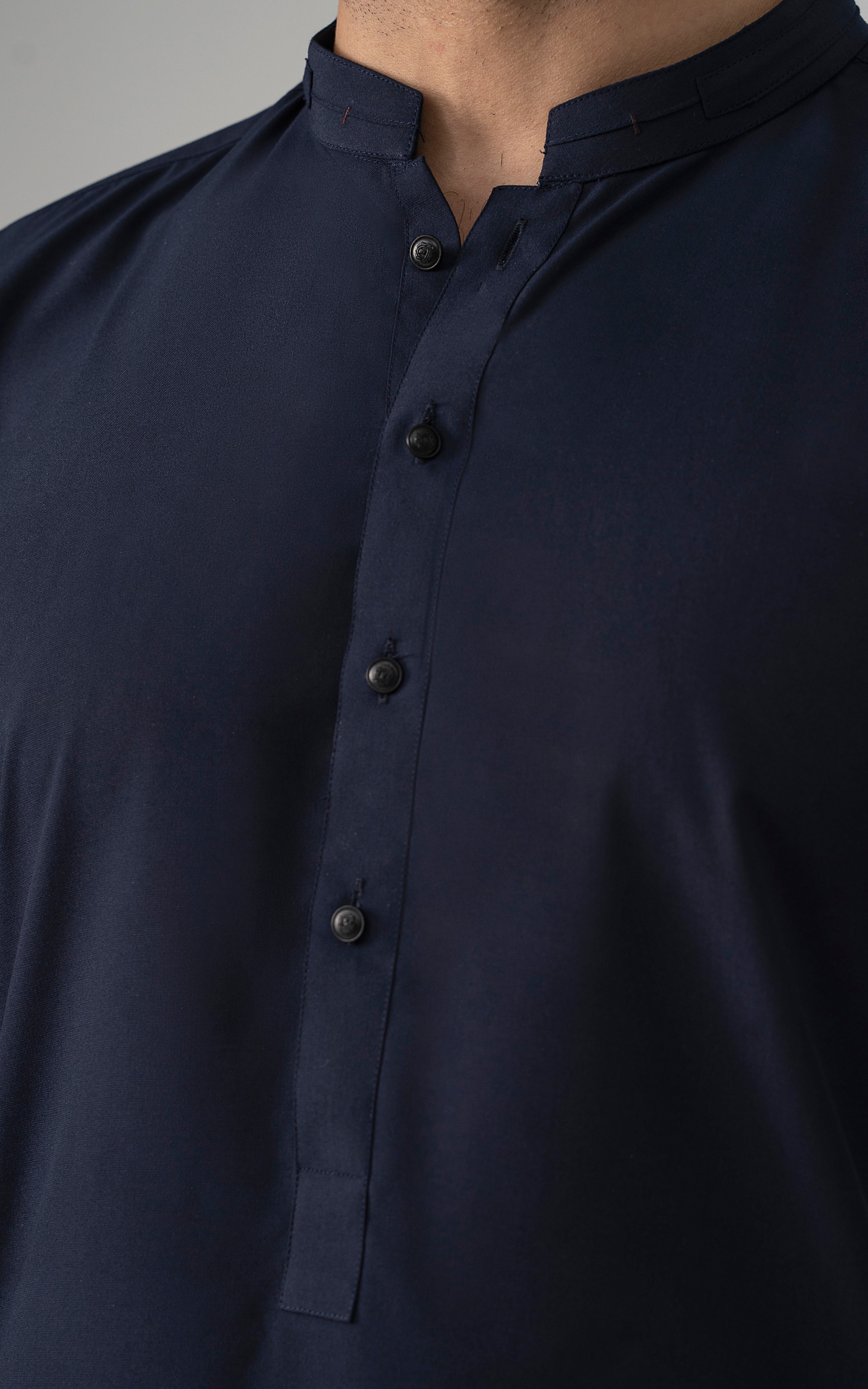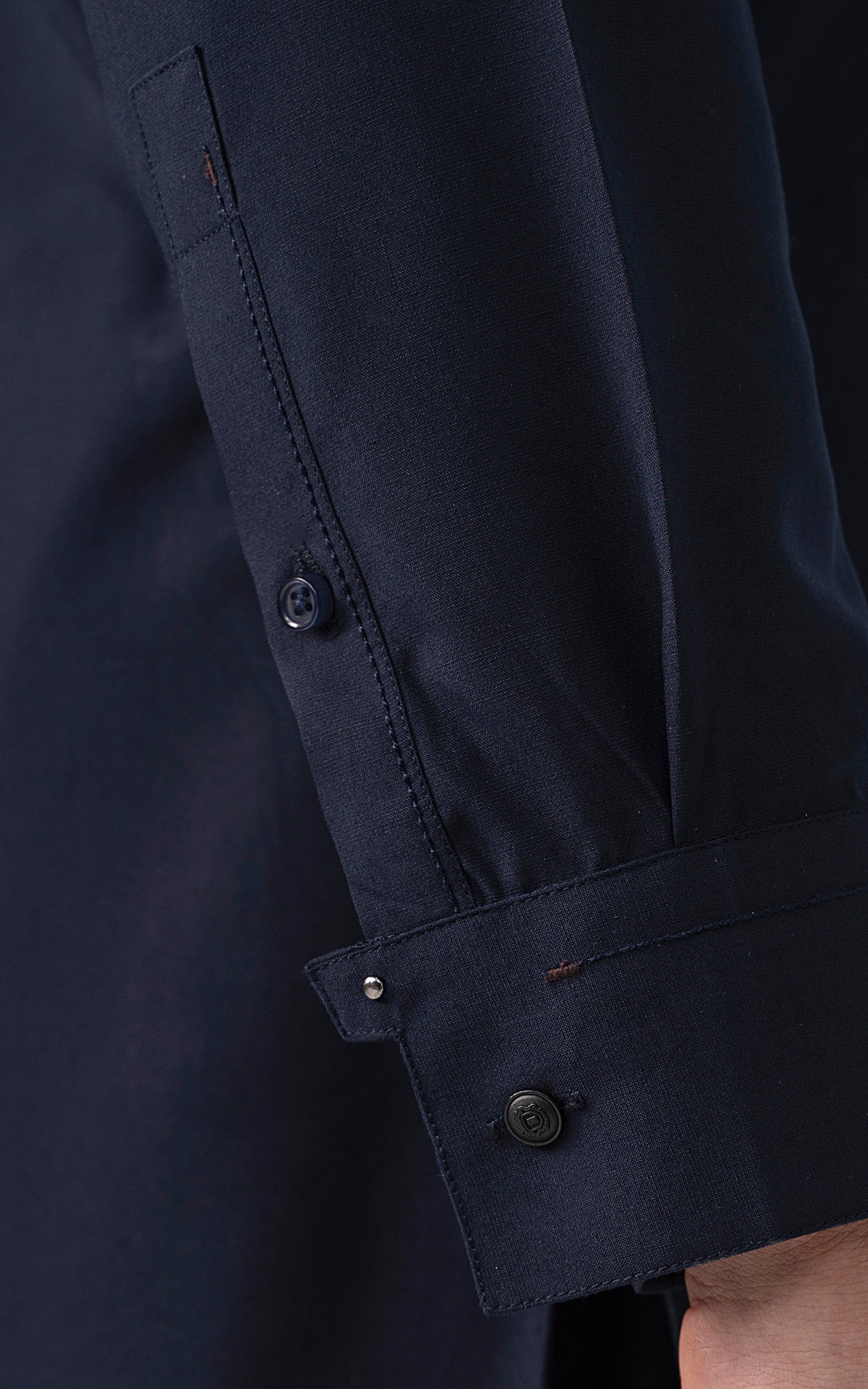 this blended wash & wear fabric is comprised of polyester and viscose for unparalleled comfort and durability. it is an exceptionally comfortable fabric which aims to achieve unmatched levels of satisfaction in this winter season. this article is accessible in dusky dark hues. mandarin ban, stitching details on ban, visible placket, stitching and trim details on cuff, straight cuff, straight hem, special buttons, blended wash & wear fabric.