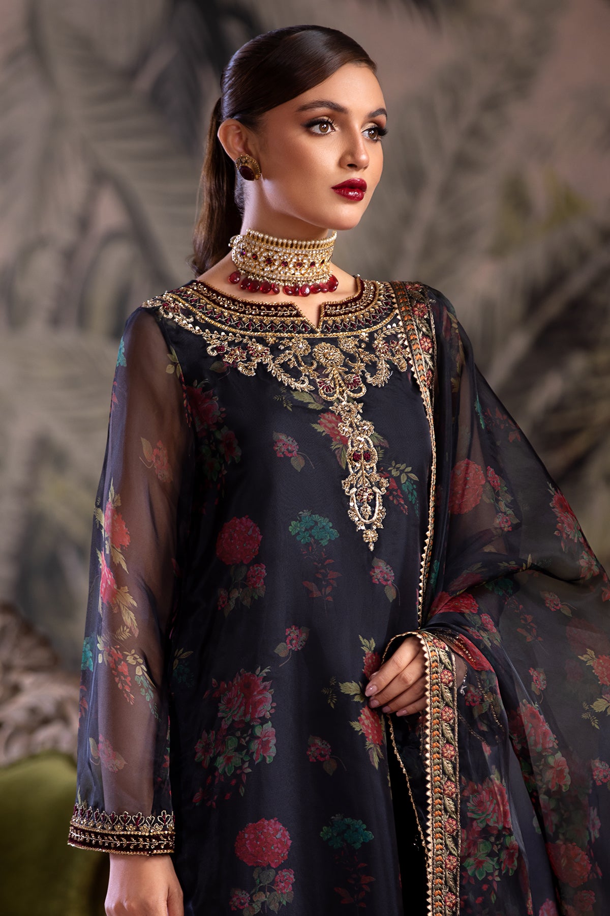 shirt : organza printed shirt with embroidered front neckline,embroidered sleeves and daman lace. embellished with patch work and adda work. raw silk inner finished with stitching detail. trouser : raw silk trouser with embroidered trouser lace. finished with stitching detail. dupatta : organza printed dupatta with embroidered 4 side dupatta pallu lace." size : s m l measurement length 47" 49" 51" flare/daman width 27" 29" 30"