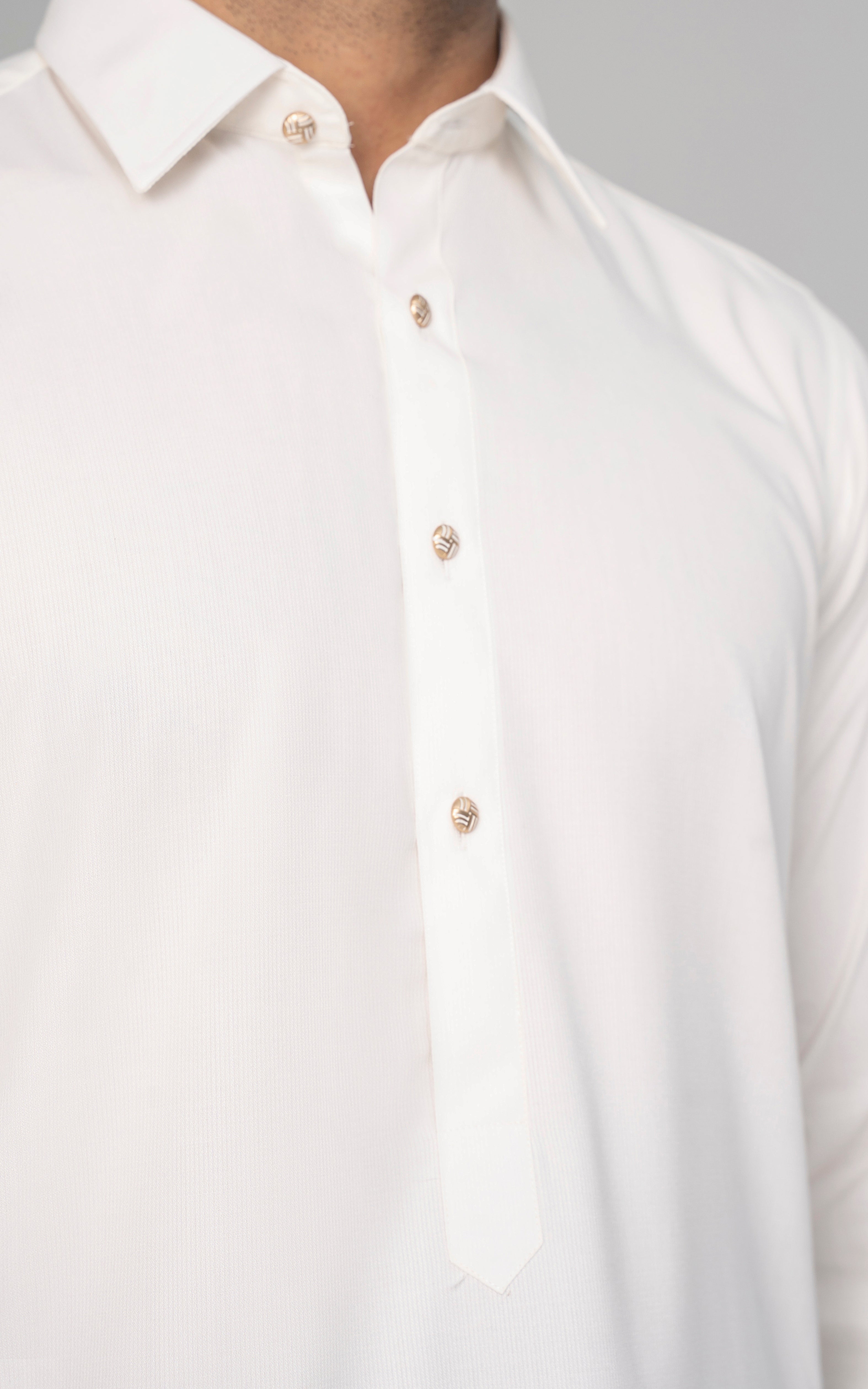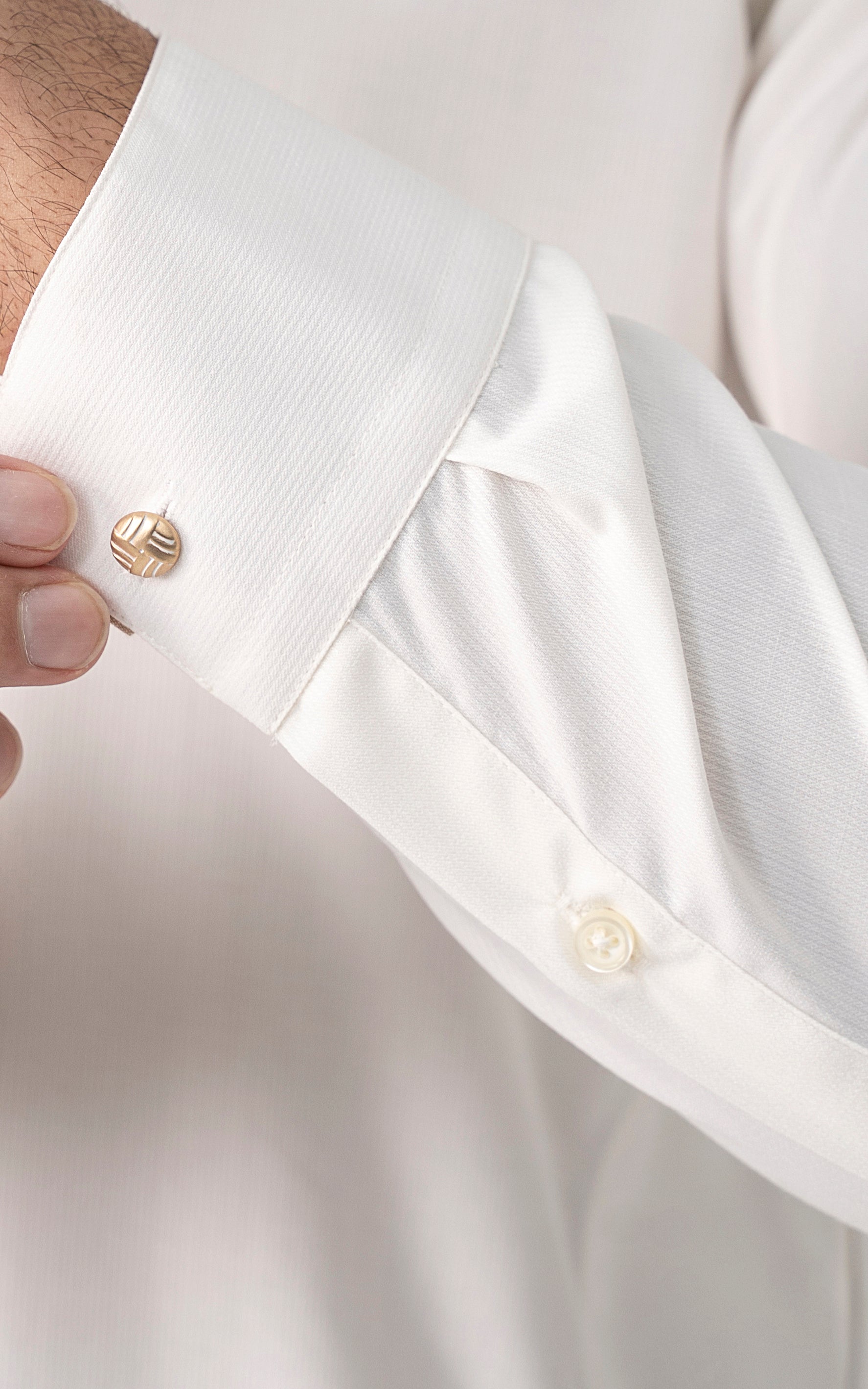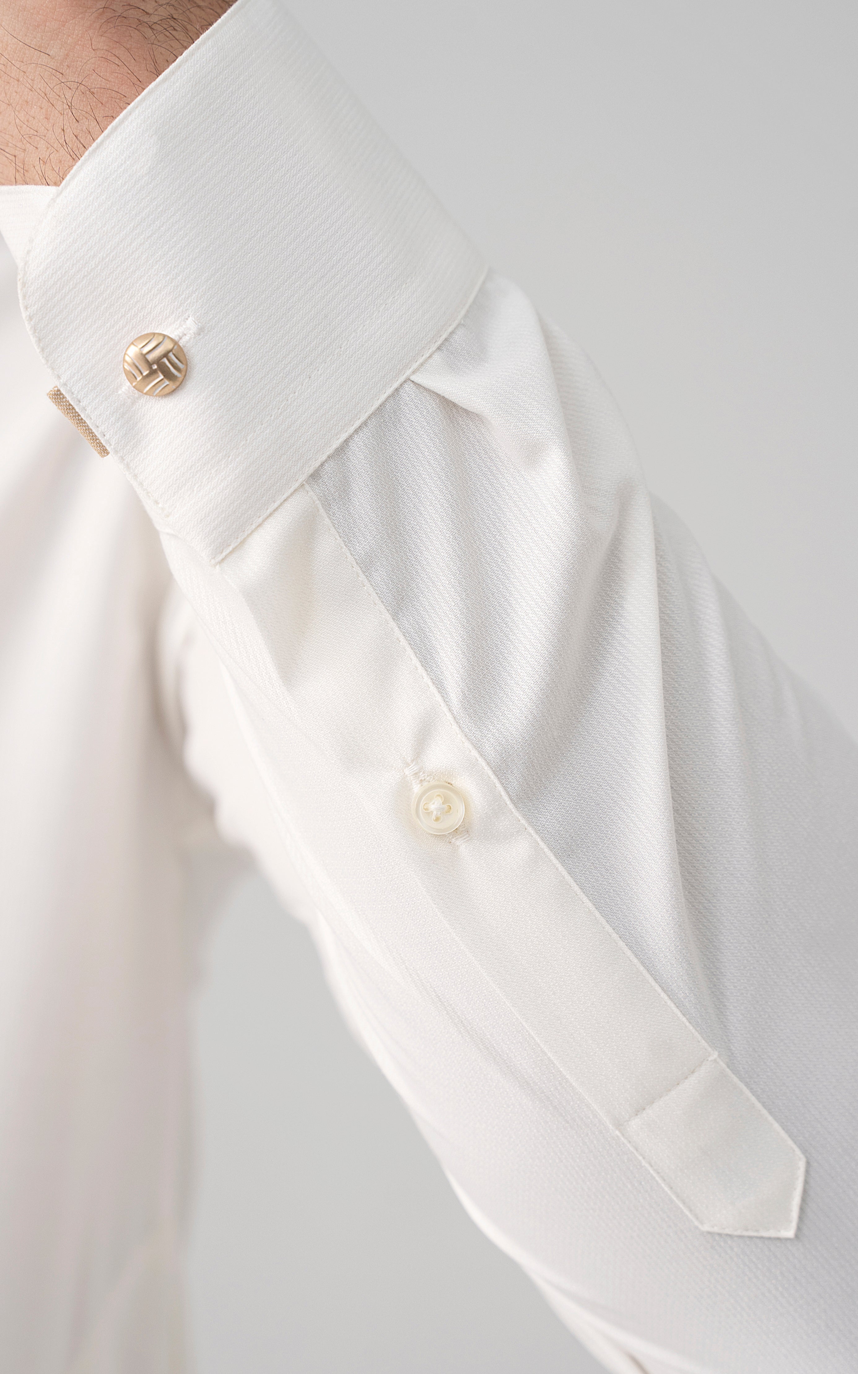 this textured blended fabric is the most eminent fabric in our signature collection. the perfect fusion of polyester and viscose combines royalty with perfection. a masterpiece from our blended collection, it epitomizes sophistication and innovation. the article is accessible in light hues. french collar inside ban piping visible placket round cuff piping details on cuff round hem special buttons textured blended fabric