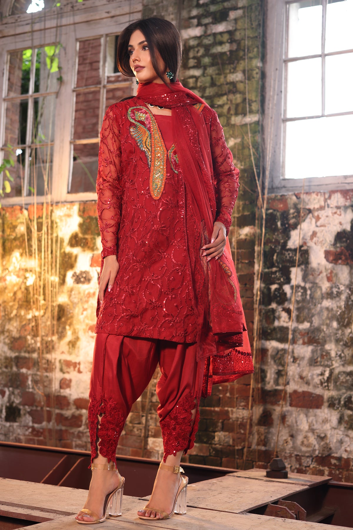 shirt : organza shirt with embroidered front back sleeves jall. embellished with patch work and adda work. finished with stitching detail. raw silk inner. trouser : raw silk trouser with embroidered trouser motifs. finished with stitching detail. dupatta : poly net dupatta with embroidered 4 side dupatta pallu lace. size : s m l measurement length 34" 36" 38" flare/daman width 23" 25" 26"