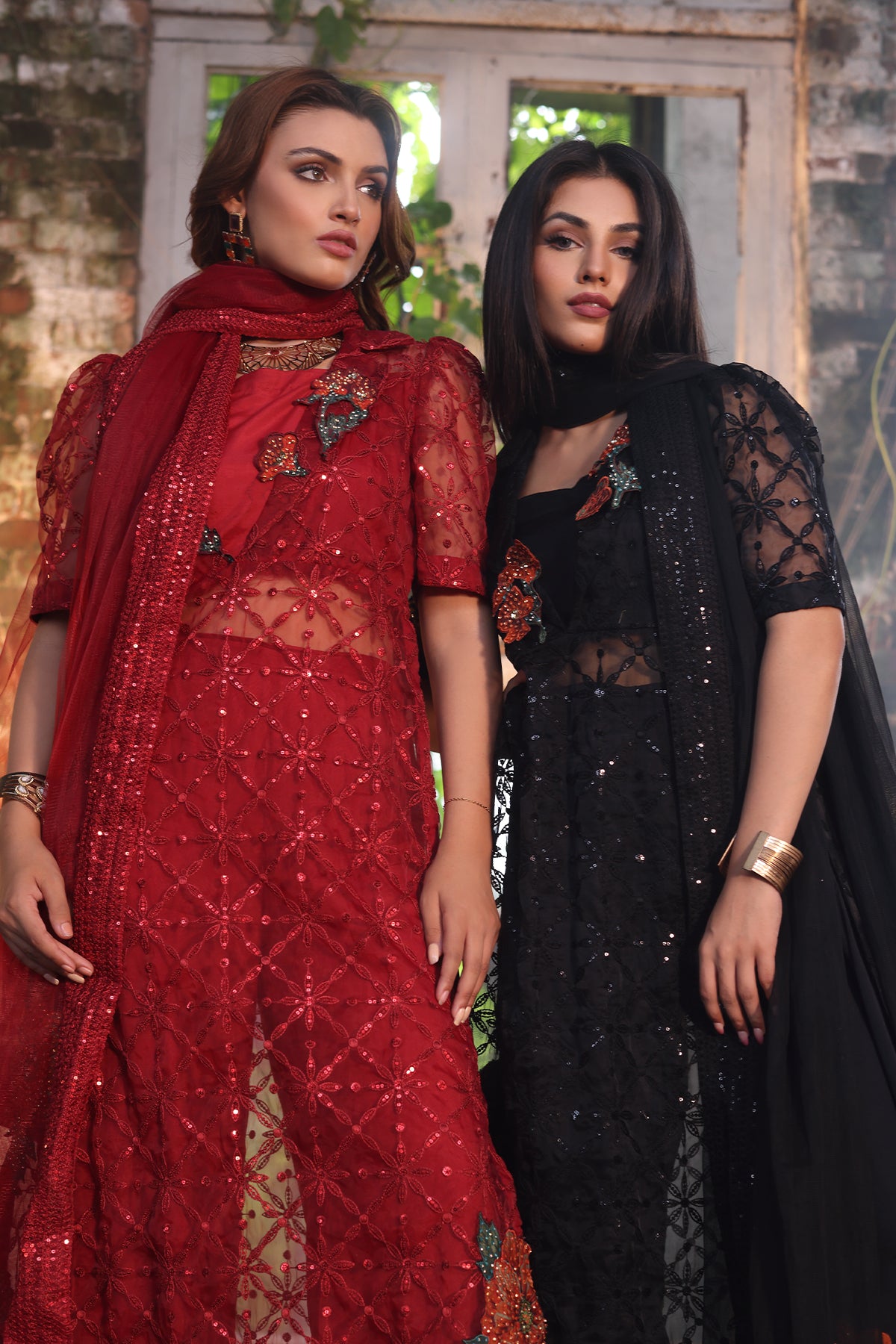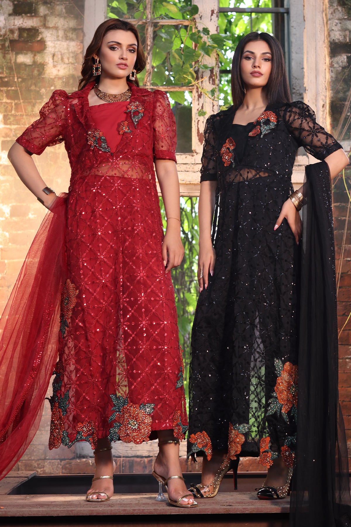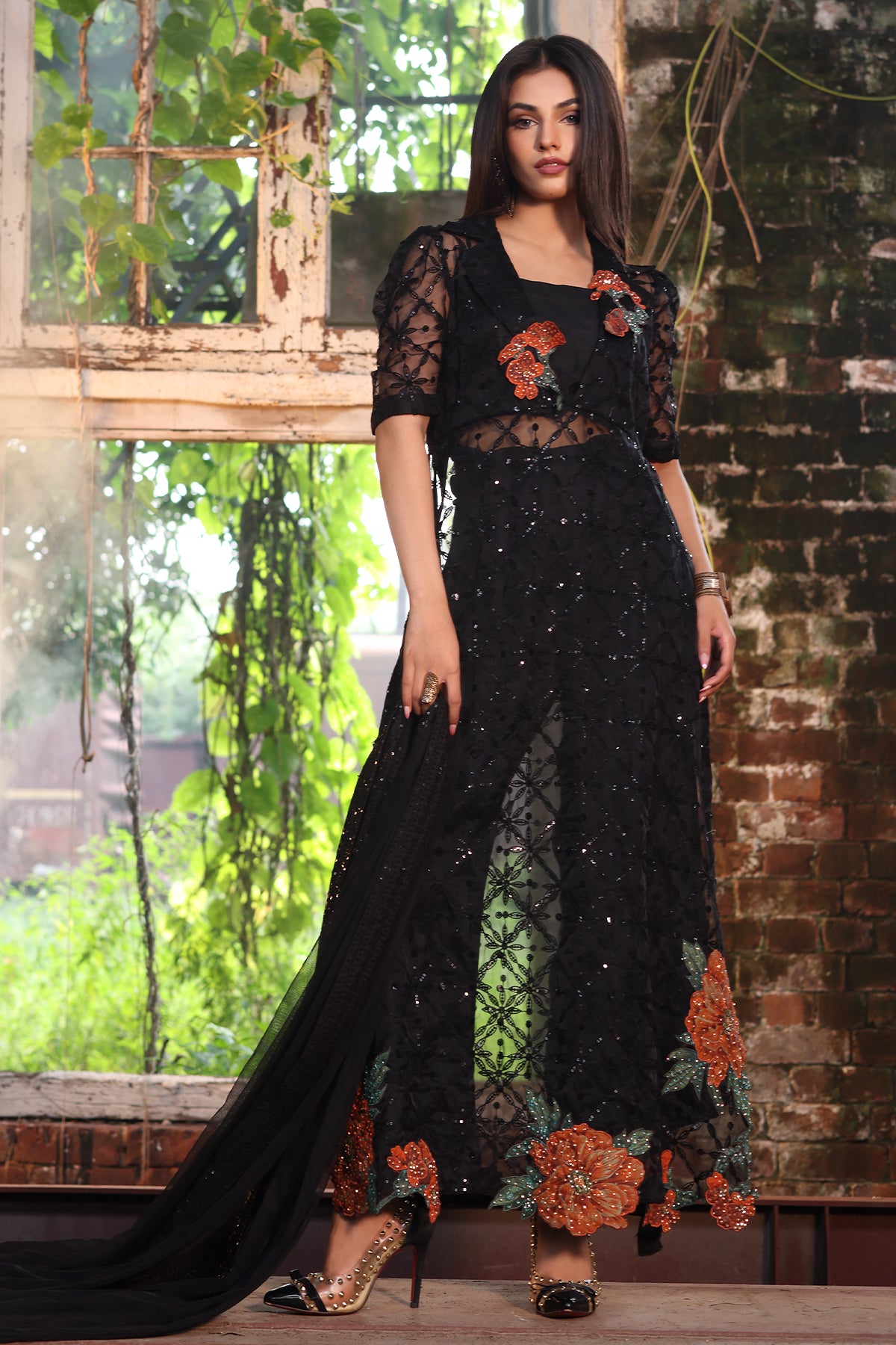 shirt : organza shirt with embroidered front back sleeves jall. embellished with patch work and adda work. finished with stitching detail. raw silk inner. trouser : raw silk trouser with embroidered trouser motifs. finished with stitching detail. dupatta : poly net dupatta with embroidered 4 side dupatta pallu lace." size : s m l measurement length 52" 54" 54" flare/daman width 28" 30" 30"