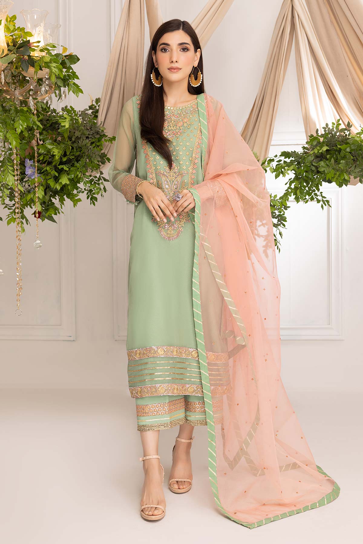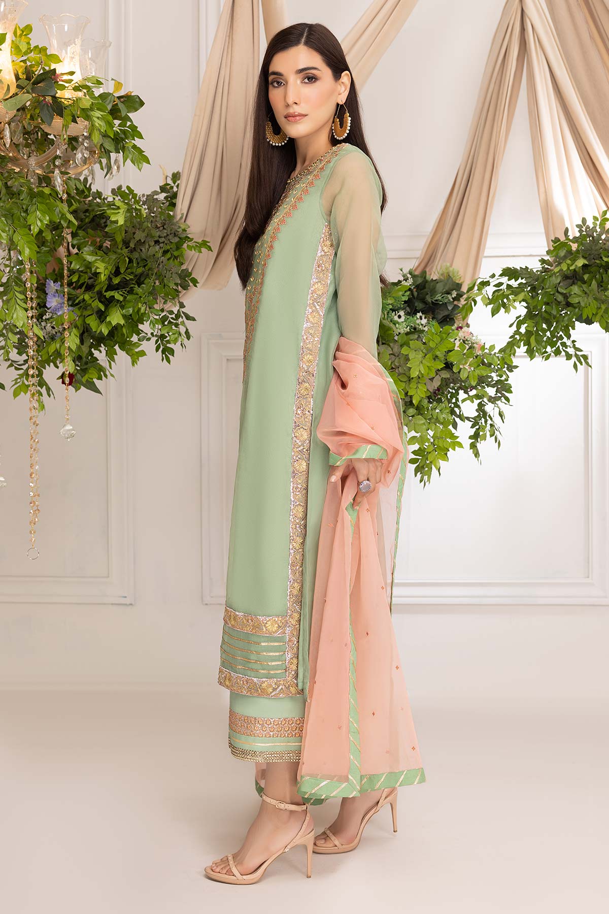 - green organza shirt - long embroidered neck motif - sleeves finished with contrast embroidered heavy border - pink organza embroidered dupatta edge finishing of indian lace - raw silk bell shape trouser with embroidery finishing measurement length 46 46 48 48 flare/ daman width 28 28 28 28