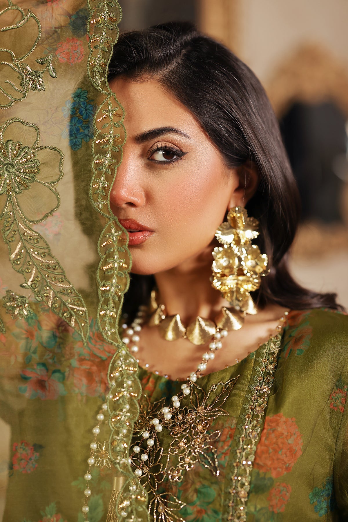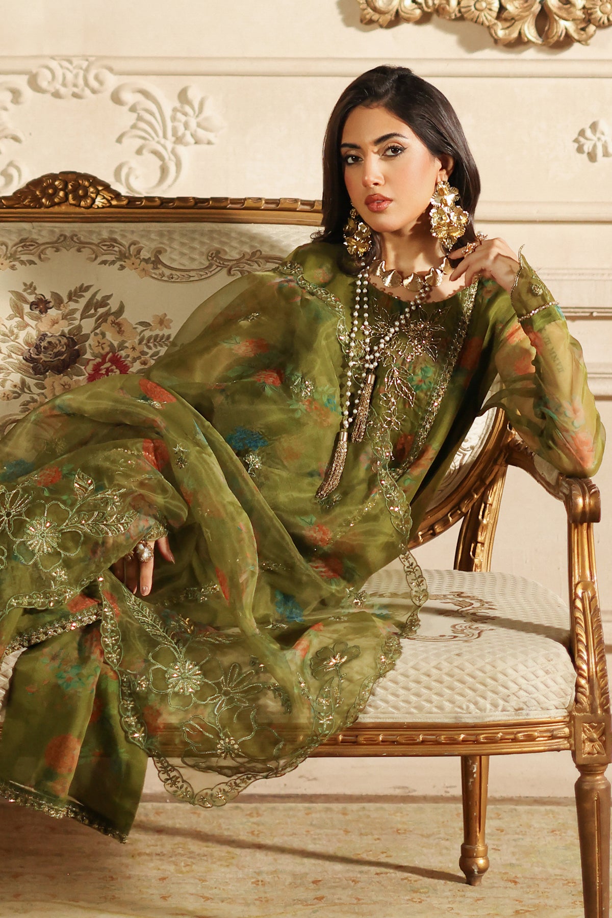 shirt : organza printed shirt with embroidered front motif,embroidered sleeves motif and embroidered front back laces. embellished with adda work and patch work.raw silk inner shirt. finished with stitching detail. trouser : raw silk printed trouser. finished with stitching detail. dupatta : organza printed dupatta with embroidered 4 side dupatta pallu lace and motif." size : s m l measurement length 47" 49" 51" flare/daman width 27" 29" 30"