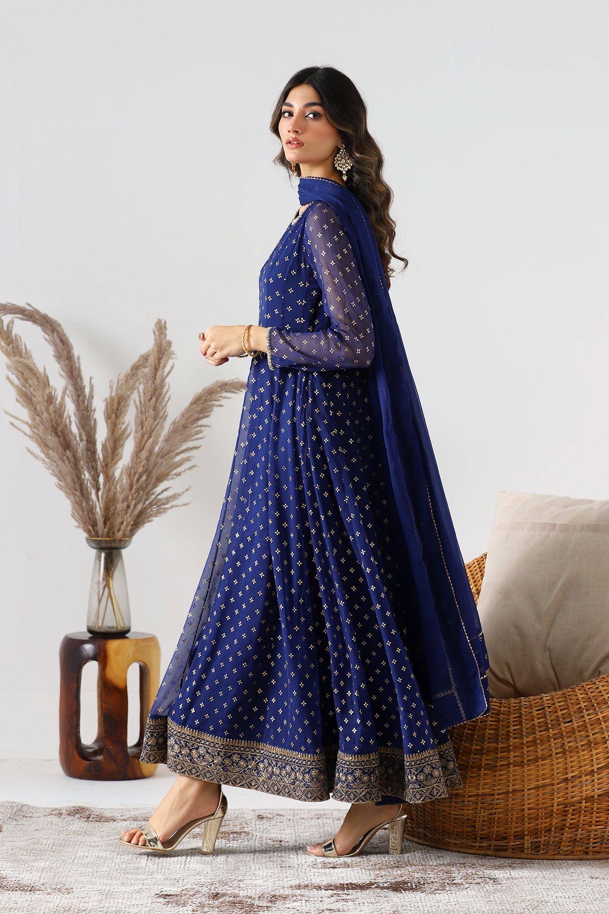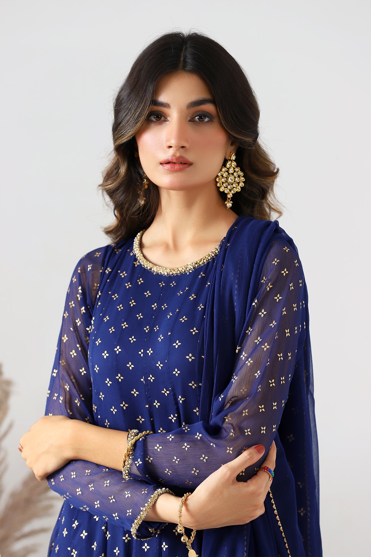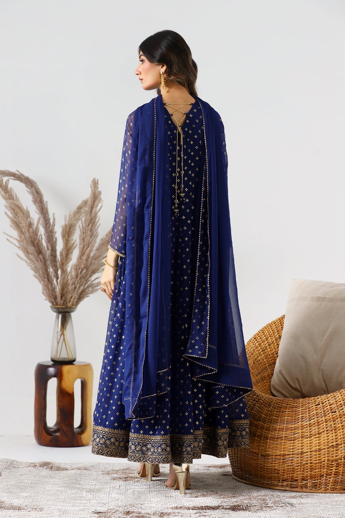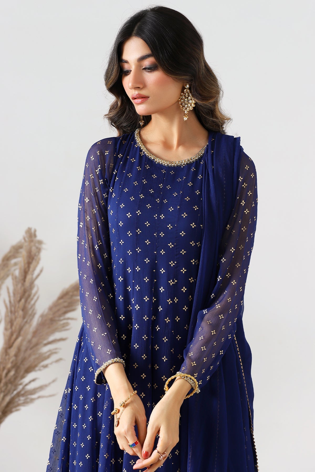 shirt : blue chiffon printed shirt embellished with adda work on front neckline and sleeves. finished with stitching detail. raw silk inner. trouser : raw silk trouser.finished with stitching detail. dupatta : chiffon dupatta. size s m l measurement length 50" 50" 50"