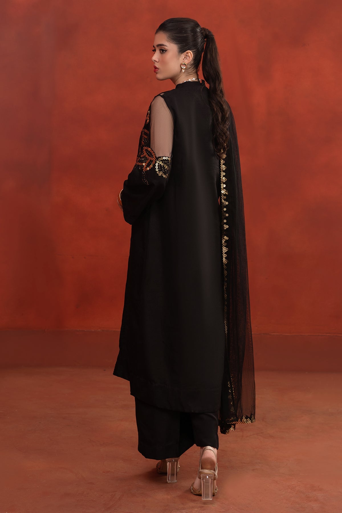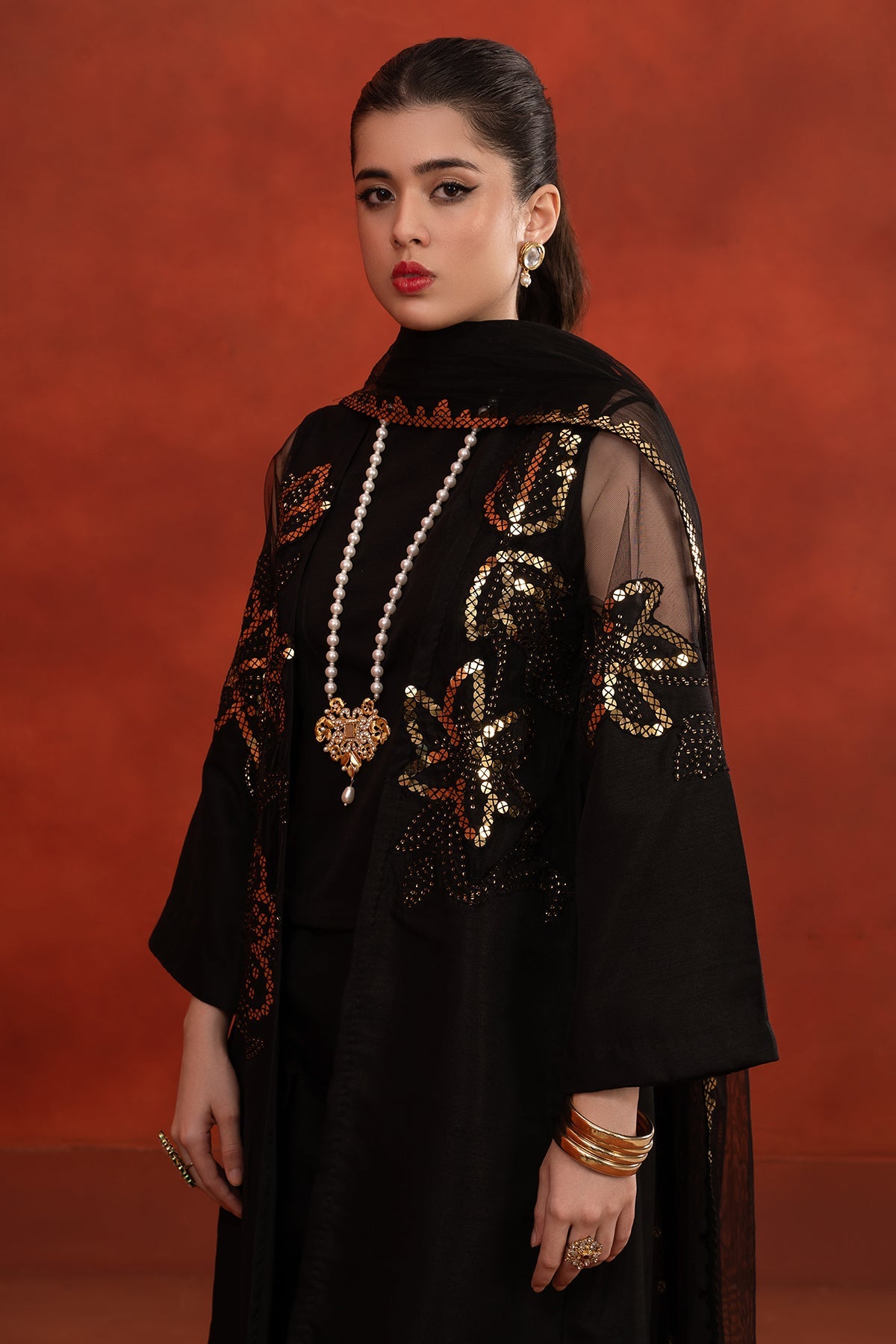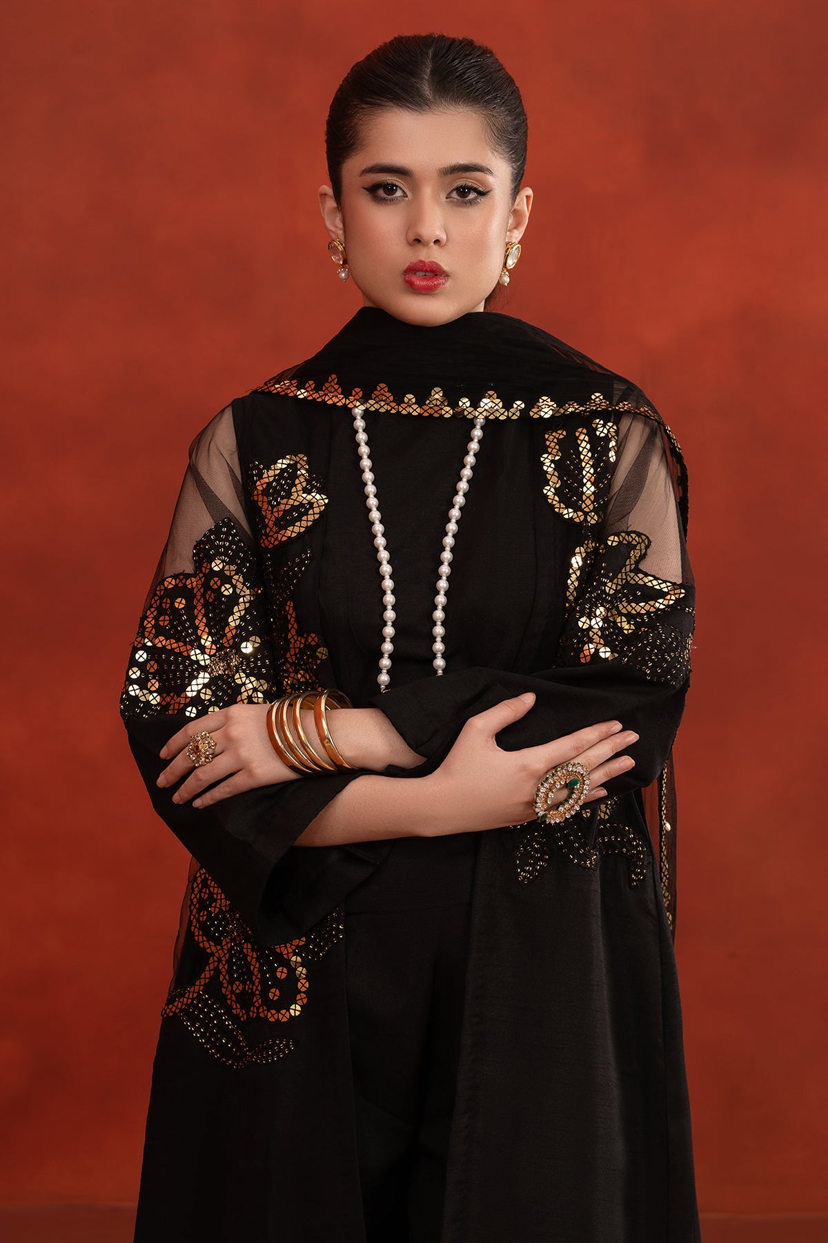 shirt : black satan silk shirt with embroidered front motifs and embroidered sleeves motifs. finished with stitching detail. trouser : black trouser. finished with stitching detail. dupatta : poly net dupatta with embroidered dupatta pallu patti. size s m l measurement length 47" 49" 51" flare/ daman width 33" 35" 37"