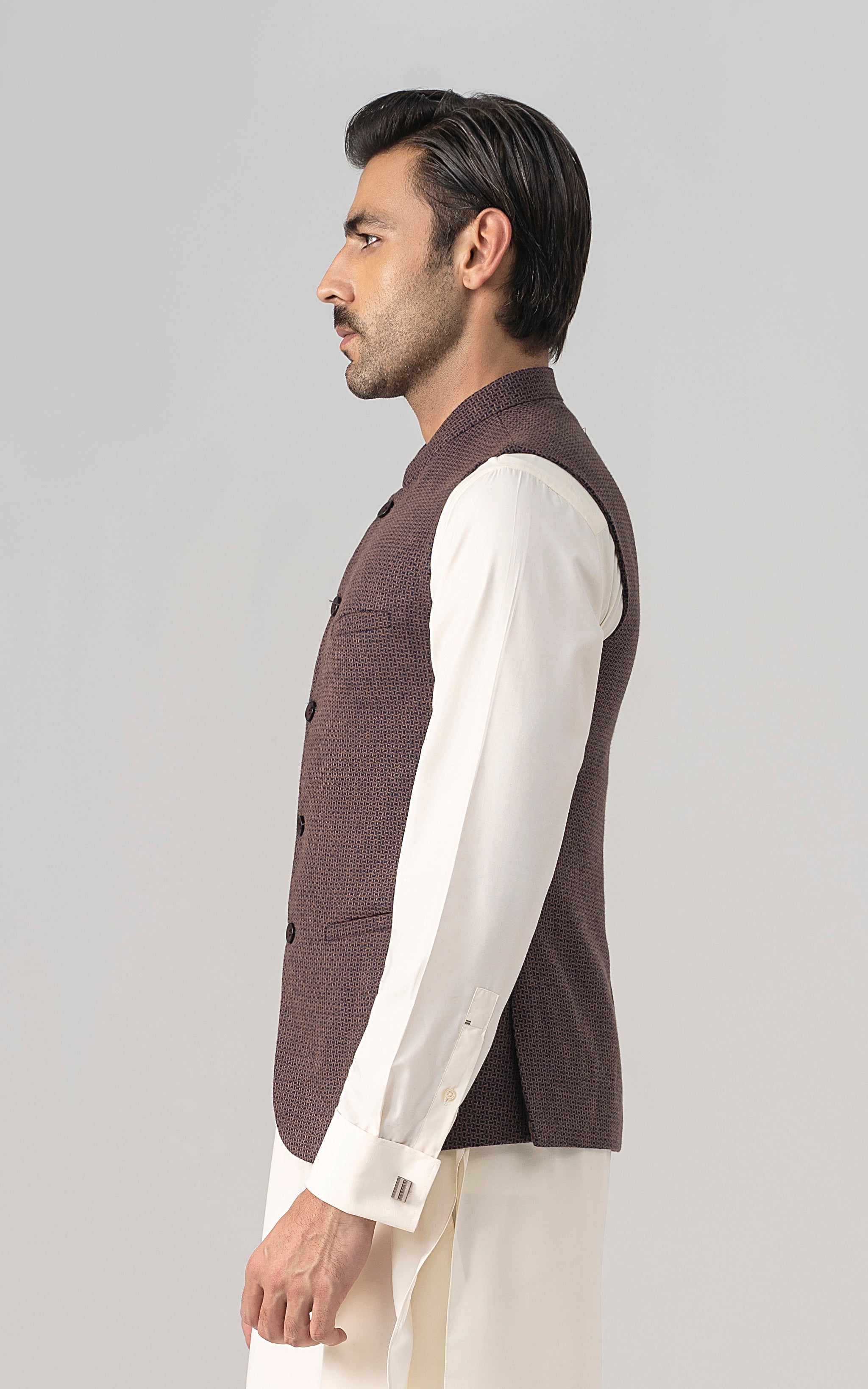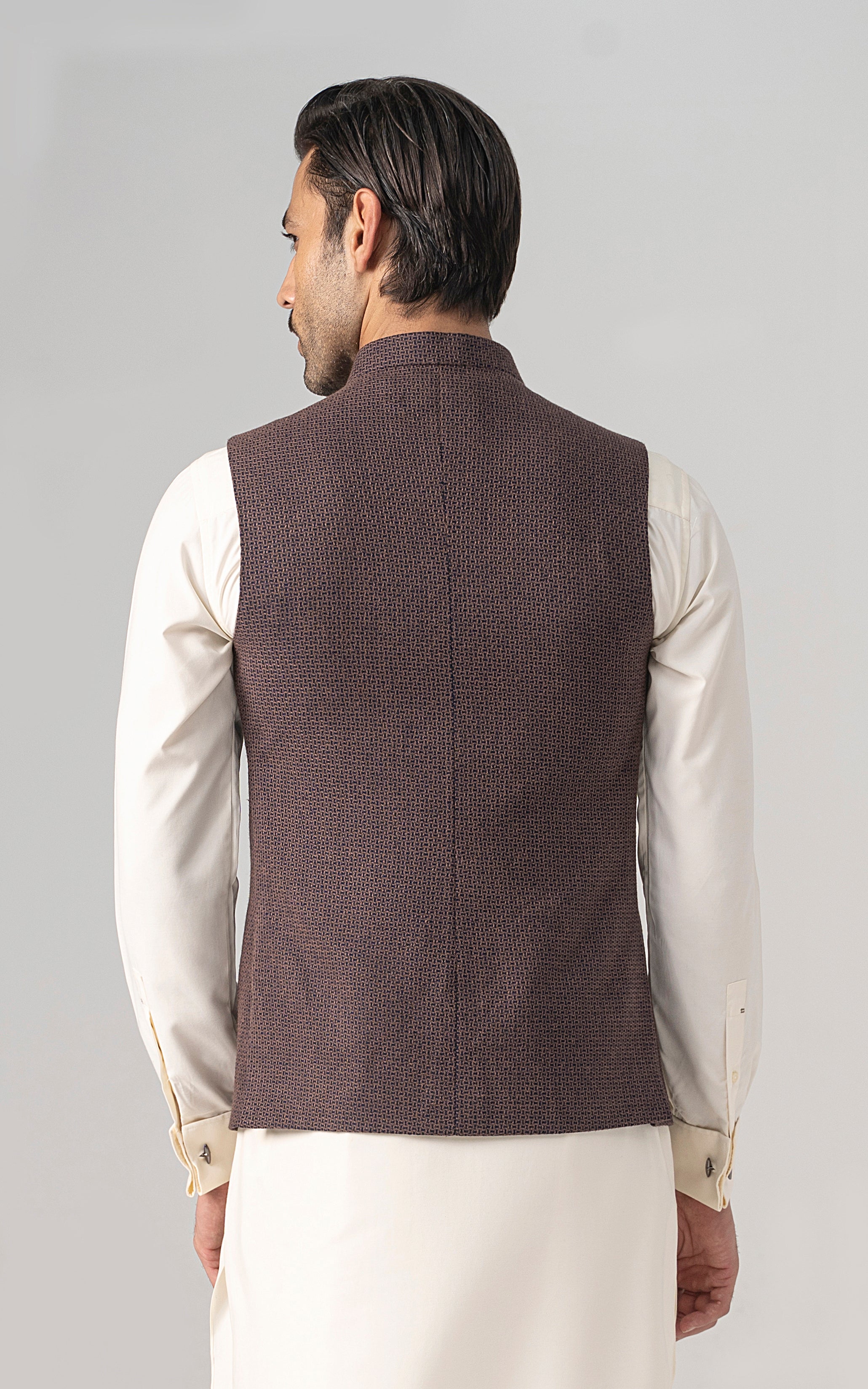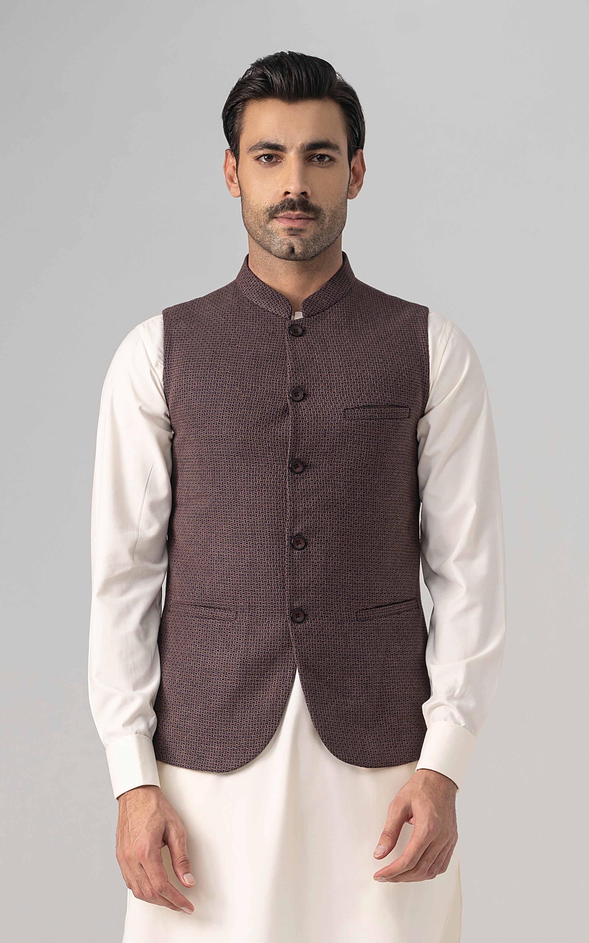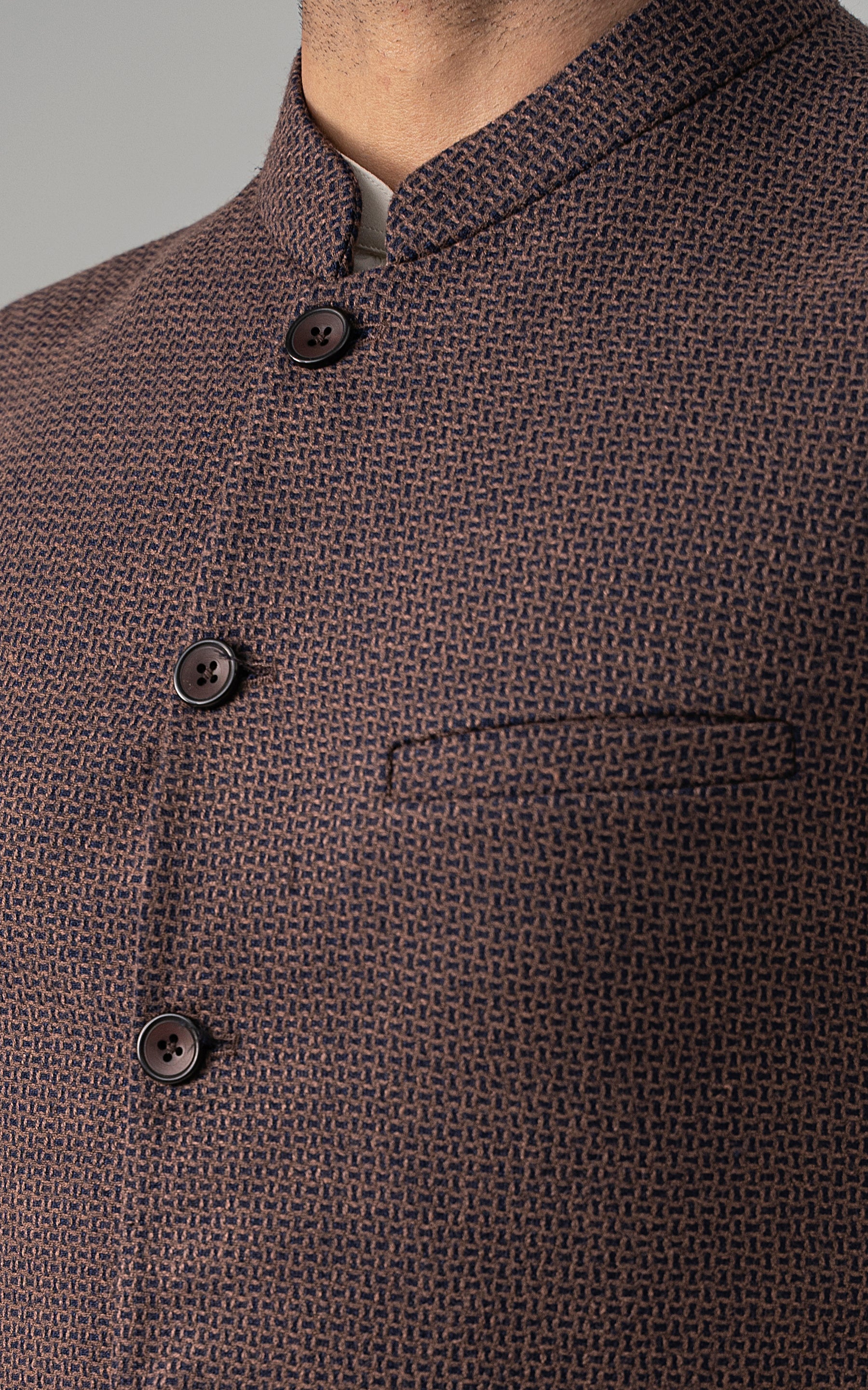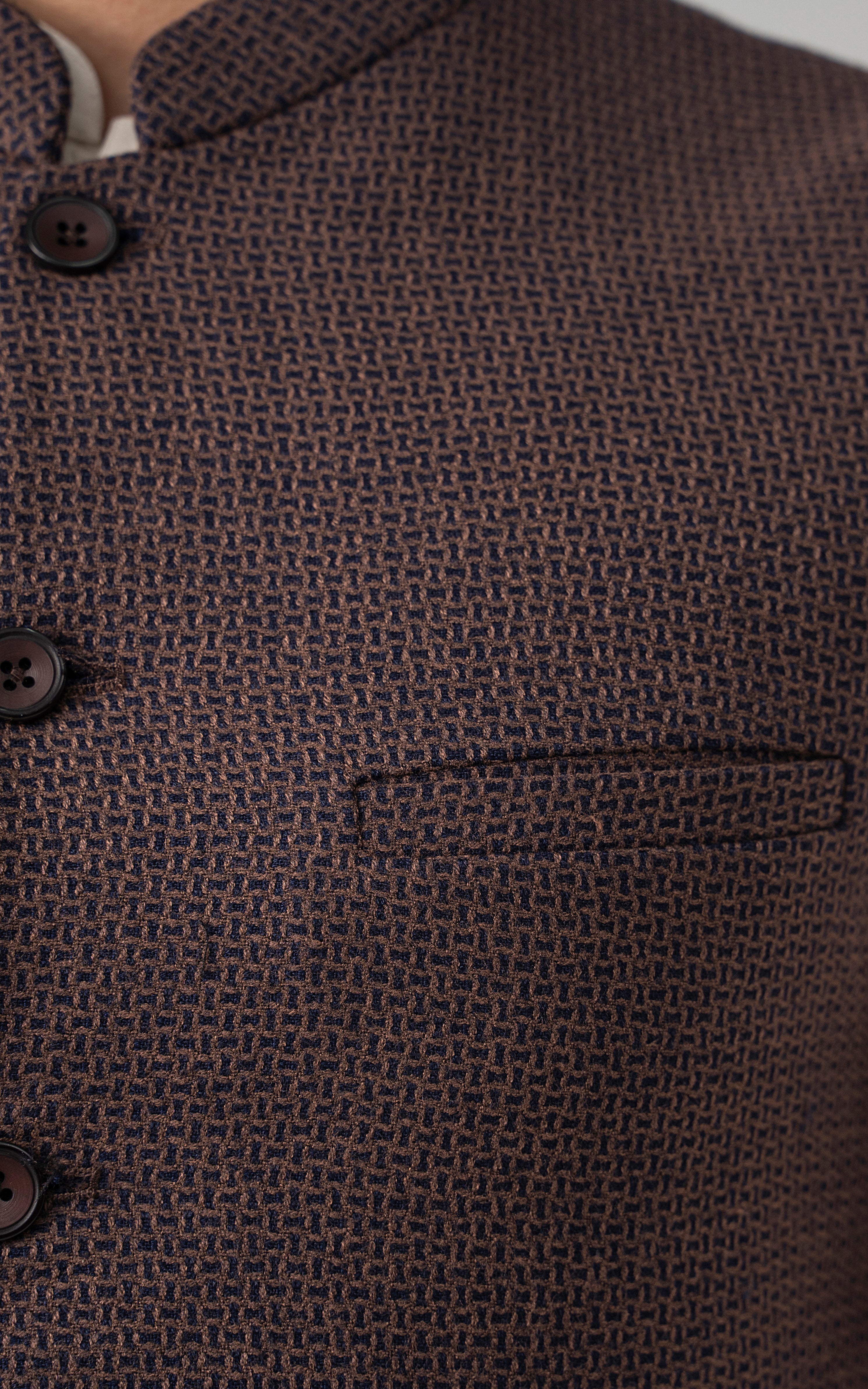 this is one of the most eminent fabric in our blended wool collection. this masterpiece is a class by itself when worn. the texture on this fabric will give you a classy look. the color palette consist of dark colors only. round ban upper front single bone pocket single bone pockets on front visible placket full contrast lining inside round hem special buttons dobby weaved woolen waistcoat