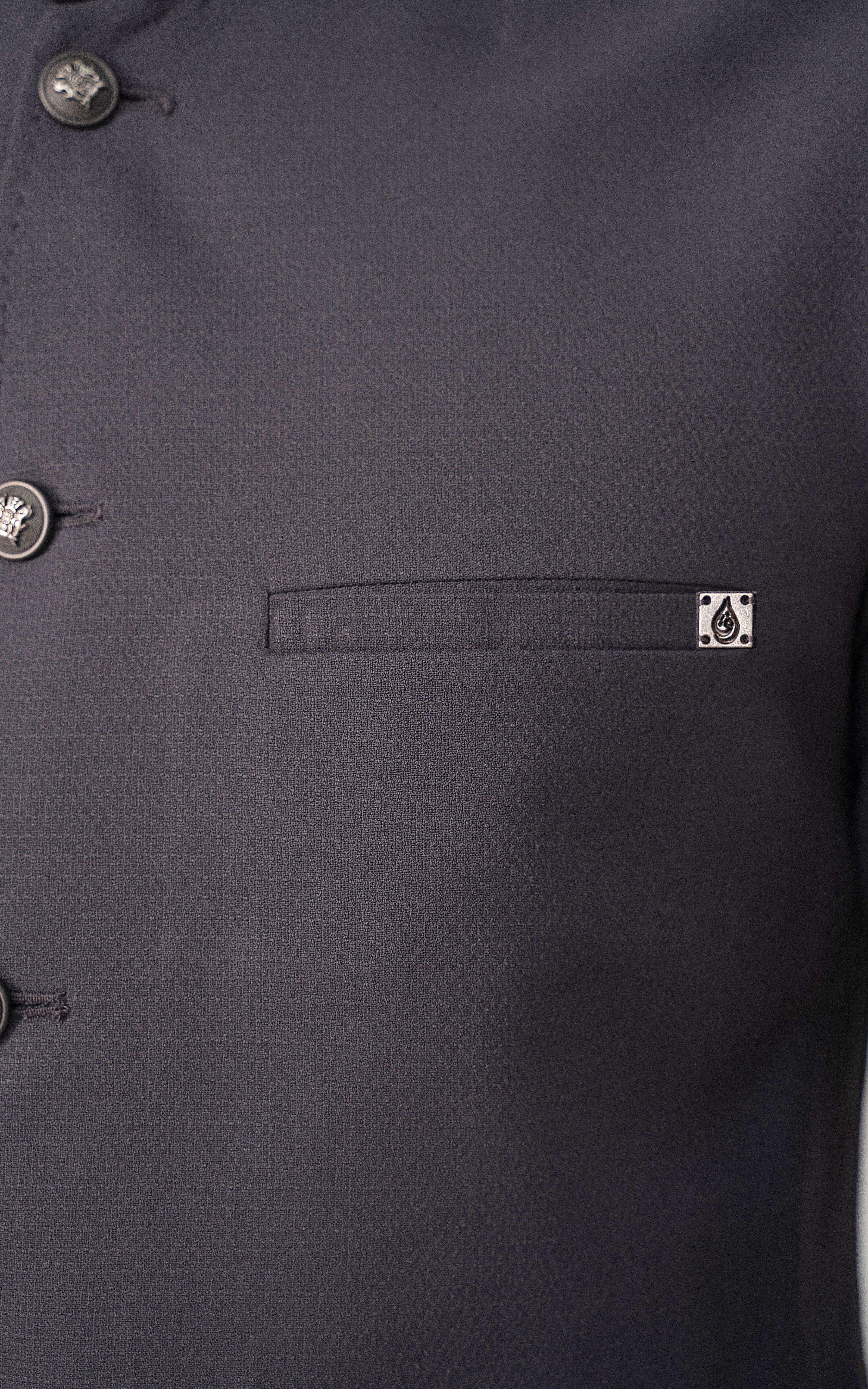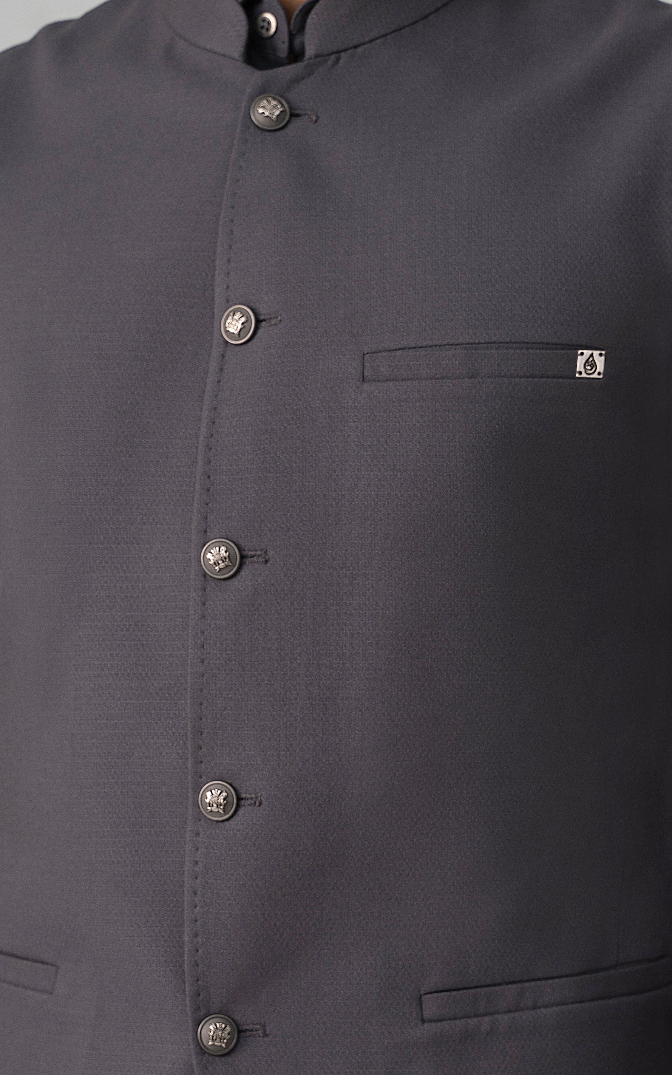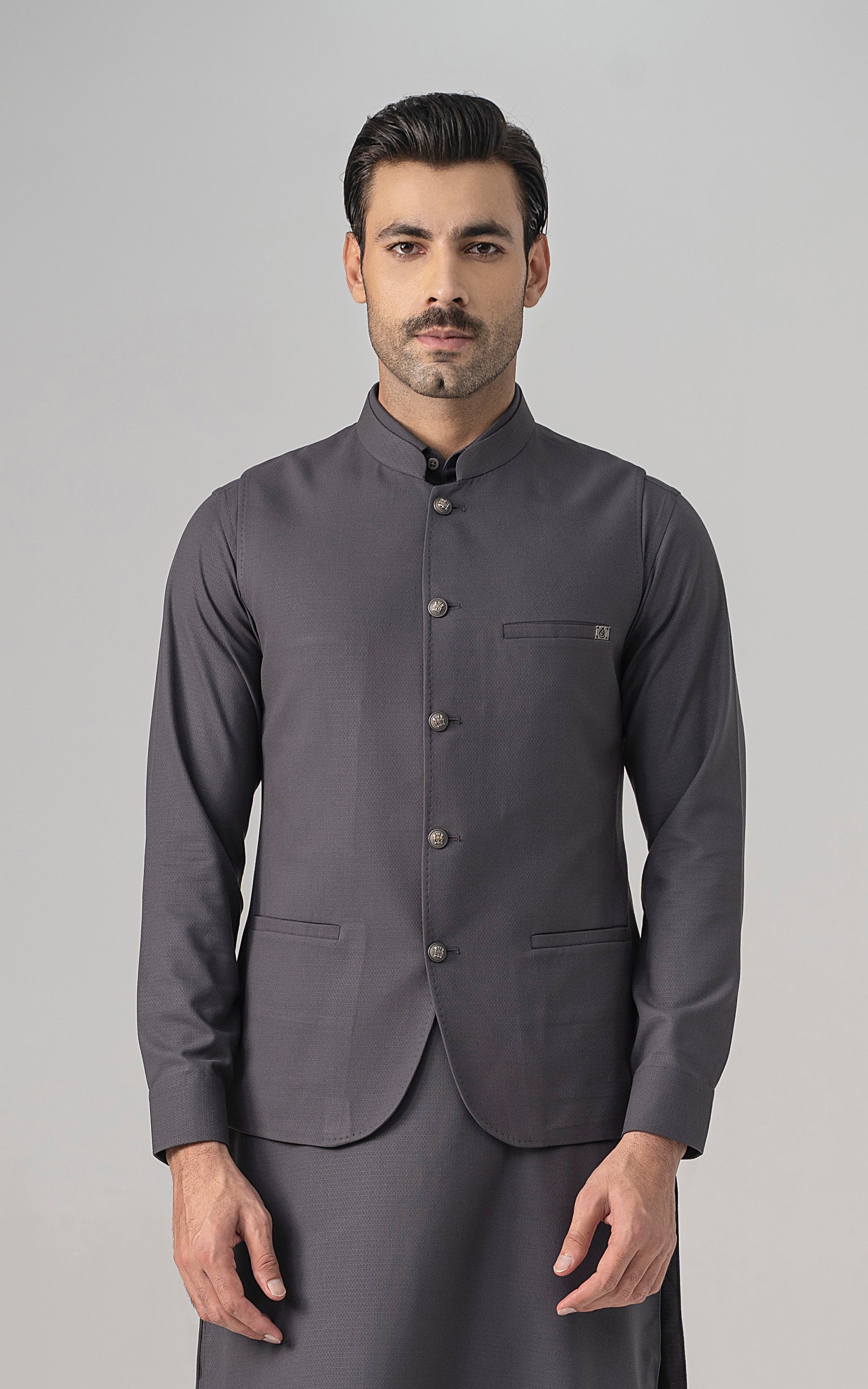 introducing this ravishing textured blended fabric to turn heads this winter. our blended waistcoat will be your rudimentary choice for both daytime and night time's special occasions. this fabric is available in wondrous light, medium and dark hues. round ban upper front single bone pocket trim detail on bone pocket single bone pockets on front pleats on front visible placket full contrast lining inside round hem special buttons textured dobby fabric