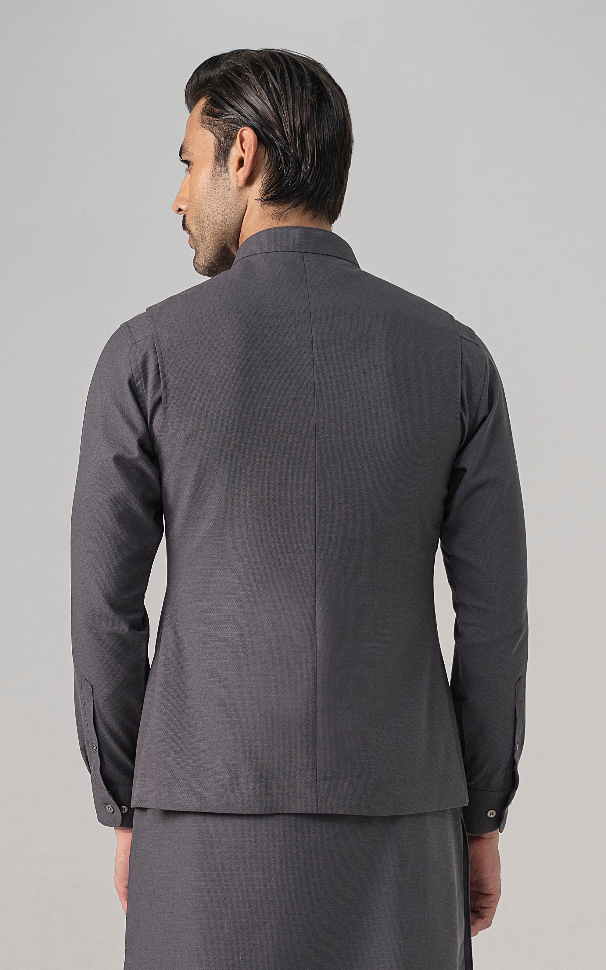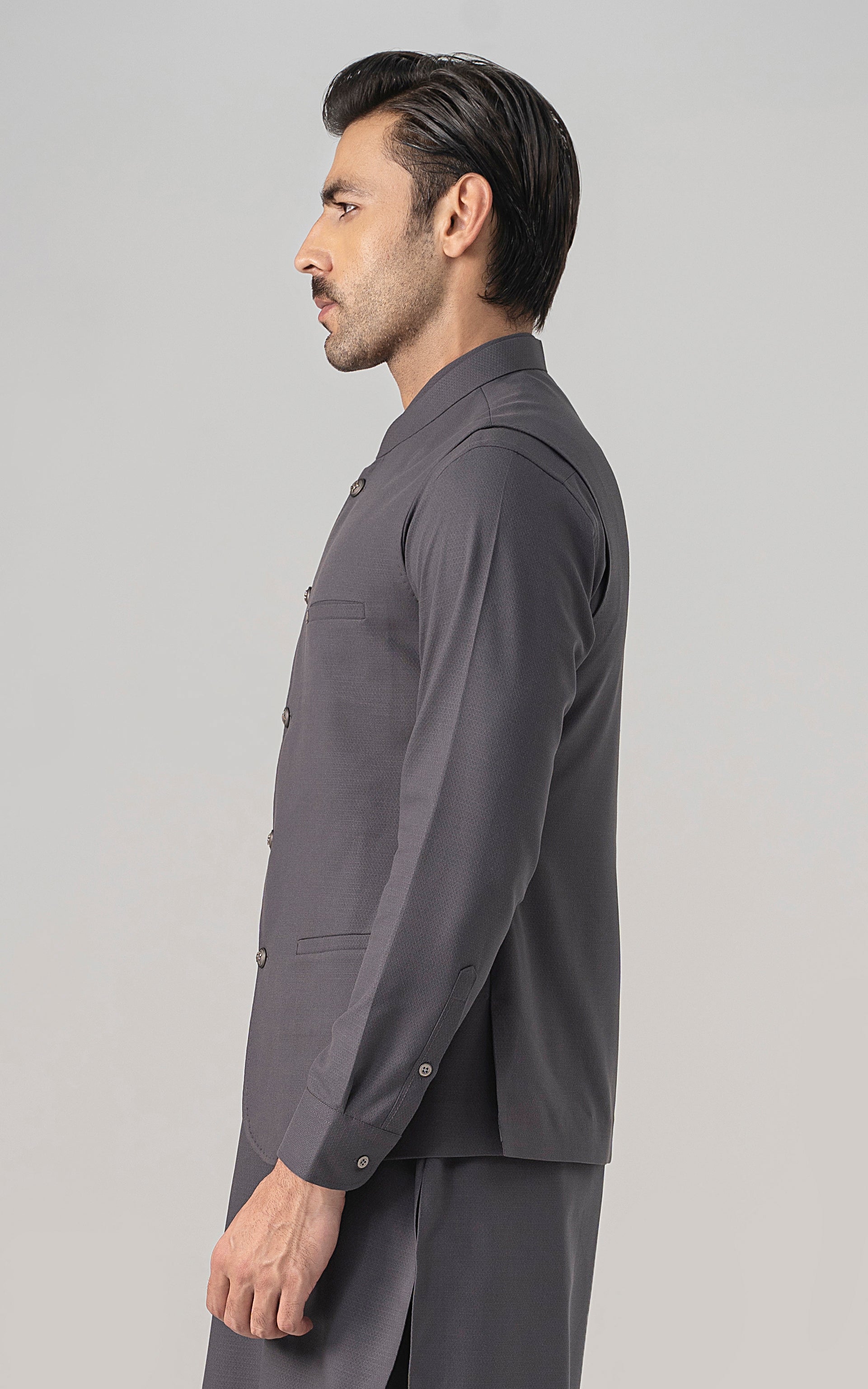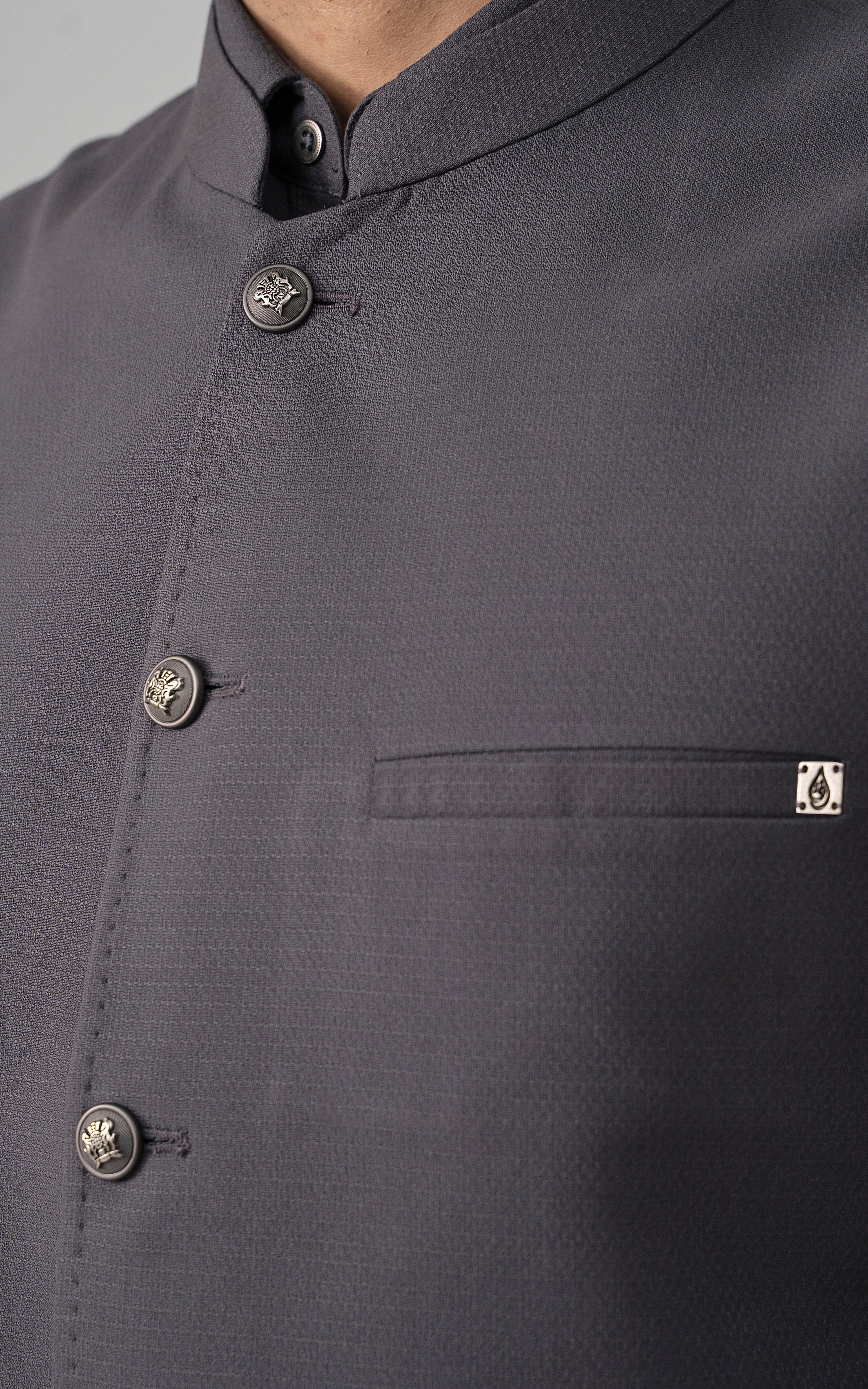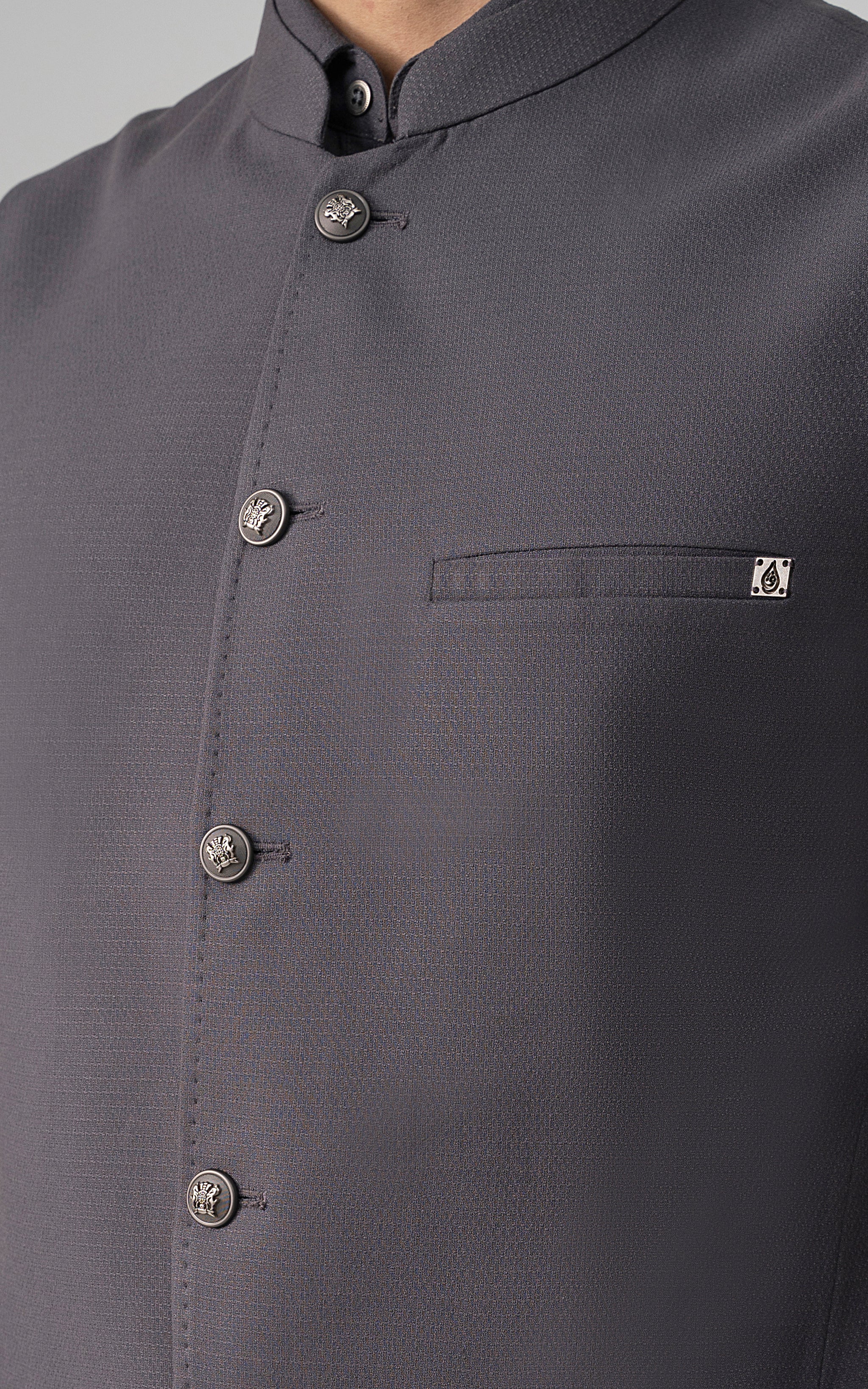 introducing this ravishing textured blended fabric to turn heads this winter. our blended waistcoat will be your rudimentary choice for both daytime and night time's special occasions. this fabric is available in wondrous light, medium and dark hues. round ban upper front single bone pocket trim detail on bone pocket single bone pockets on front pleats on front visible placket full contrast lining inside round hem special buttons textured dobby fabric