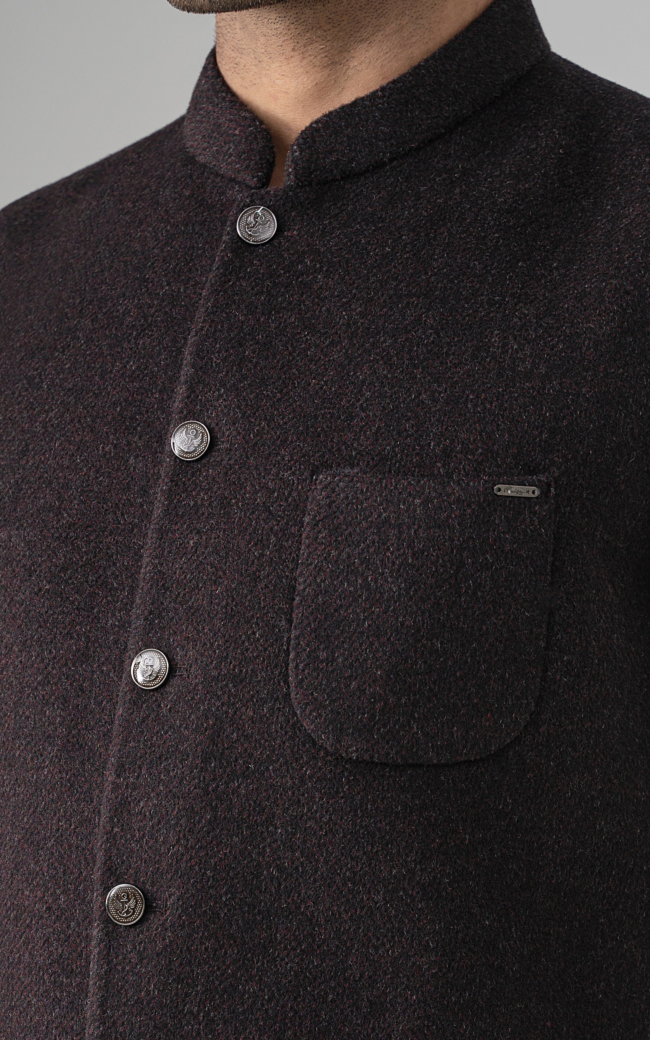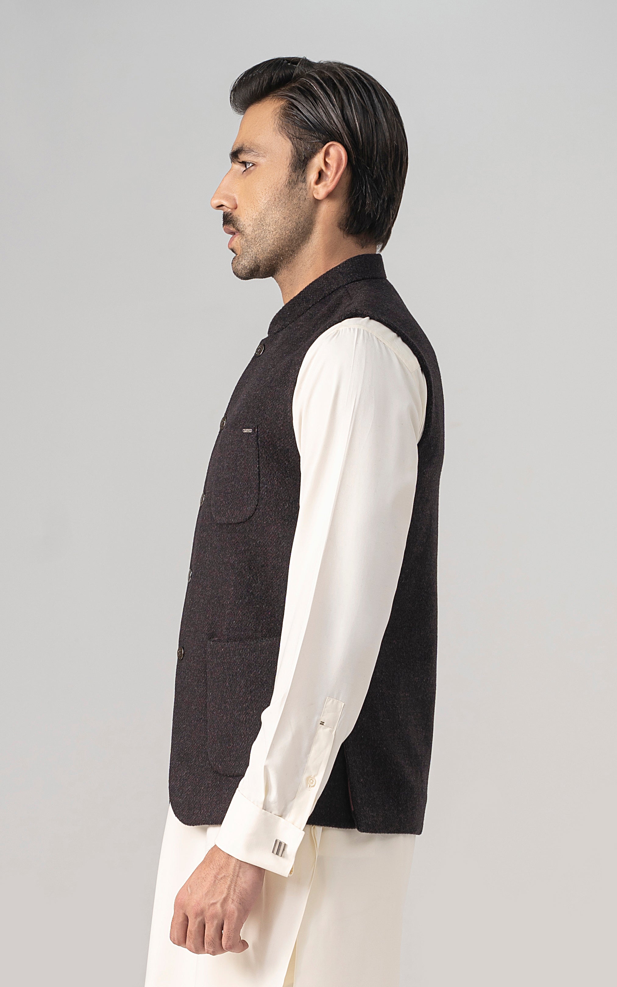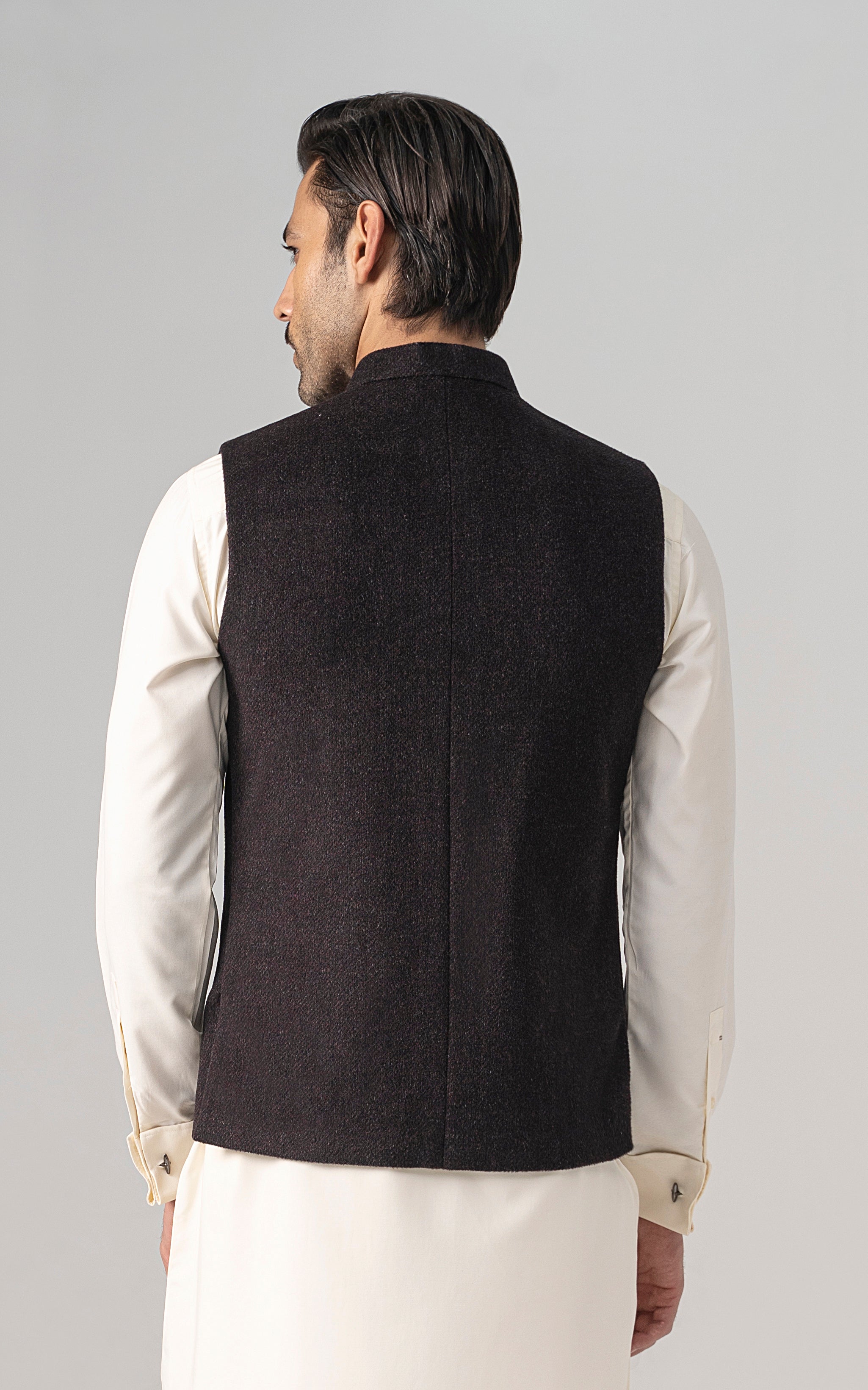 this is one of the most eminent fabric in our blended wool collection. this masterpiece is a class by itself when worn. the texture on this fabric will give you a classy look. the color palette consist of dark colors only. straight ban upper front patch pocket with trim detail patch pockets on front visible placket full contrast lining inside round hem special buttons textured woolen waistcoat