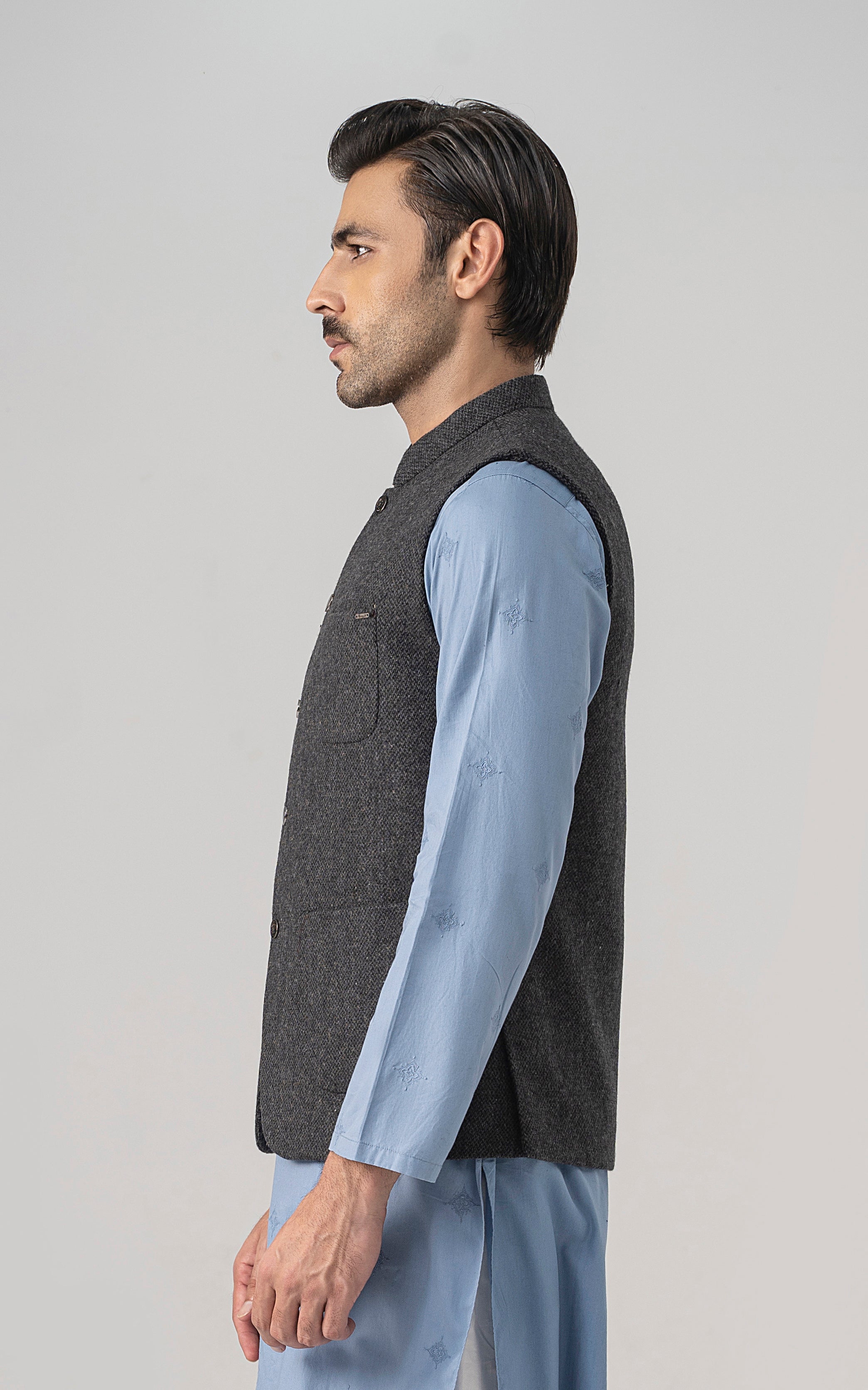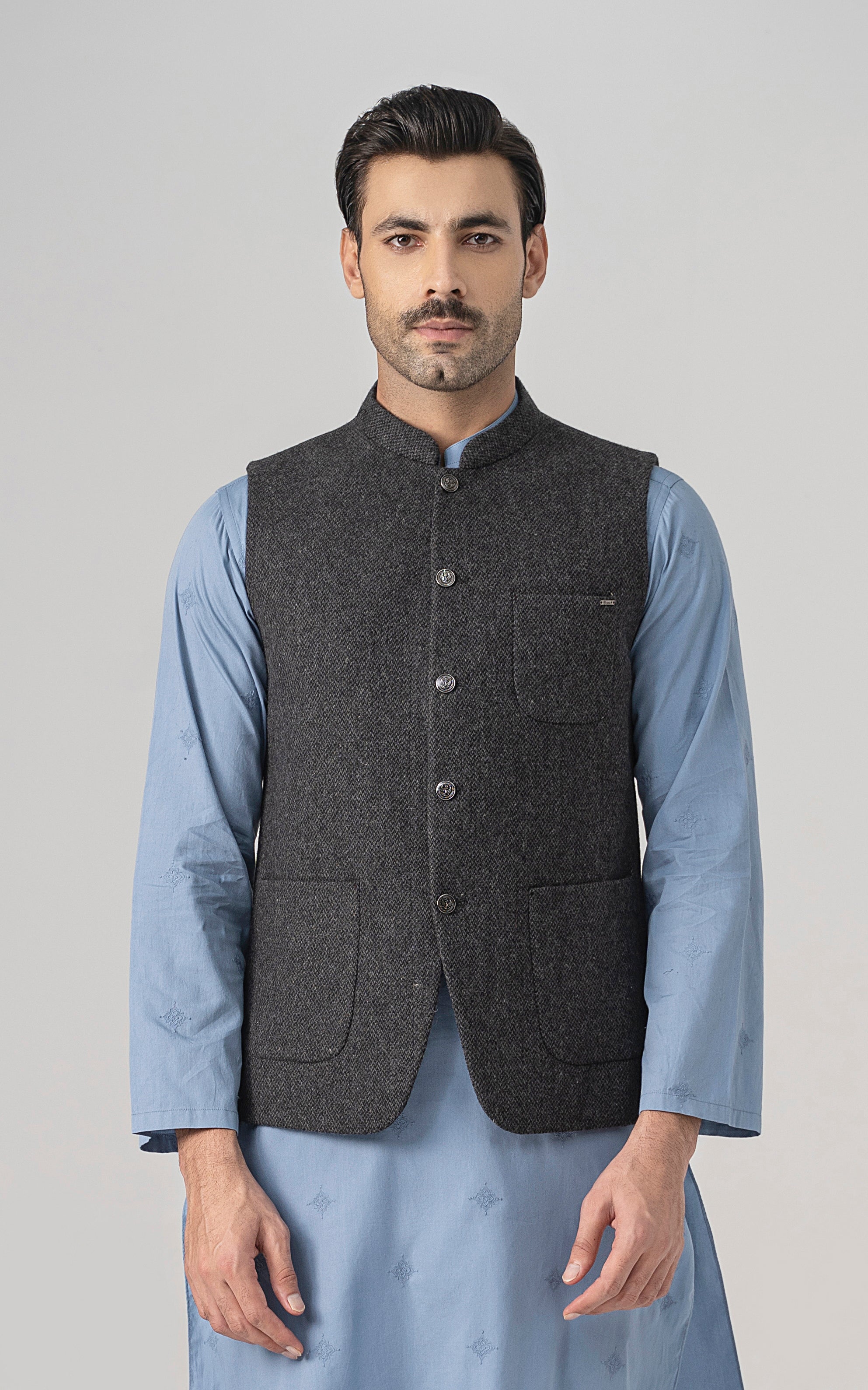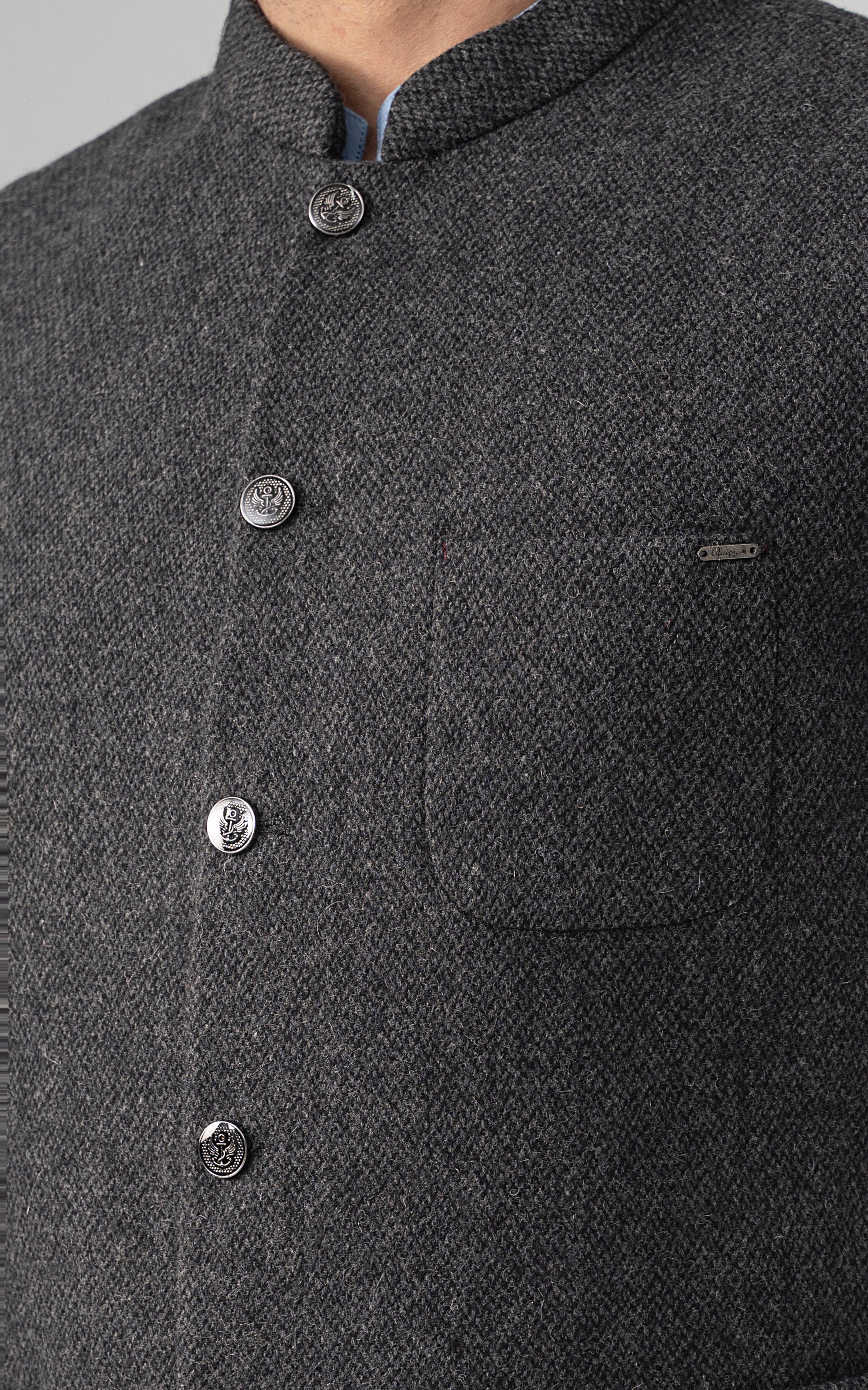 this is one of the most eminent fabric in our blended wool collection. this masterpiece is a class by itself when worn. the texture on this fabric will give you a classy look. the color palette consist of dark colors only. straight ban upper front patch pocket with trim detail patch pockets on front visible placket full contrast lining inside round hem special buttons textured woolen waistcoat