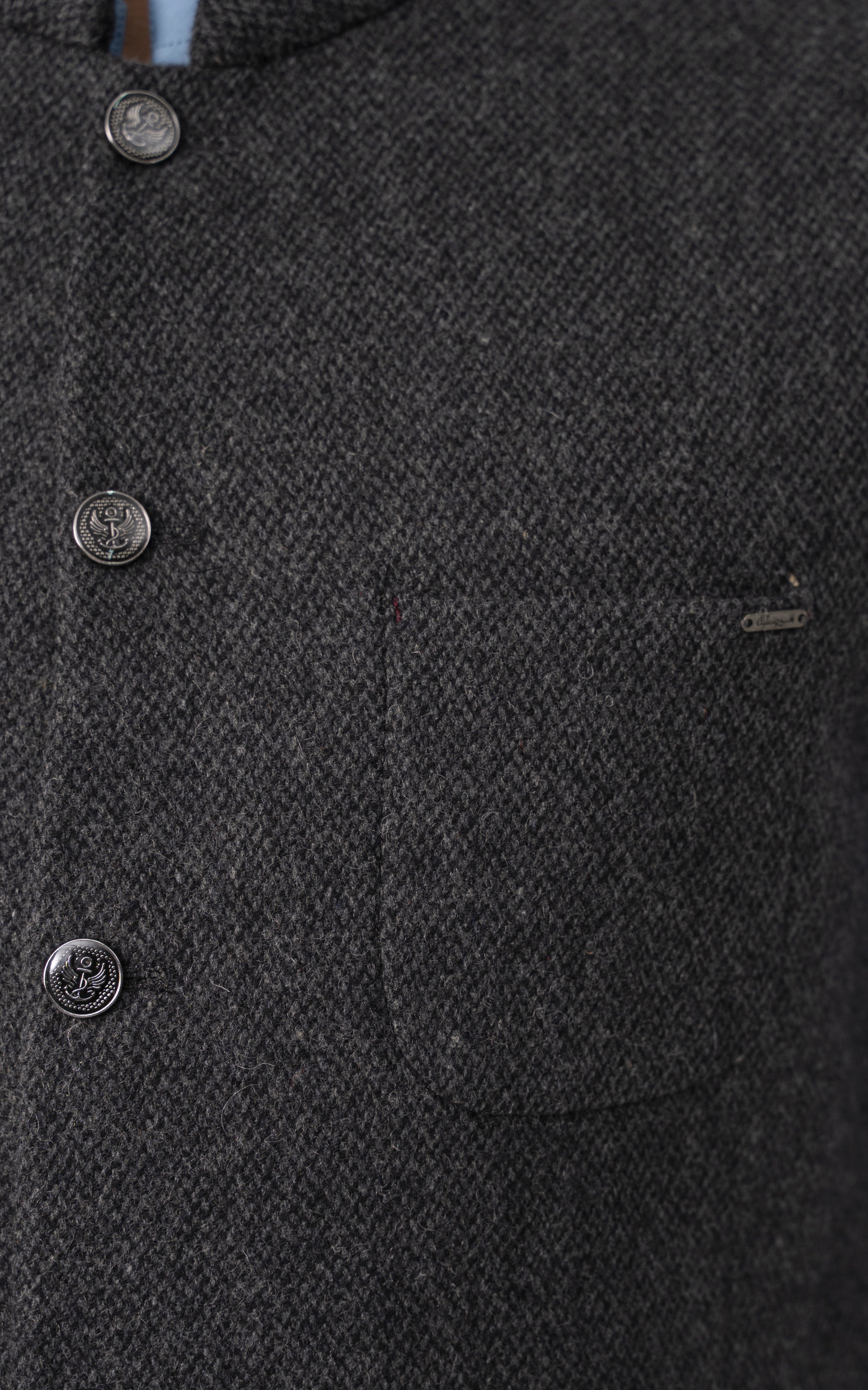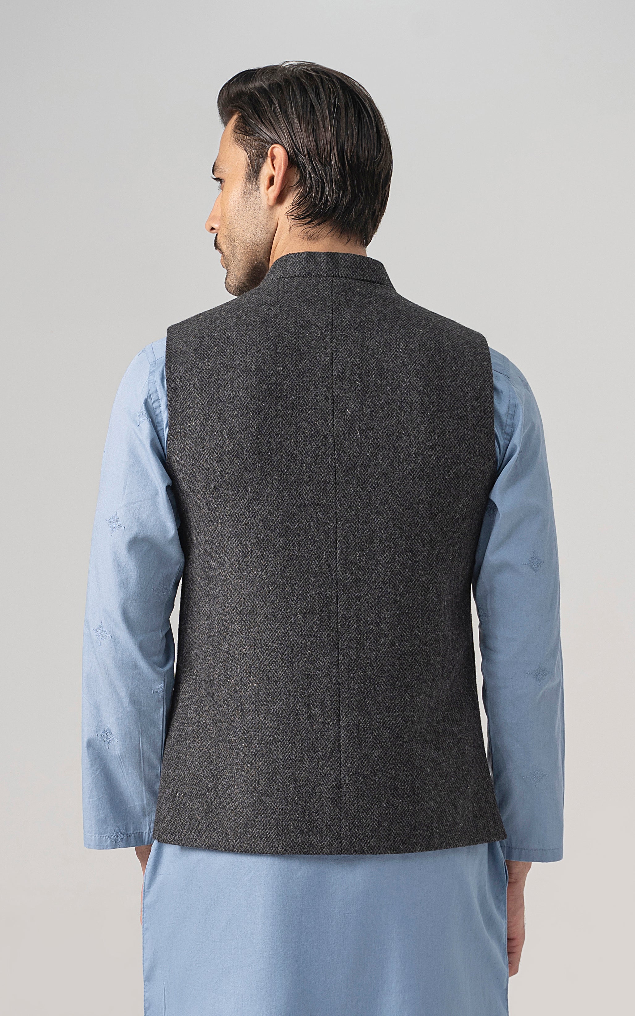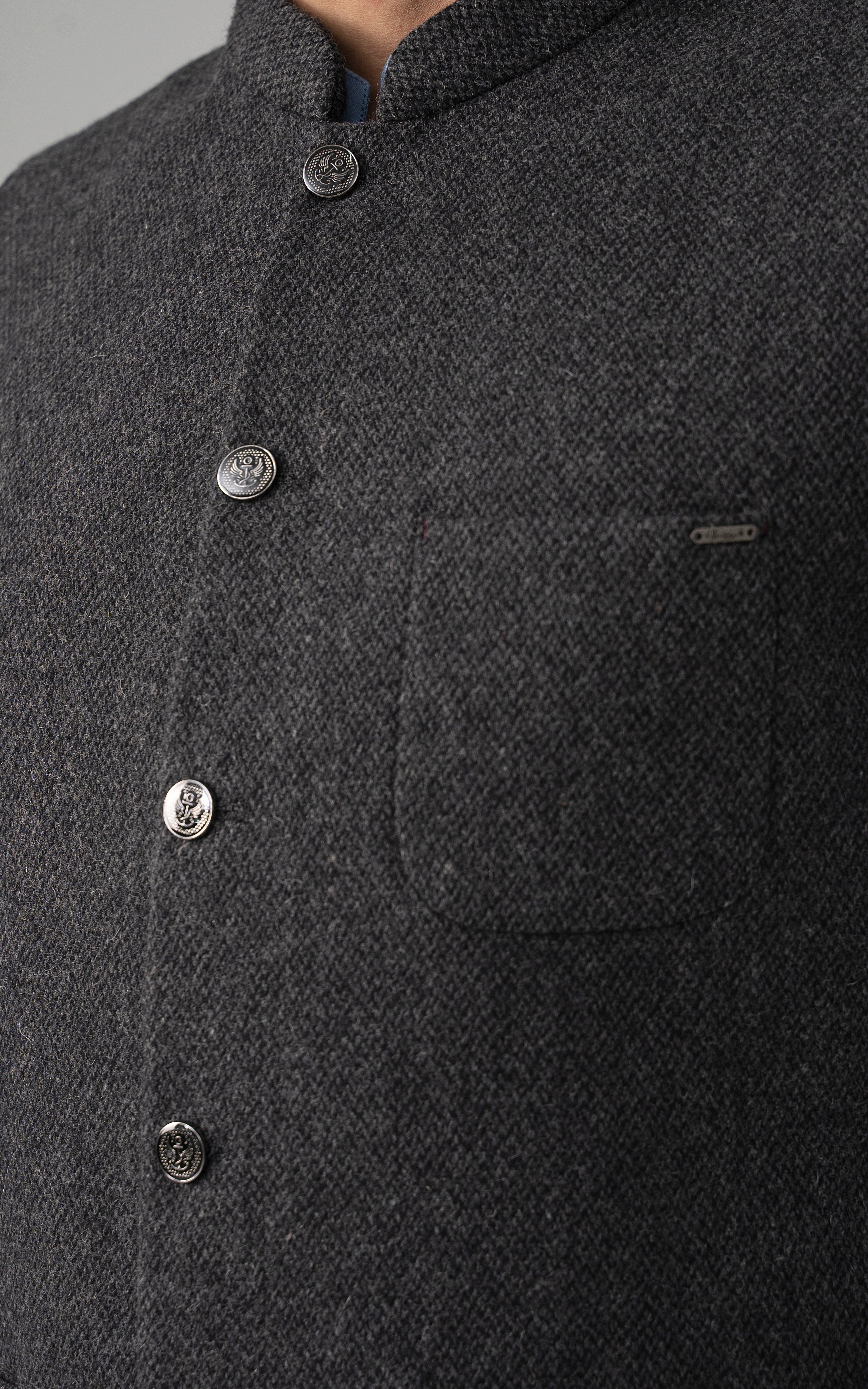 this is one of the most eminent fabric in our blended wool collection. this masterpiece is a class by itself when worn. the texture on this fabric will give you a classy look. the color palette consist of dark colors only. straight ban upper front patch pocket with trim detail patch pockets on front visible placket full contrast lining inside round hem special buttons textured woolen waistcoat