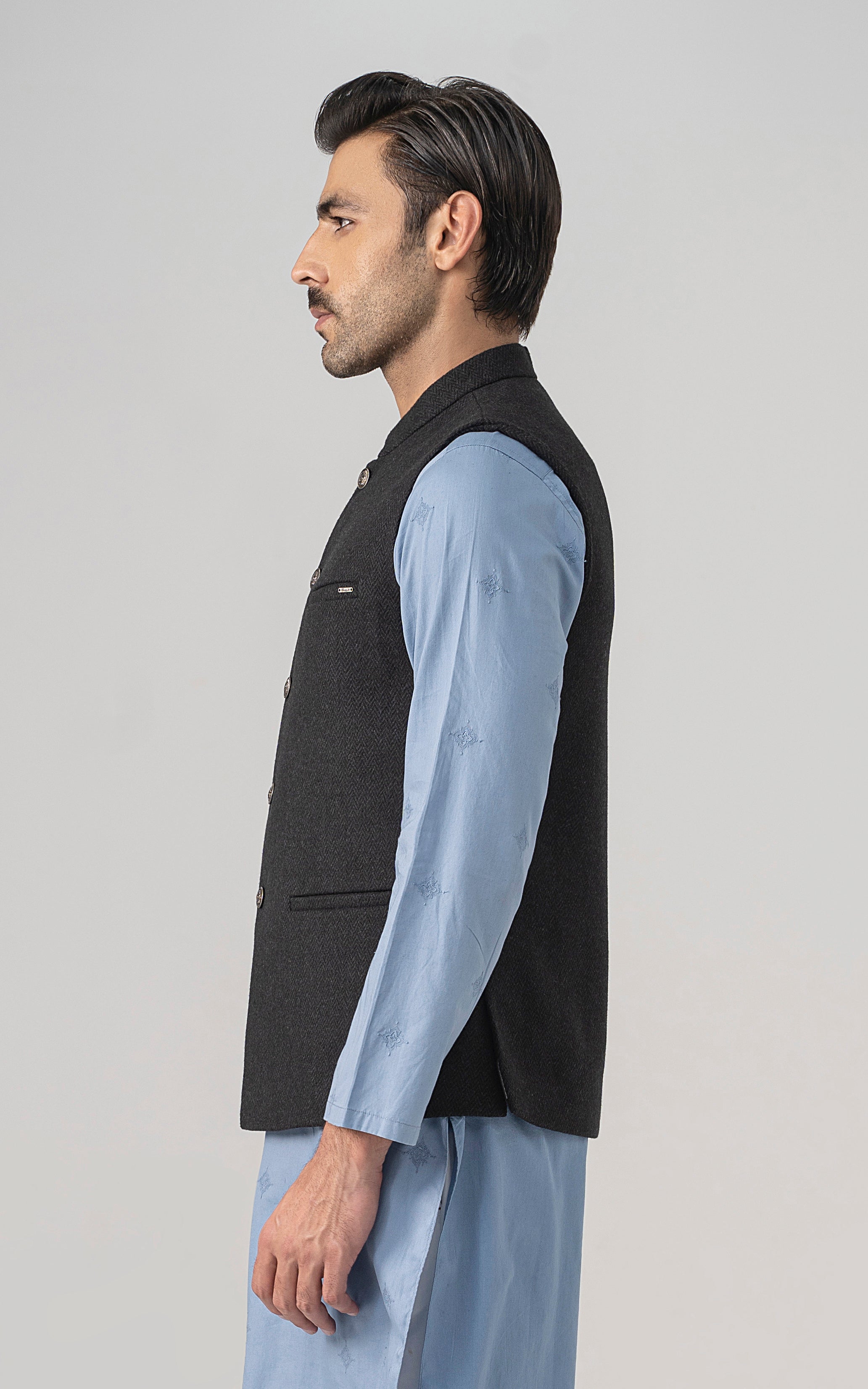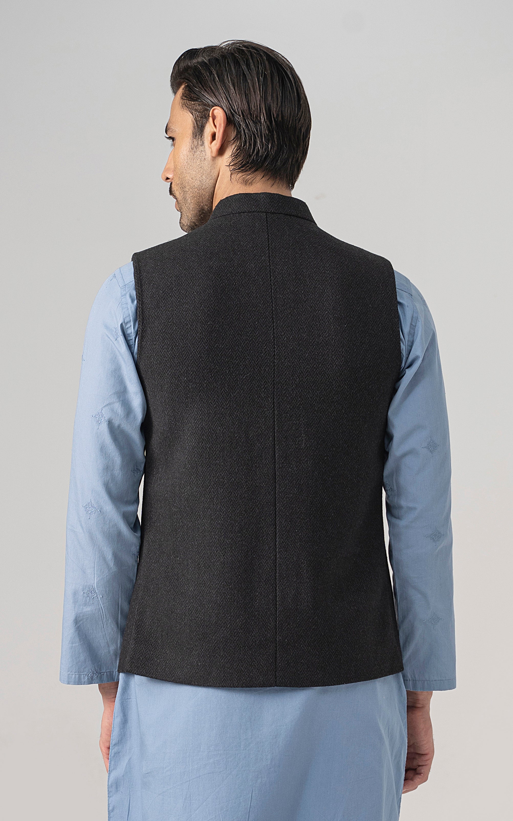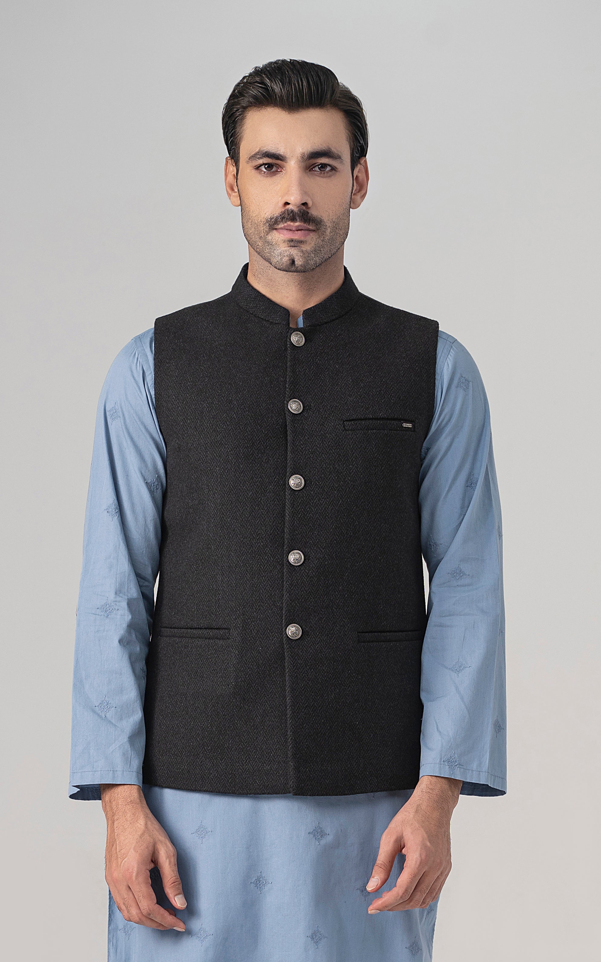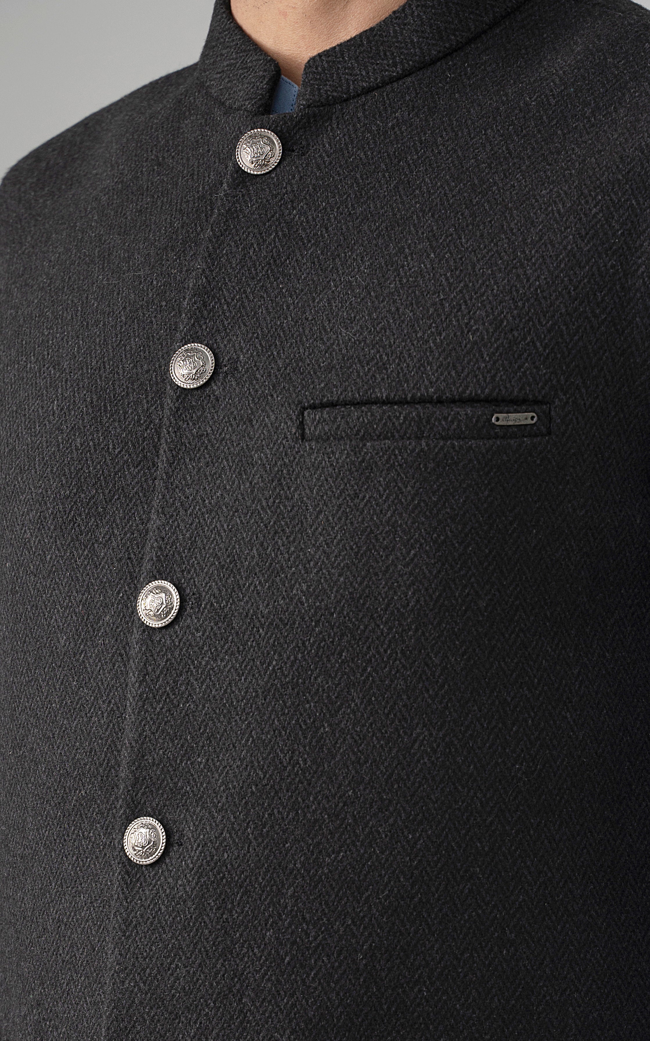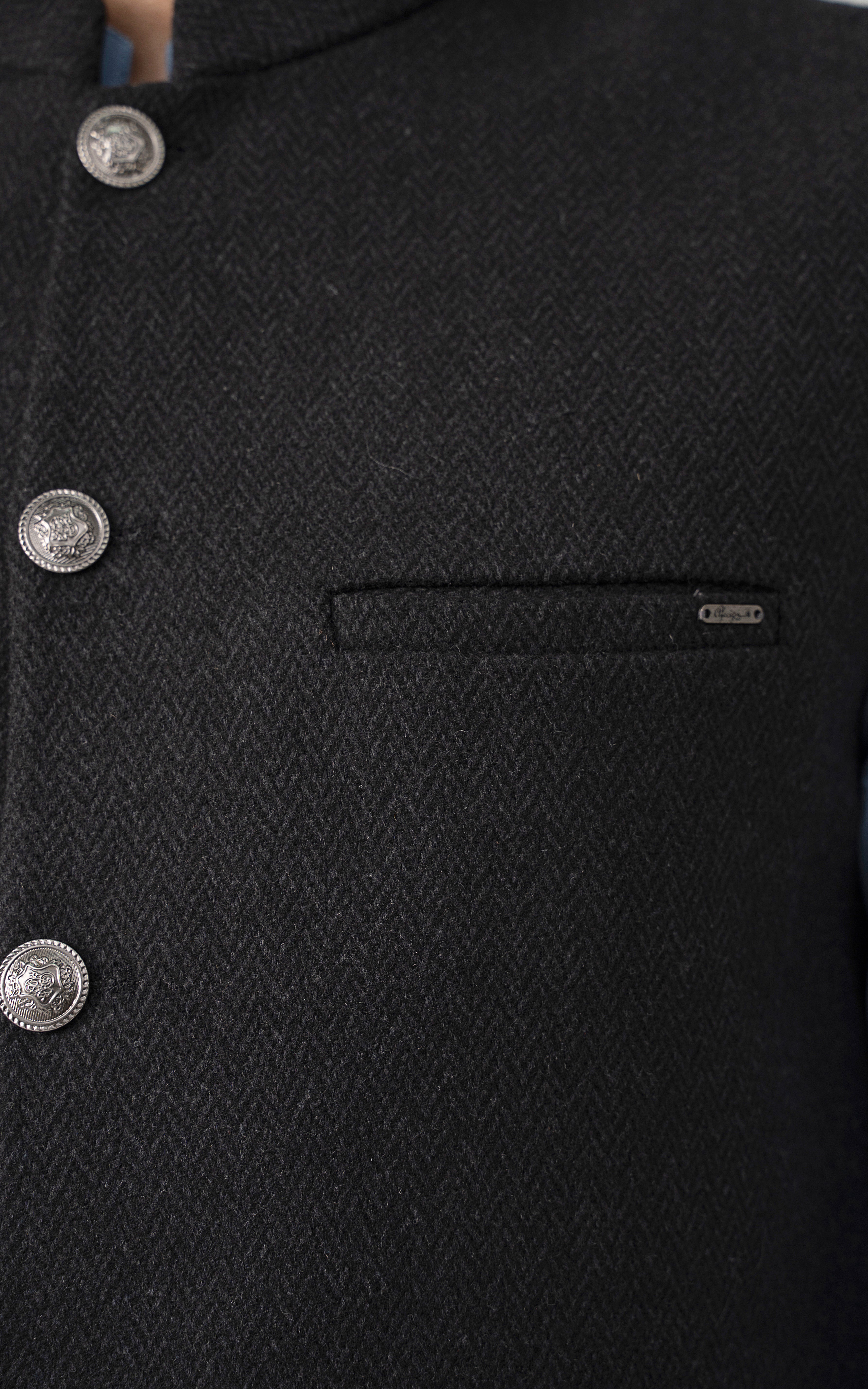 this is one of the most eminent fabric in our blended wool collection. this masterpiece is a class by itself when worn. this astonishing wool blend is an excellent fabric which will give you a classy look. it has only dark colors in its palette. straight ban upper front single bone pocket with trim detail single bone pockets on front visible placket full contrast lining inside straight hem special buttons textured woolen waistcoat