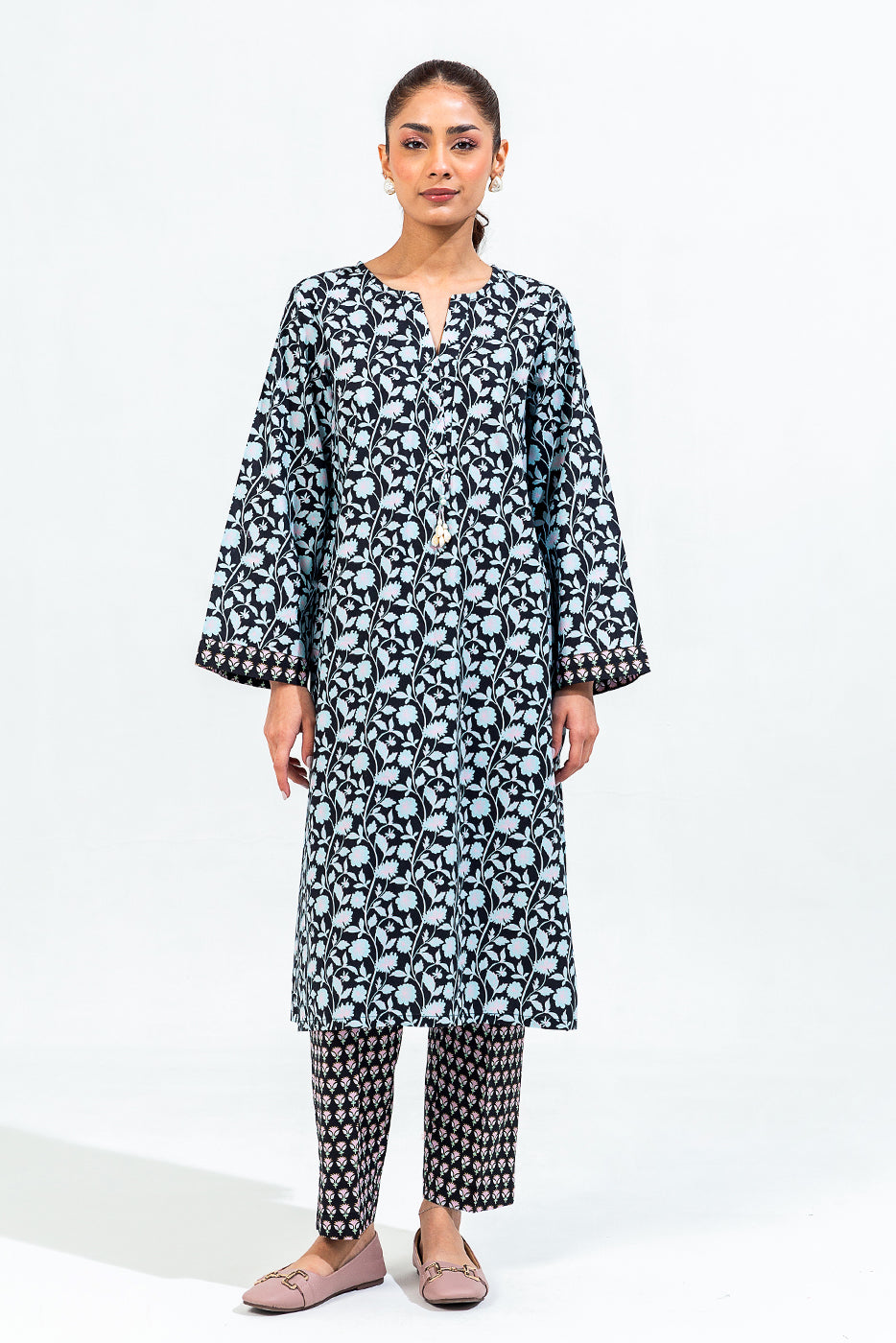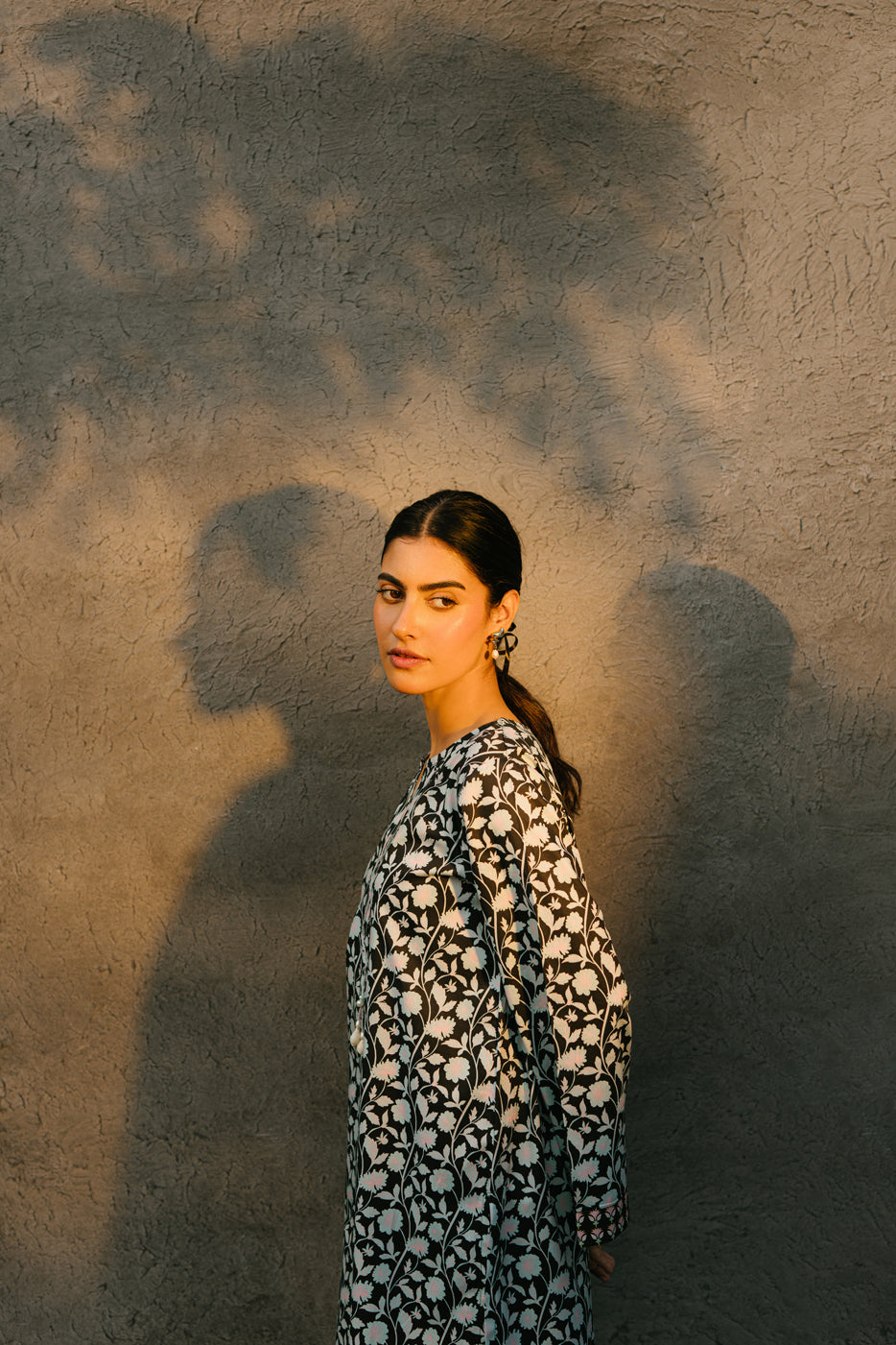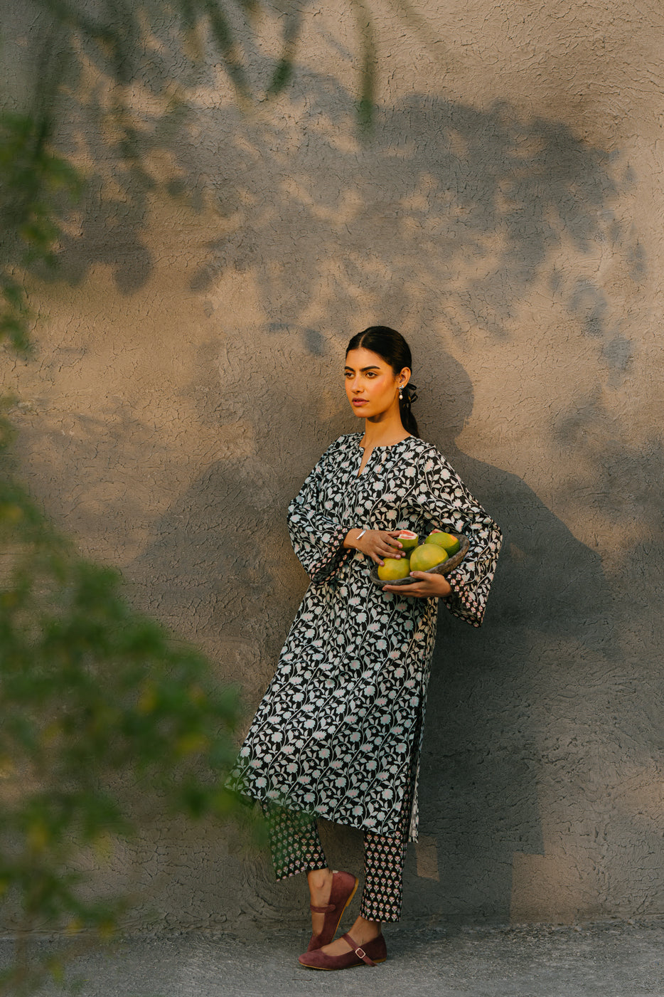 description: digital printed shirt with handwork detail on front placket. matching separates: ( matching pants available in matching separates tab ) fabric: cambric what you'll get: shirt fit: casual fit size & fit: model height is 5'6" model is wearing 8 size