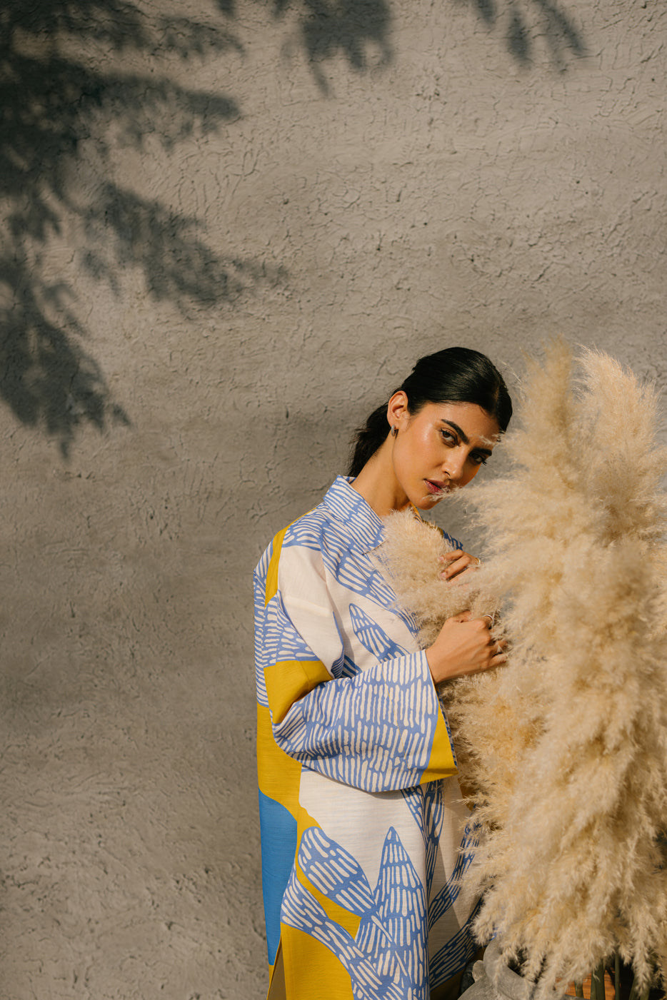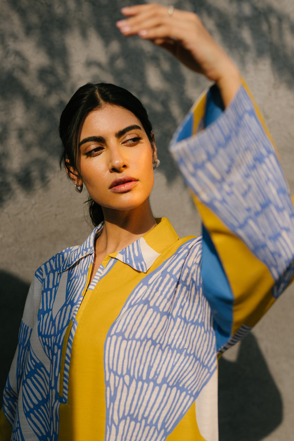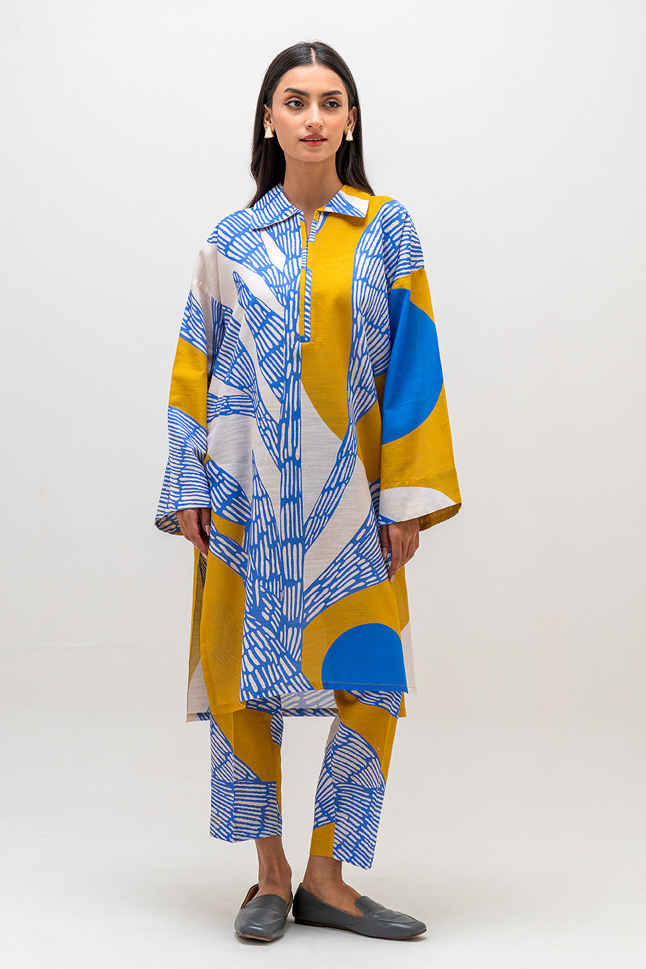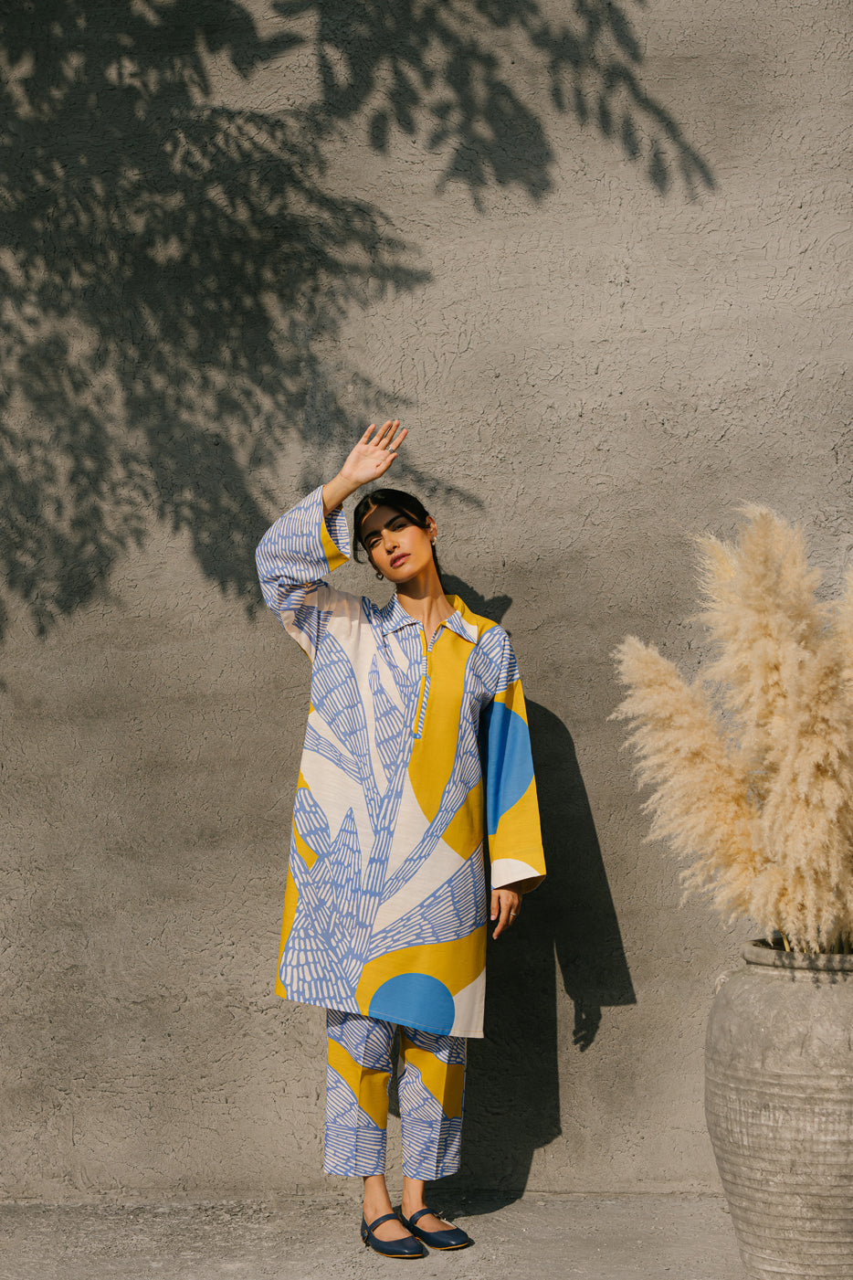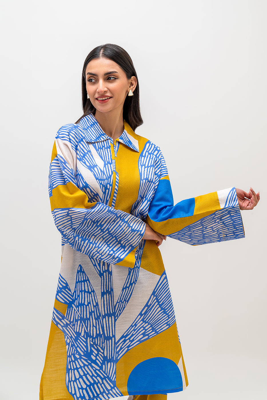 description: basic printed with collar and placket and extended shoulder cutline. matching separates: ( matching pants available in matching separates tab ) fabric: khaddar what you'll get: shirt fit: casual fit size & fit: model height is 5'6" model is wearing 8 size