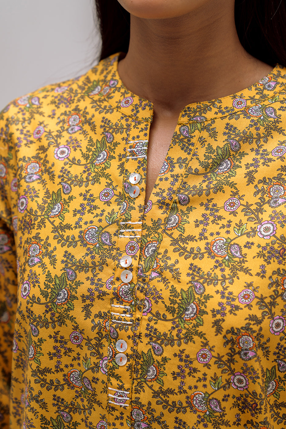 description: digital printed shirt with button detail on placket. matching separates: ( matching pants available in matching separates tab ) fabric: cambric what you'll get: shirt fit: casual fit size & fit: model height is 5'6" model is wearing 8 size