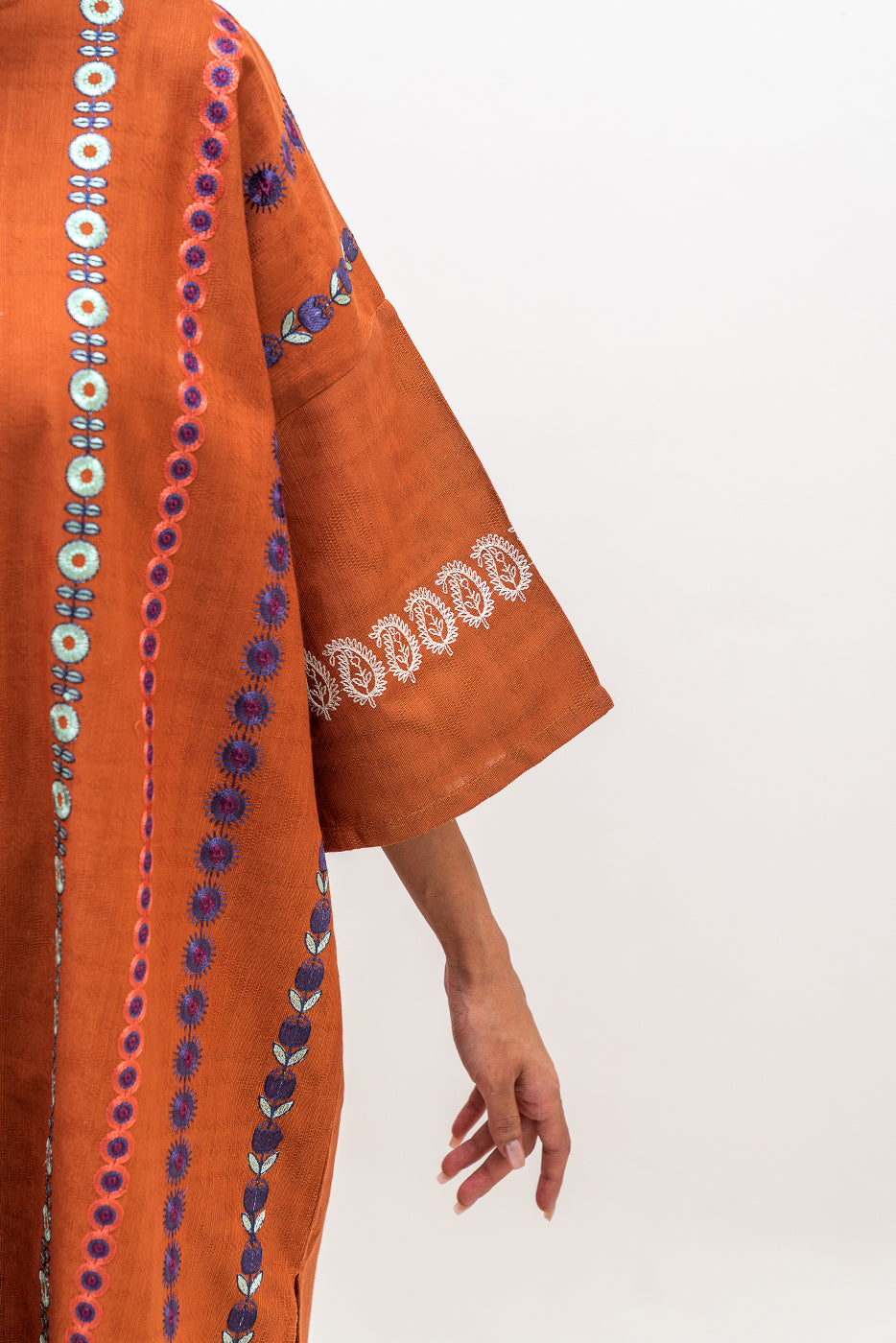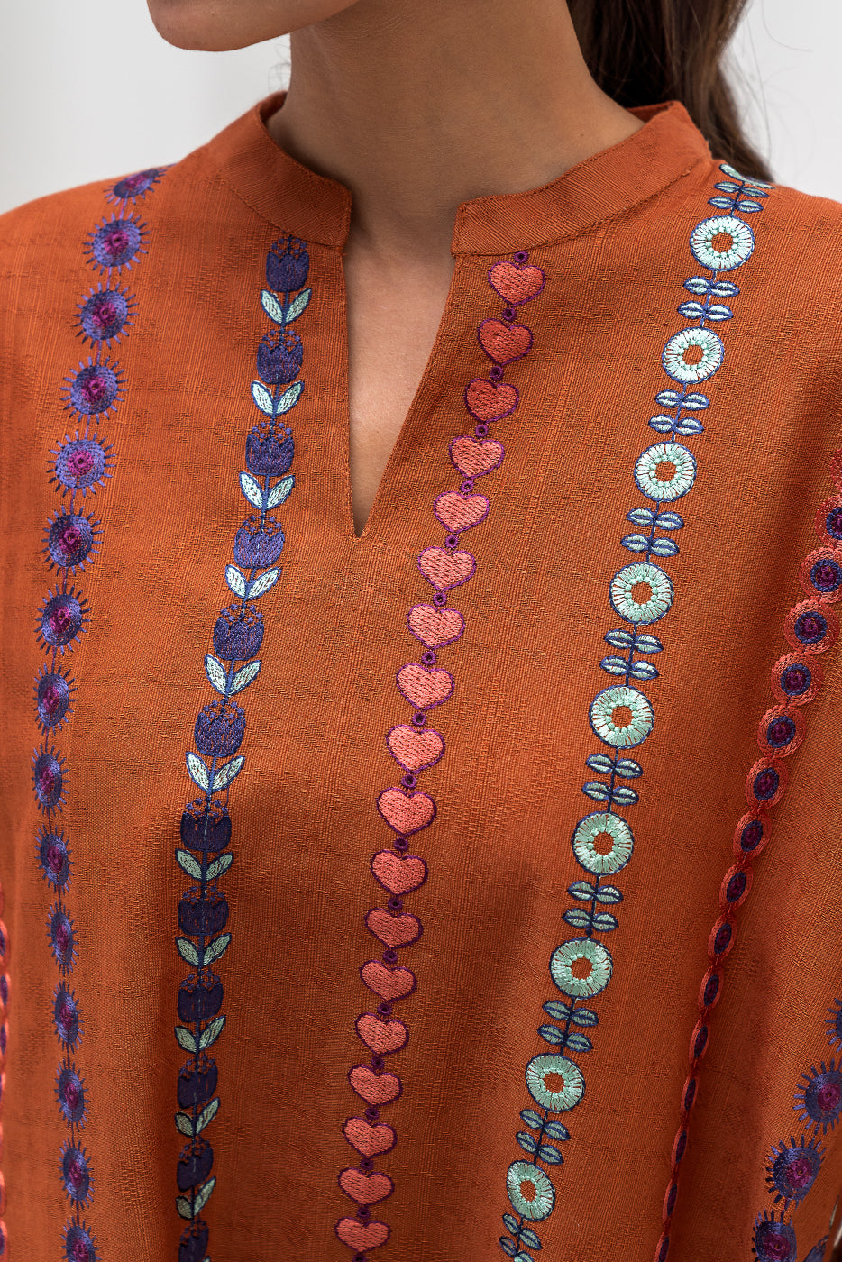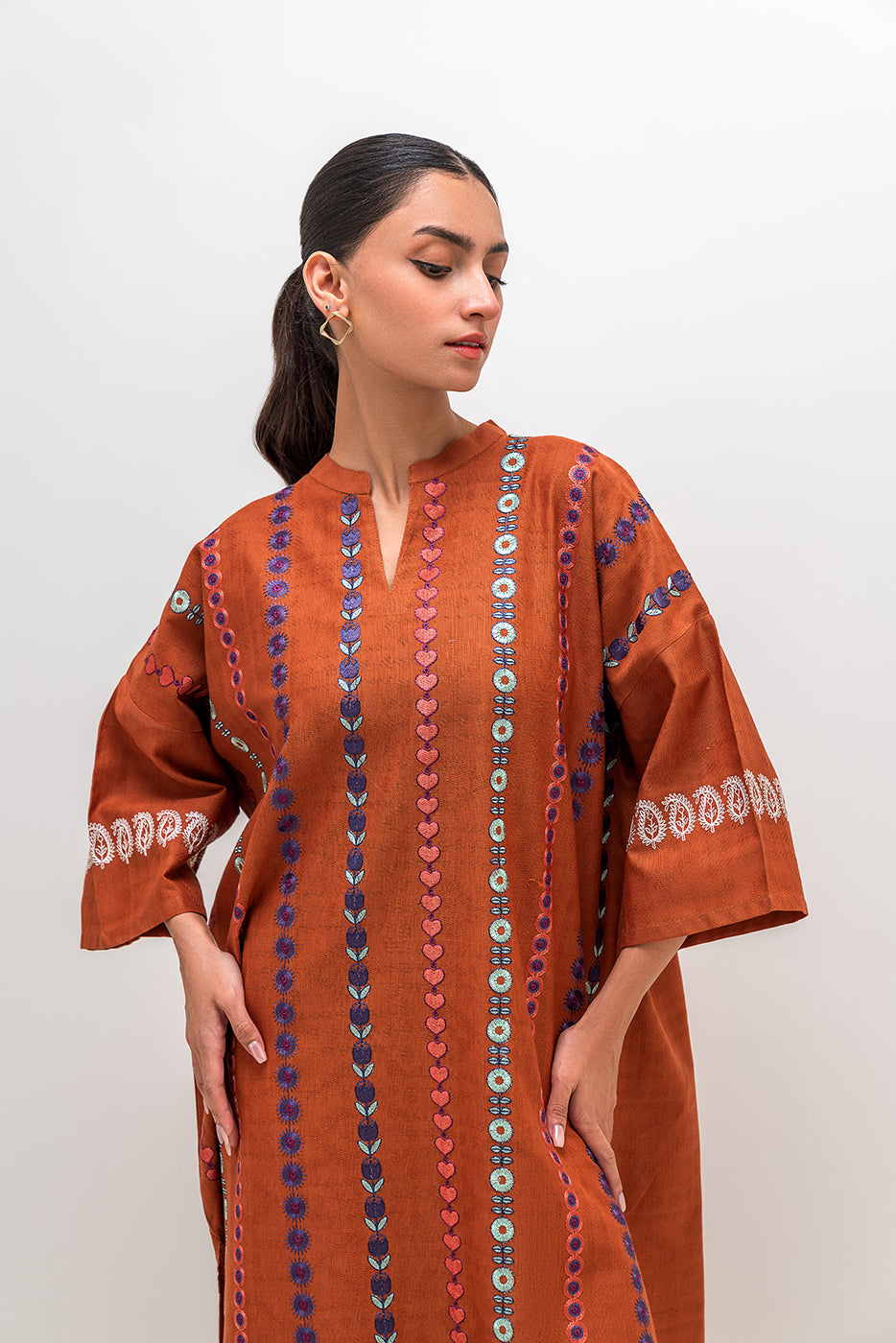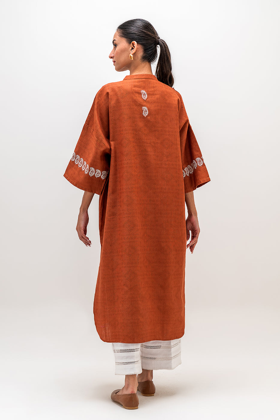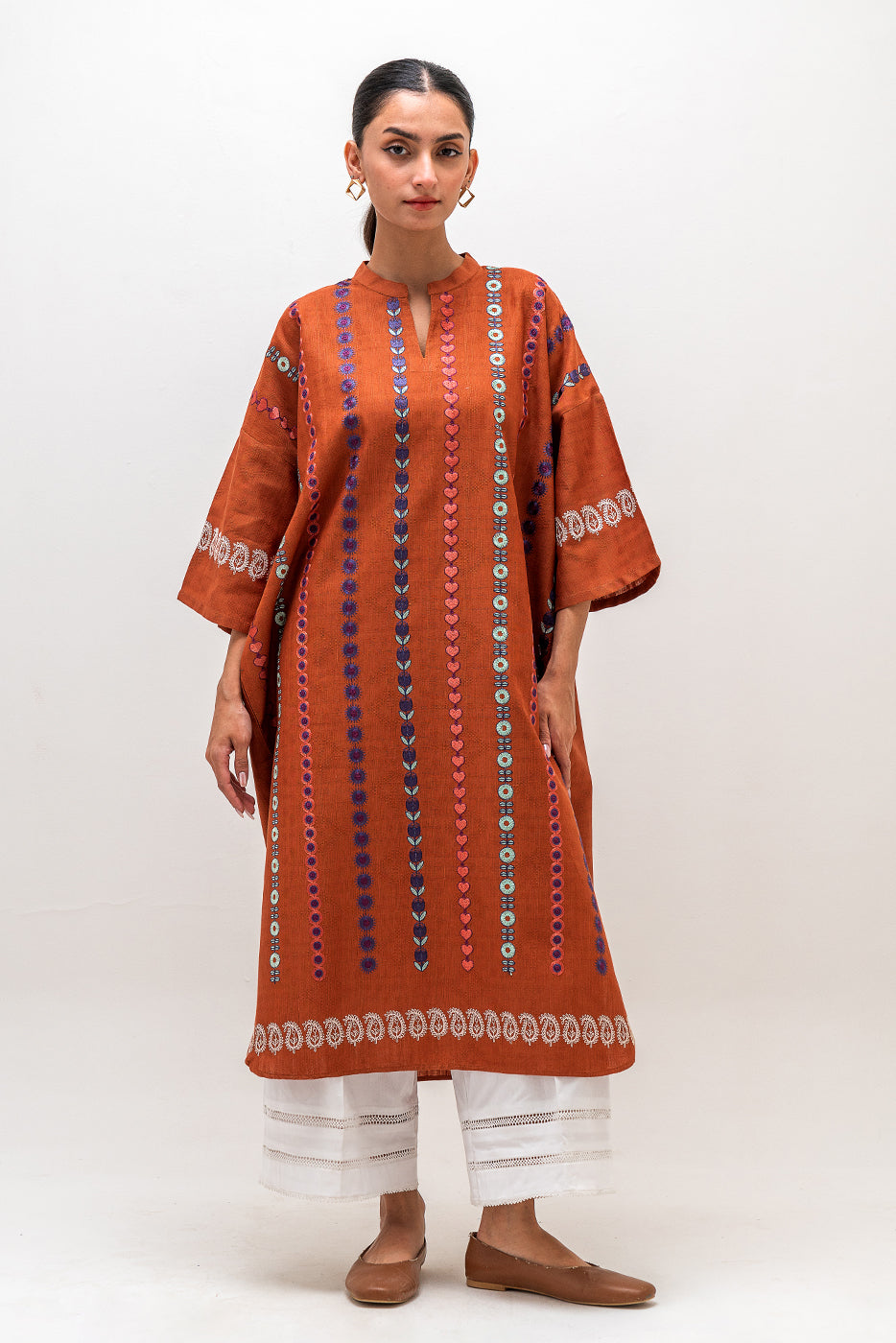 description: embroidered shirt with band slit neckline.drop shoulder with embroidered cuff.round hem with embroidered motifs on back. fabric: khaddar jacquard what you'll get: shirt fit: casual fit size & fit: model height is 5'6" model is wearing 8 size