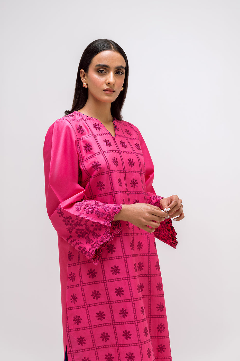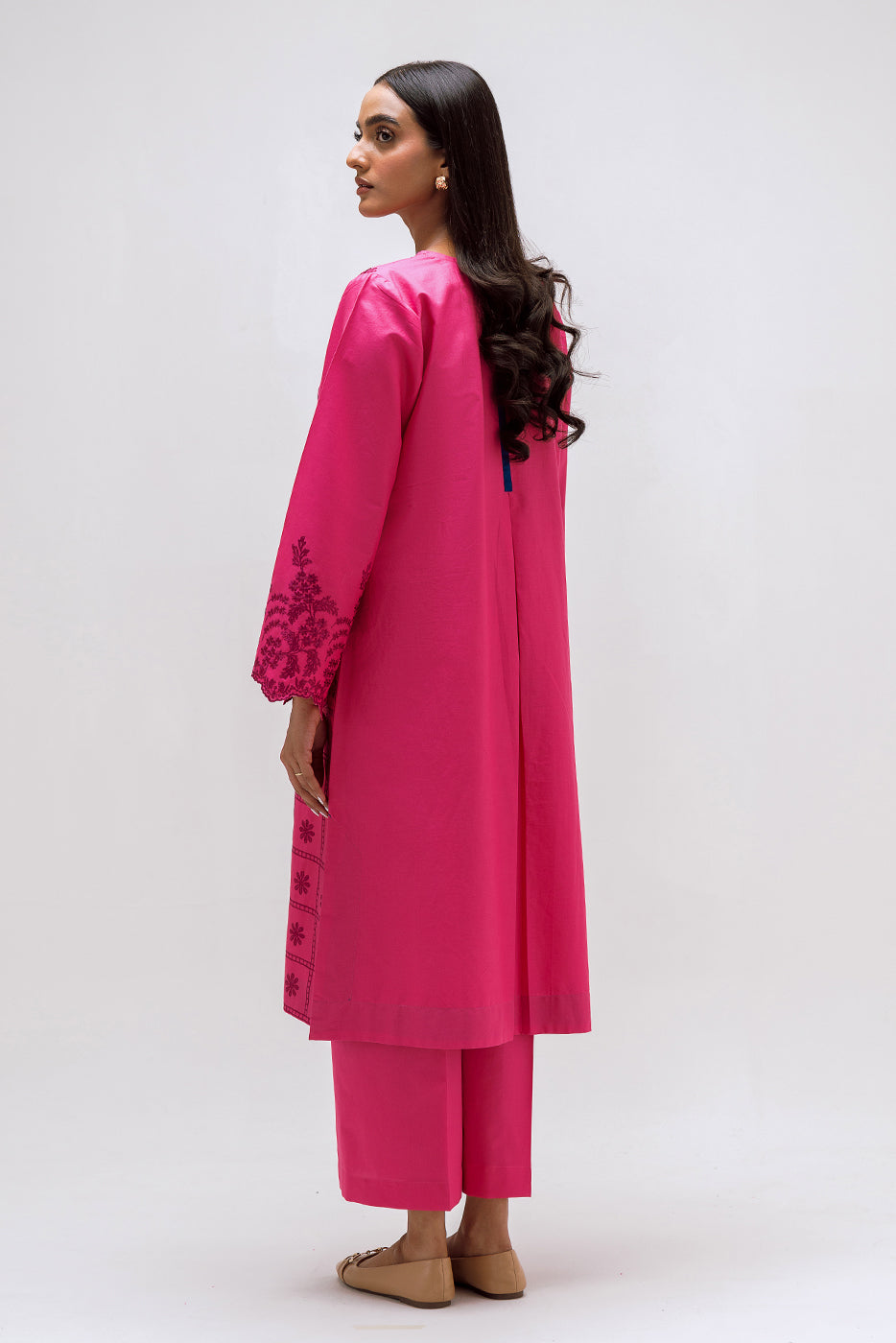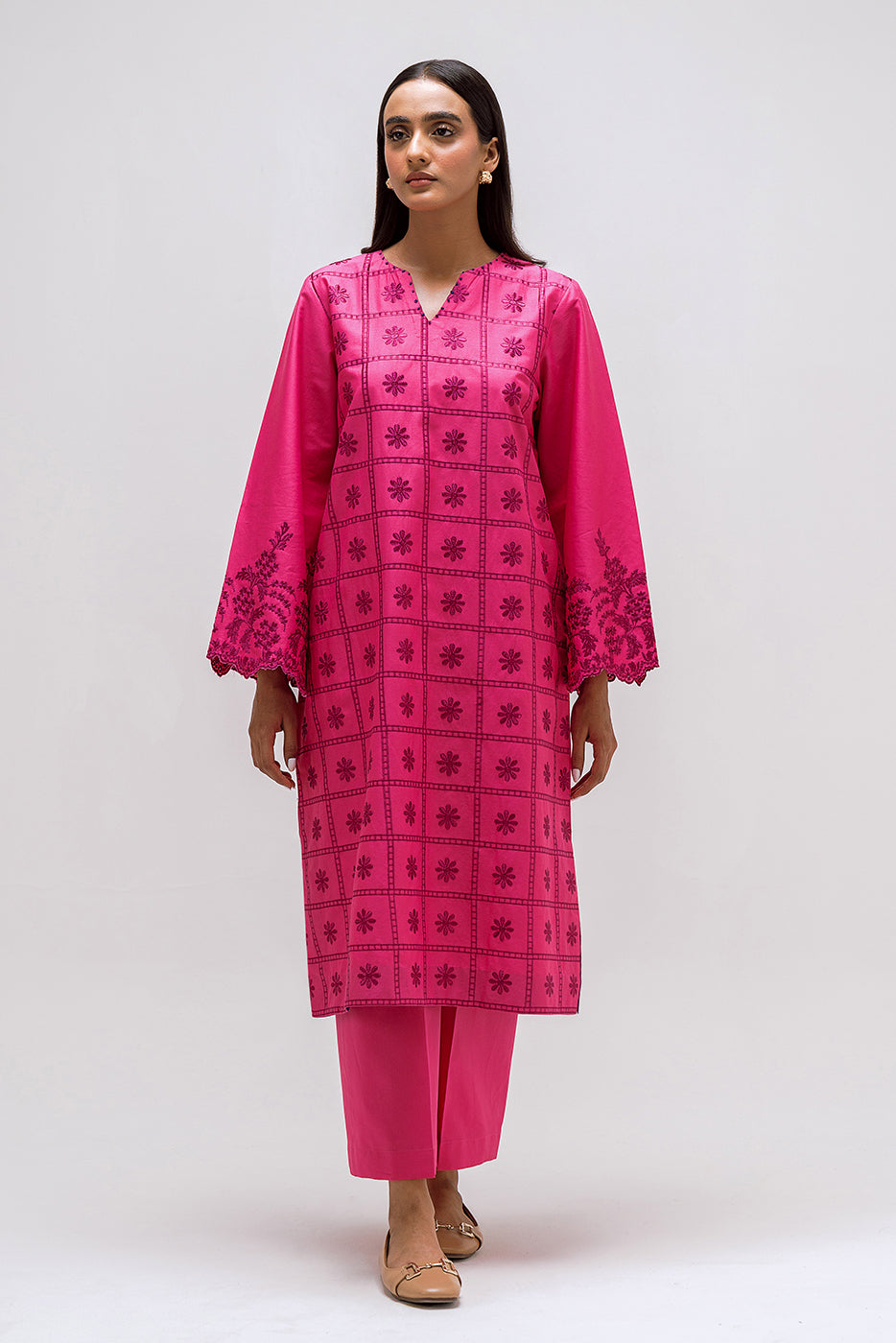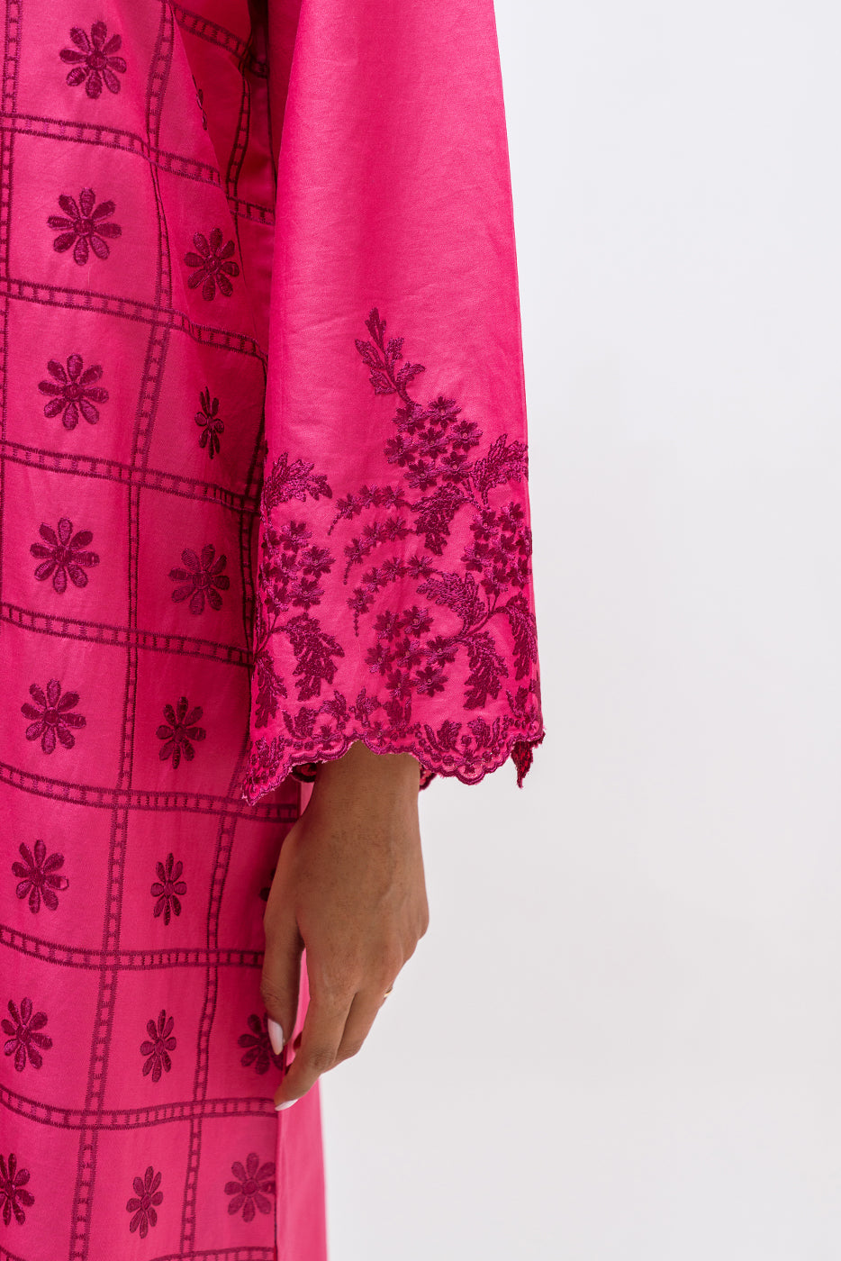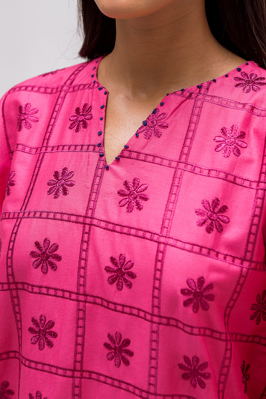 description: embroidered shirt with round neckline and v-slit with contrasting french knots detail, embroidered sleeves with scallop detail and french knots handwork detail. paired with culotte pants to complete the look. fabric: cambric what you'll get: shirt+pant fit: casual fit size & fit: model height is 5'6" model is wearing 8 size