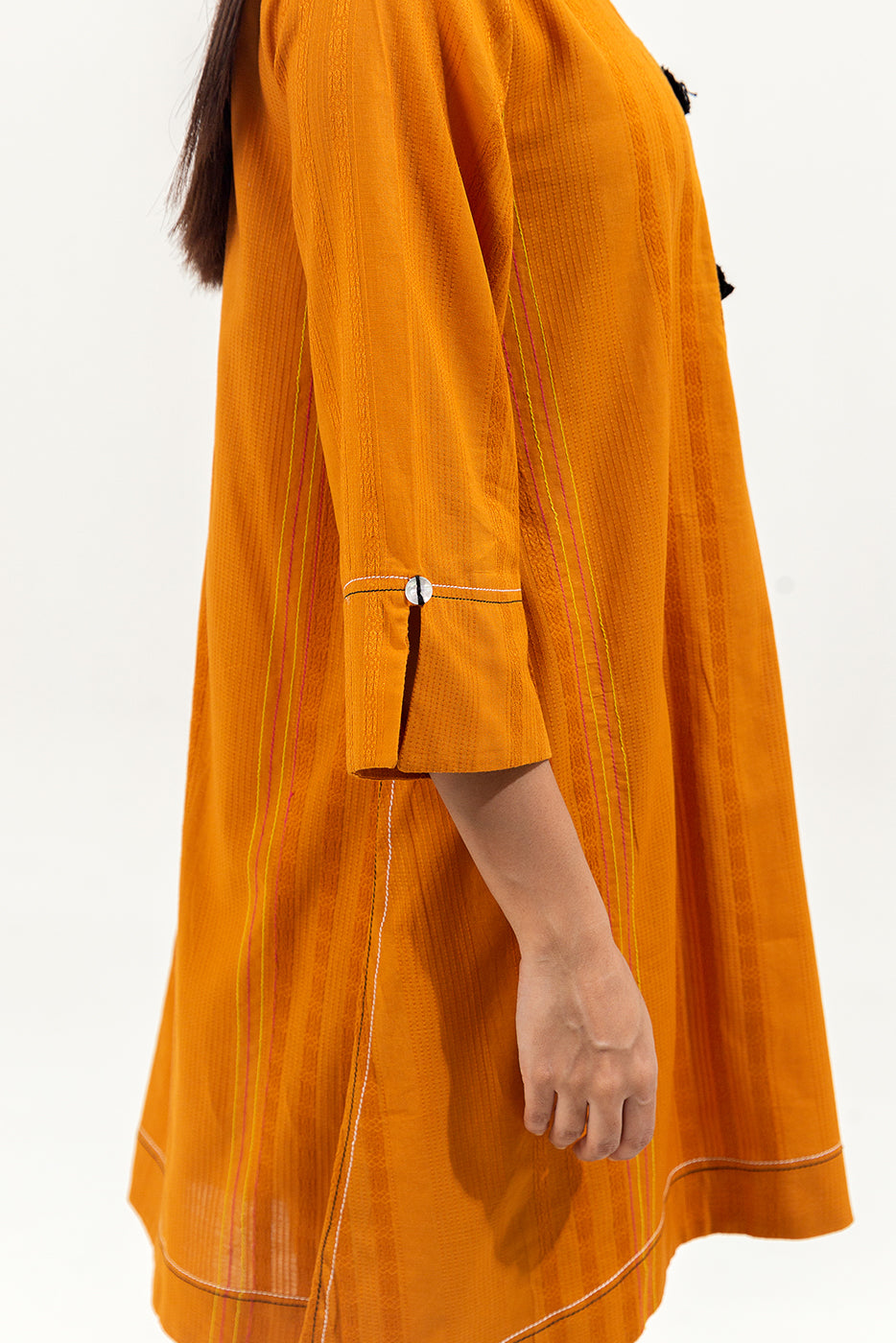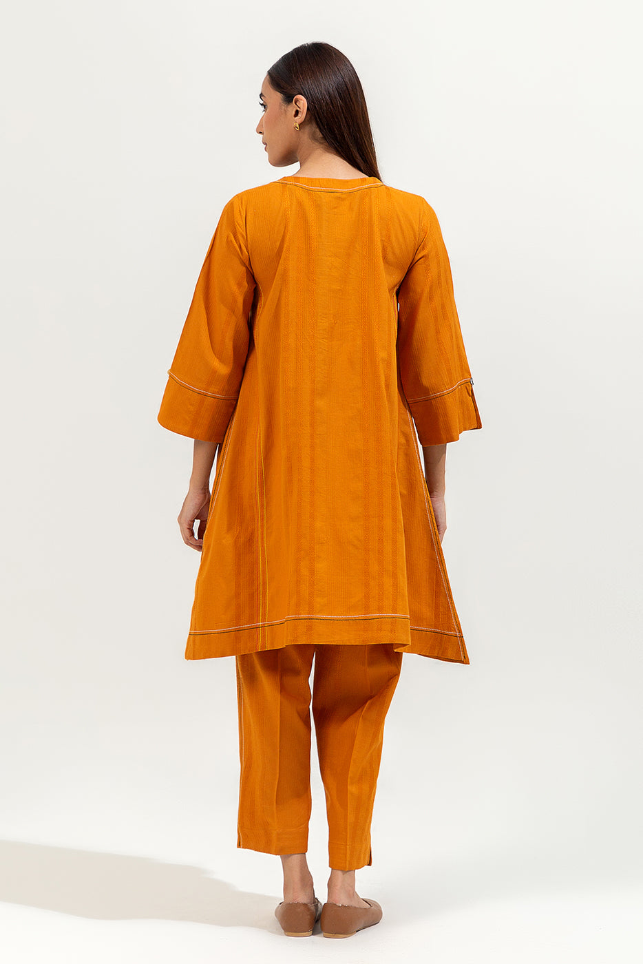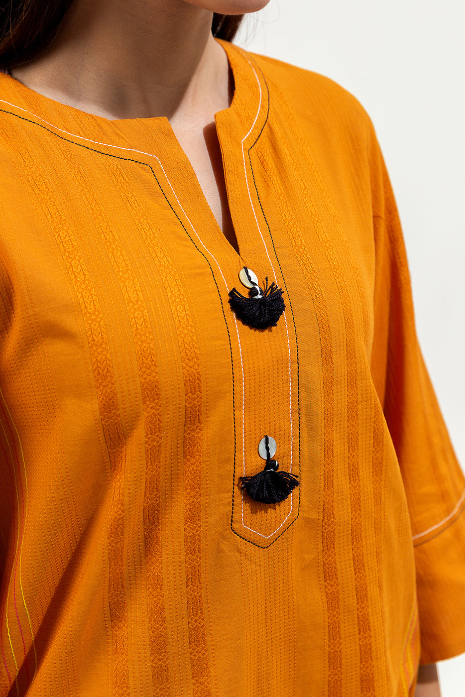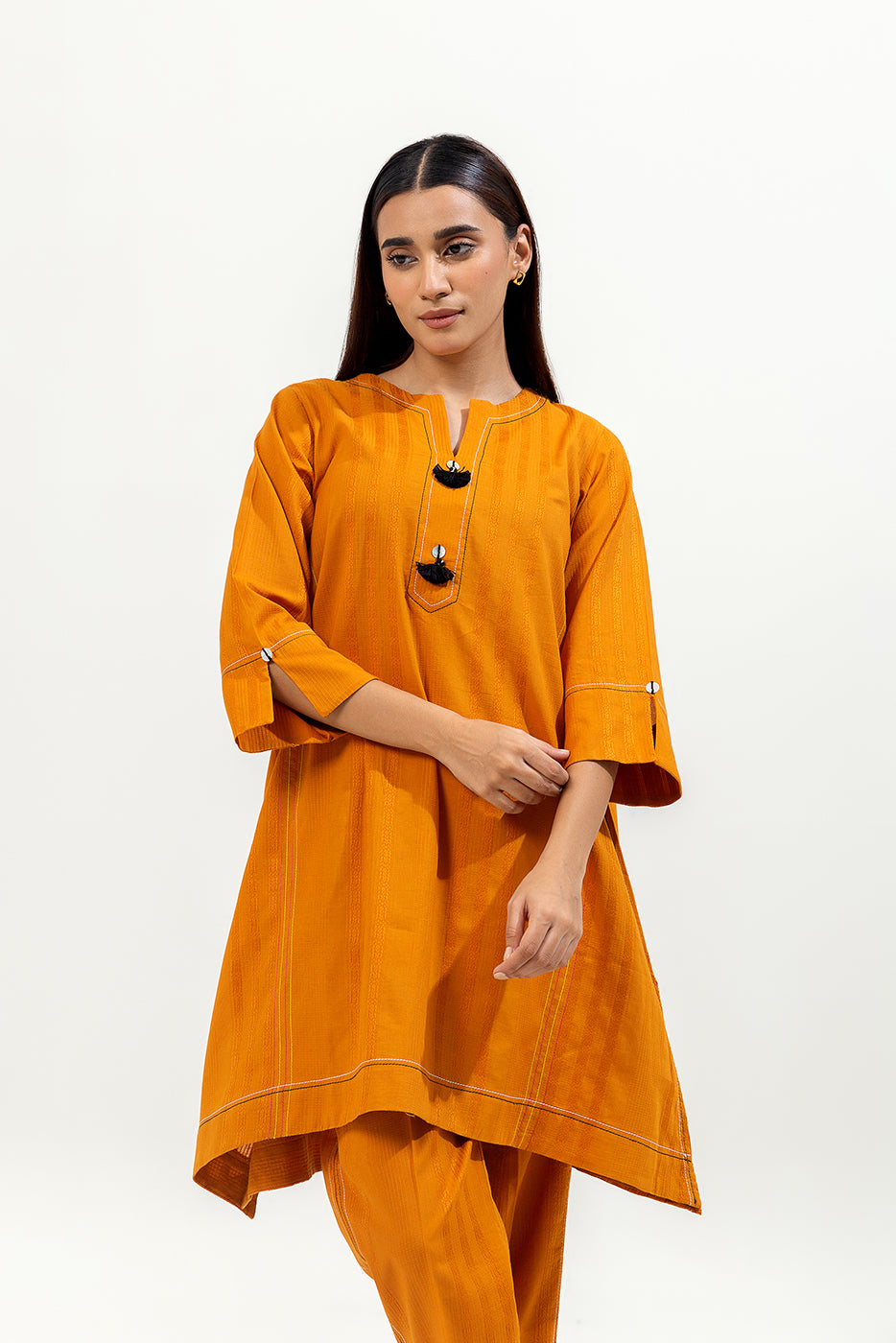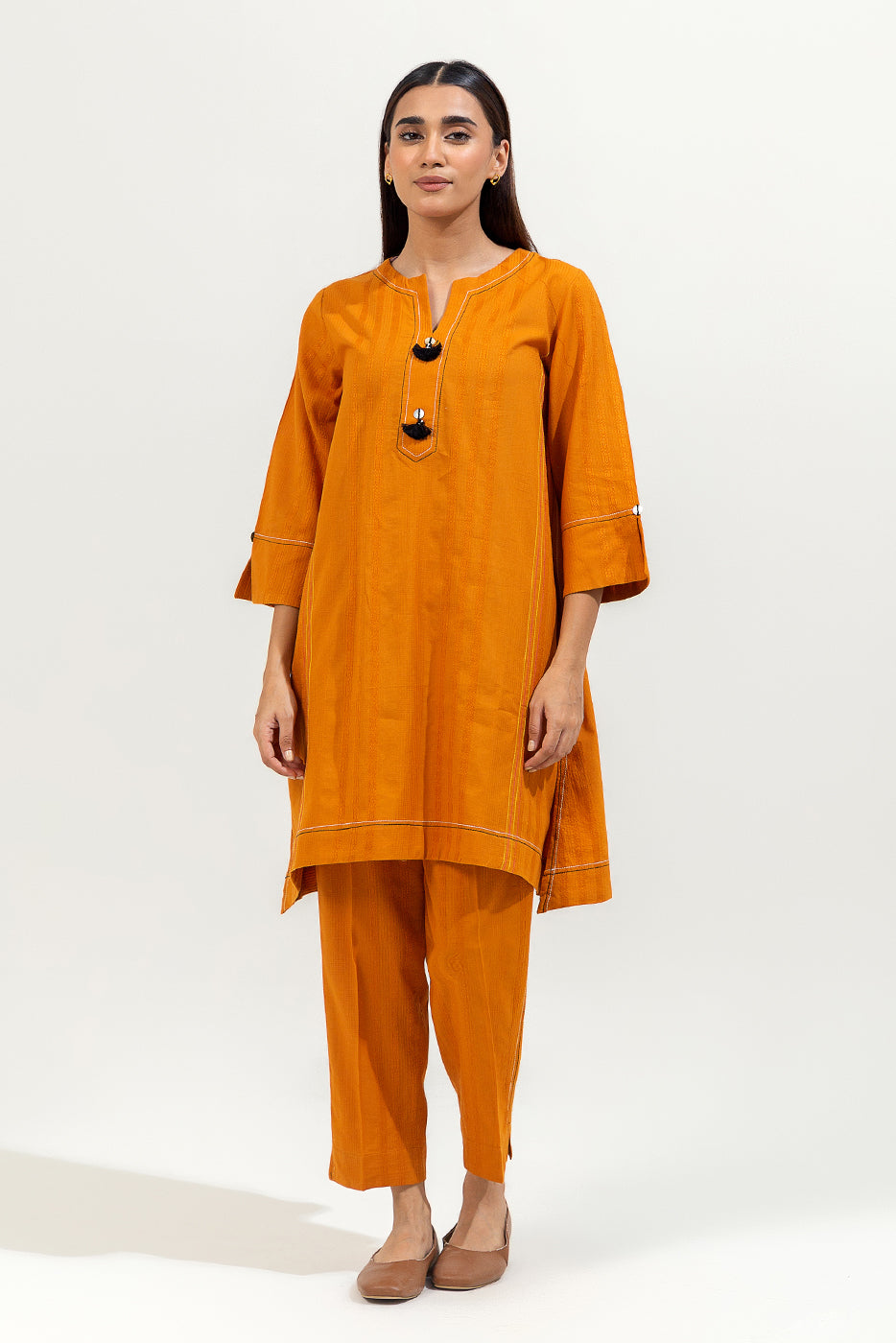 description: basic shirt with round neckline and placket with handwork detail, contrasting top stitches detail on front and sleeves, loose drop corners hem. paired with straight pants to complete the look. fabric: jacquard what you'll get: shirt+pant fit: casual fit size & fit: model height is 5'6" model is wearing 8 size