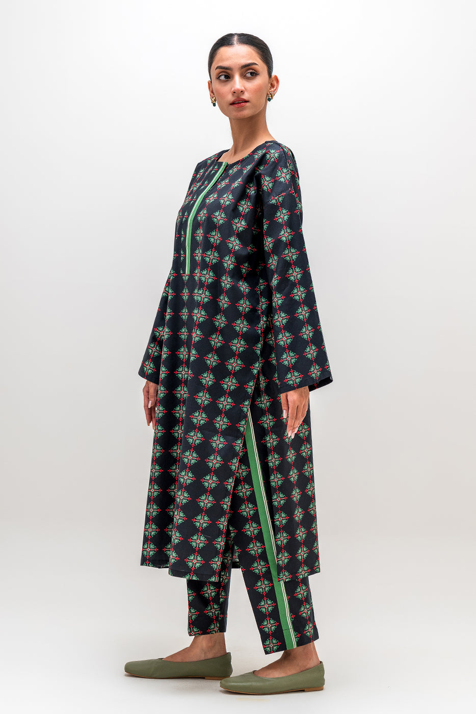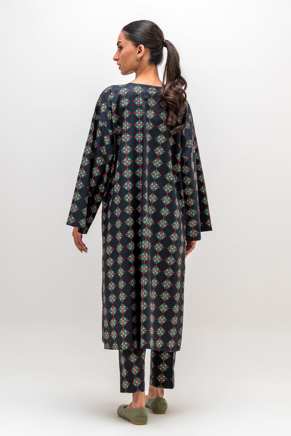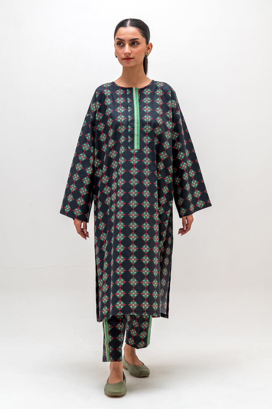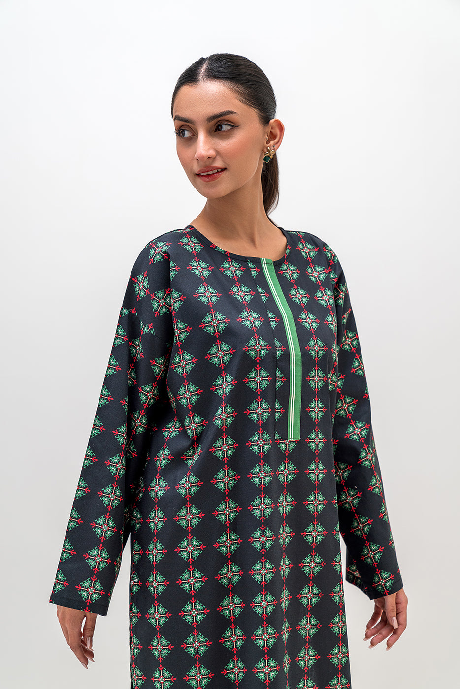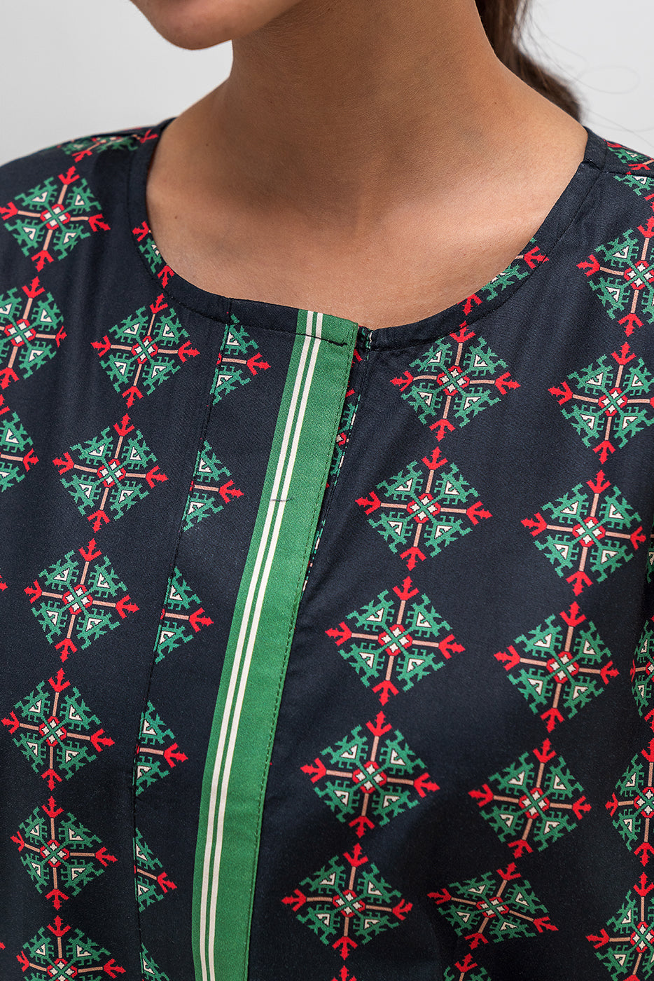 description: basic printed extended shoulder shirt with round neckline and placket. matching separates: ( matching pants available in matching separates tab ) fabric: cambric what you'll get: shirt fit: casual fit size & fit: model height is 5'6" model is wearing 8 size