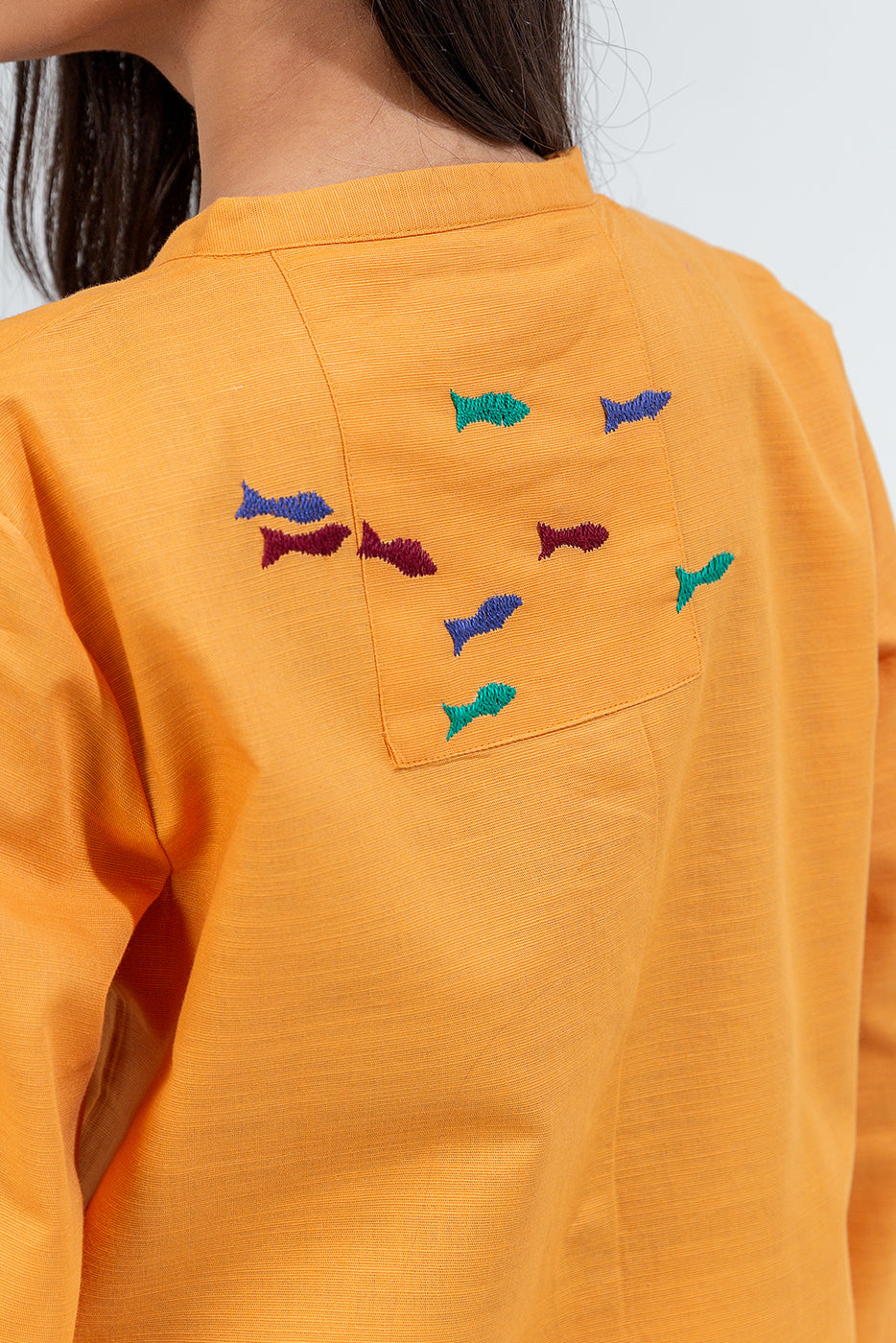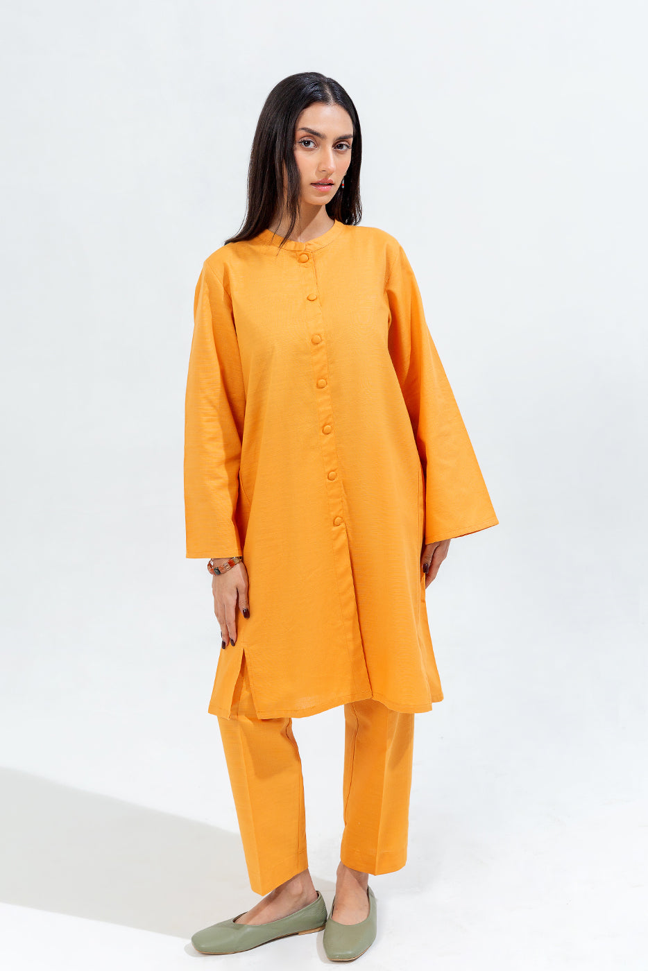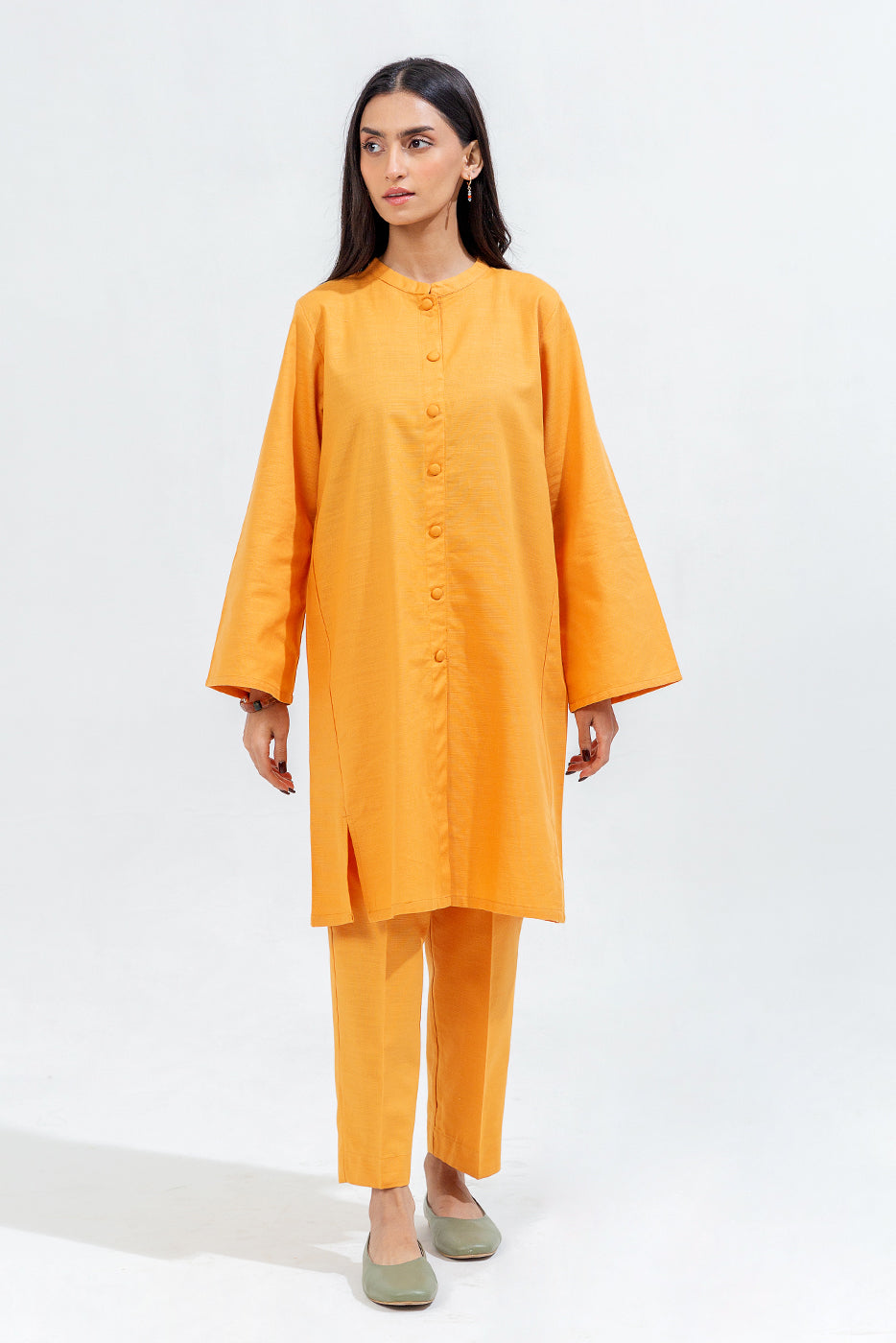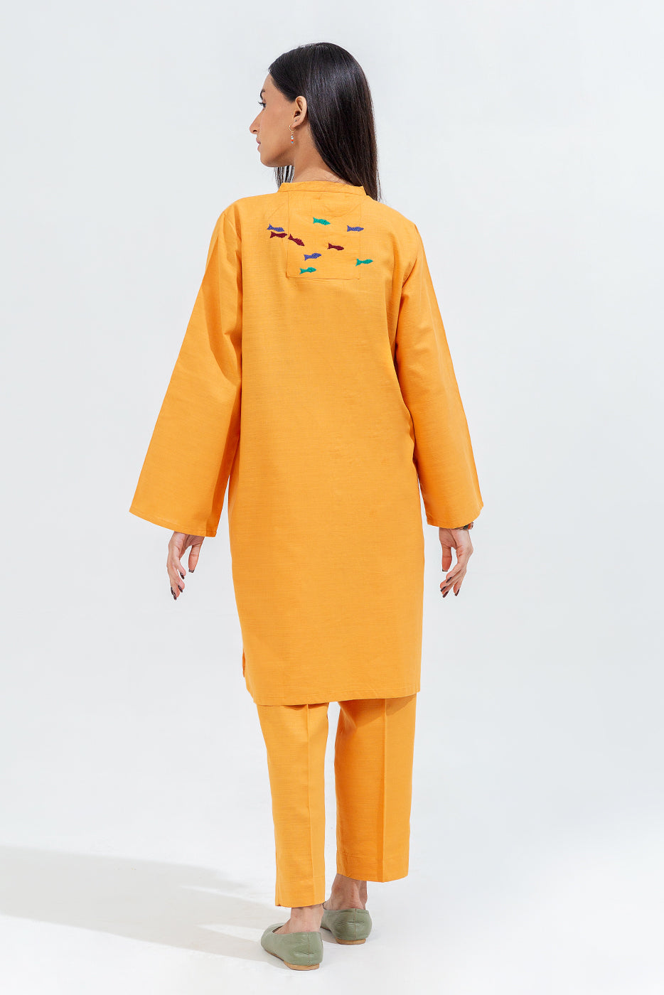 description: basic shirt with band collar and button down placket and hand embroidery on back yoke. paired with straight pants to complete the look. fabric: khaddar what you'll get: shirt+pant fit: casual fit size & fit: model height is 5'6" model is wearing 8 size