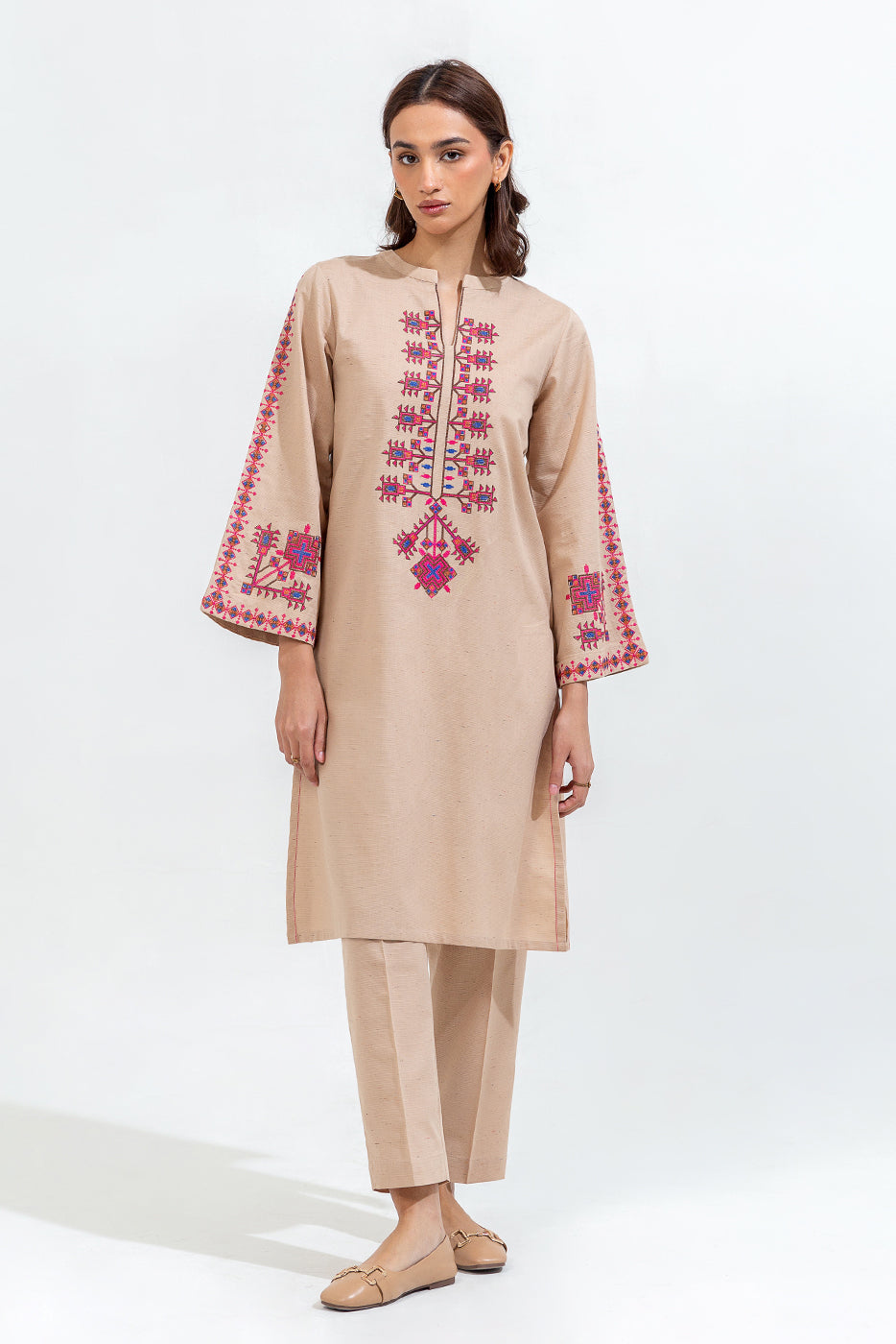 description: 3pc set with shirt having a band neckline with embroidered neckline and sleeves, apired with straight pants and printed shawl. fabric: khaddar what you'll get: shirt+pant fit: casual fit size & fit: model height is 5'6" model is wearing 8 size