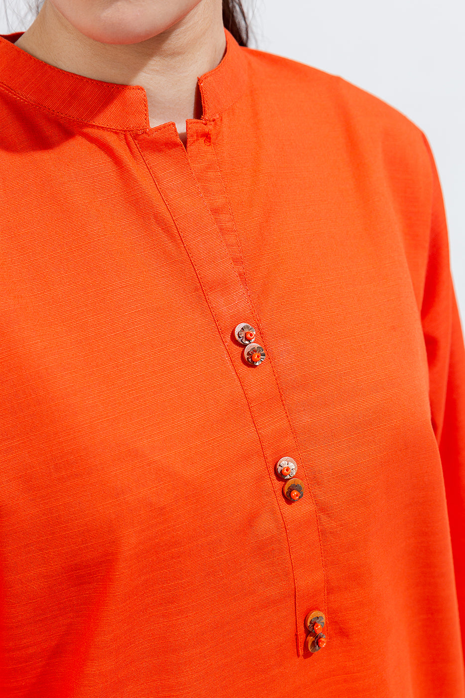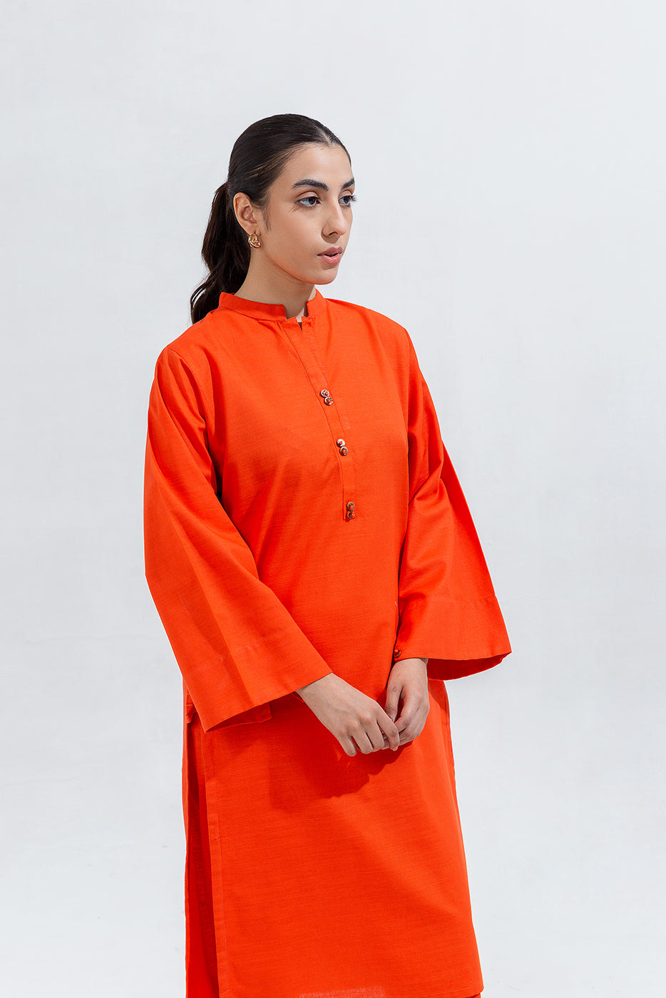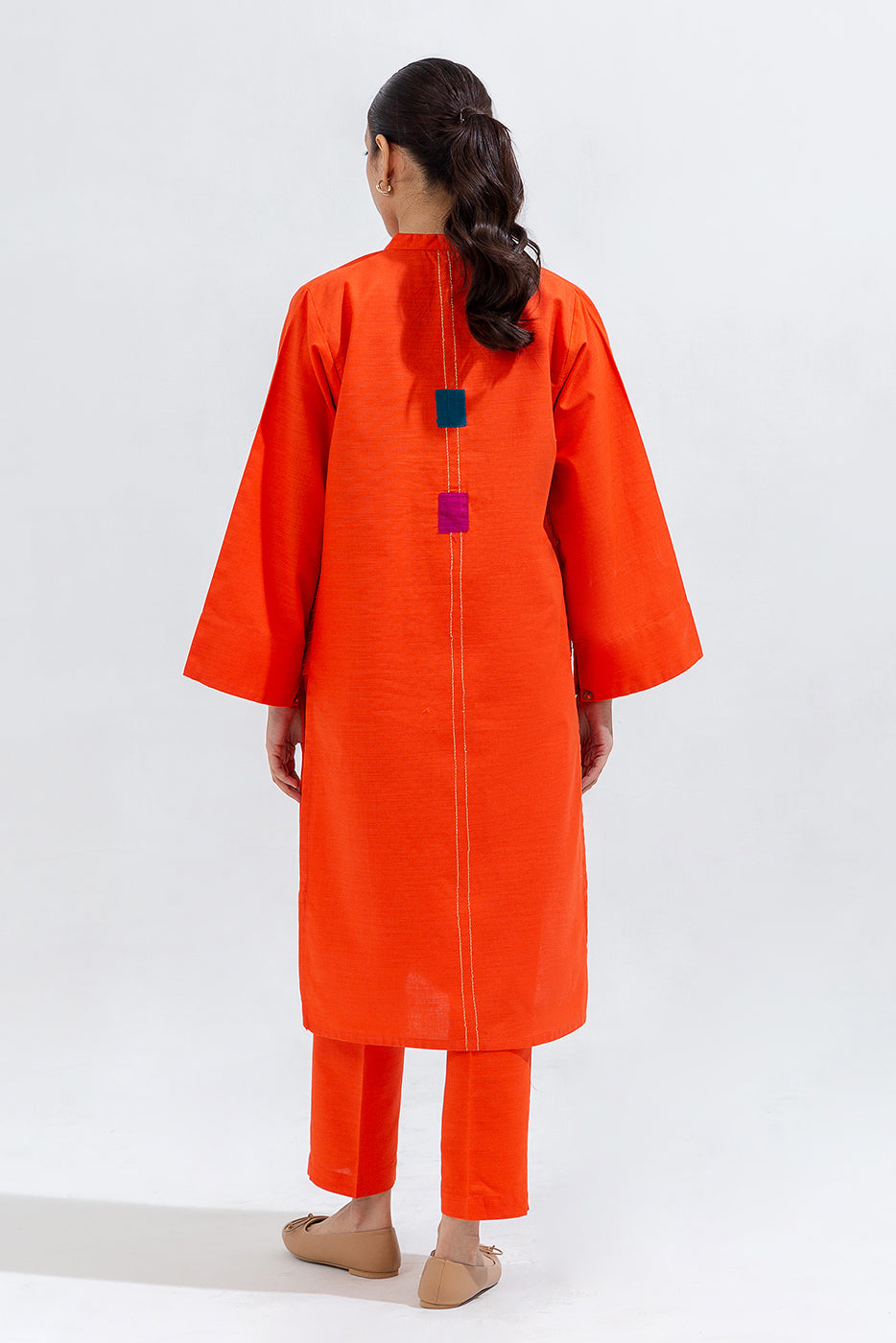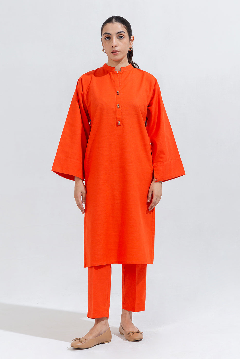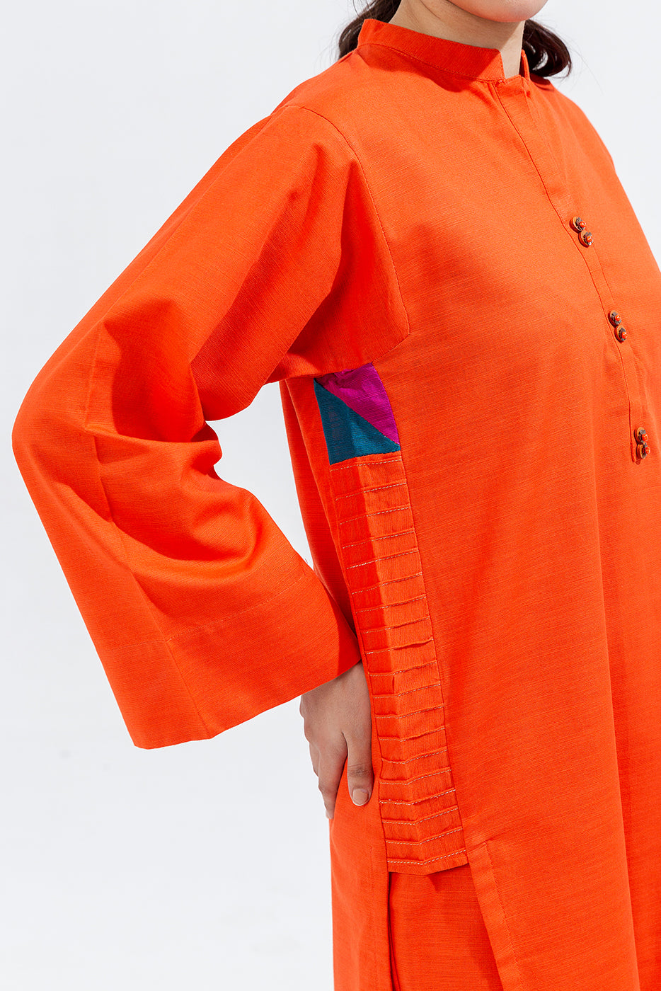 description: 2 piece shirt with band neckline and placket with button detail.sleeves with cuff and button detail.accent detail at back.straight hem.paired with straight pants. fabric: khaddar what you'll get: shirt+pant fit: casual fit size & fit: model height is 5'6" model is wearing 8 size