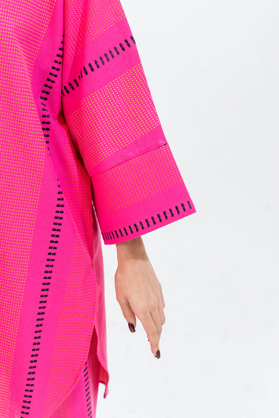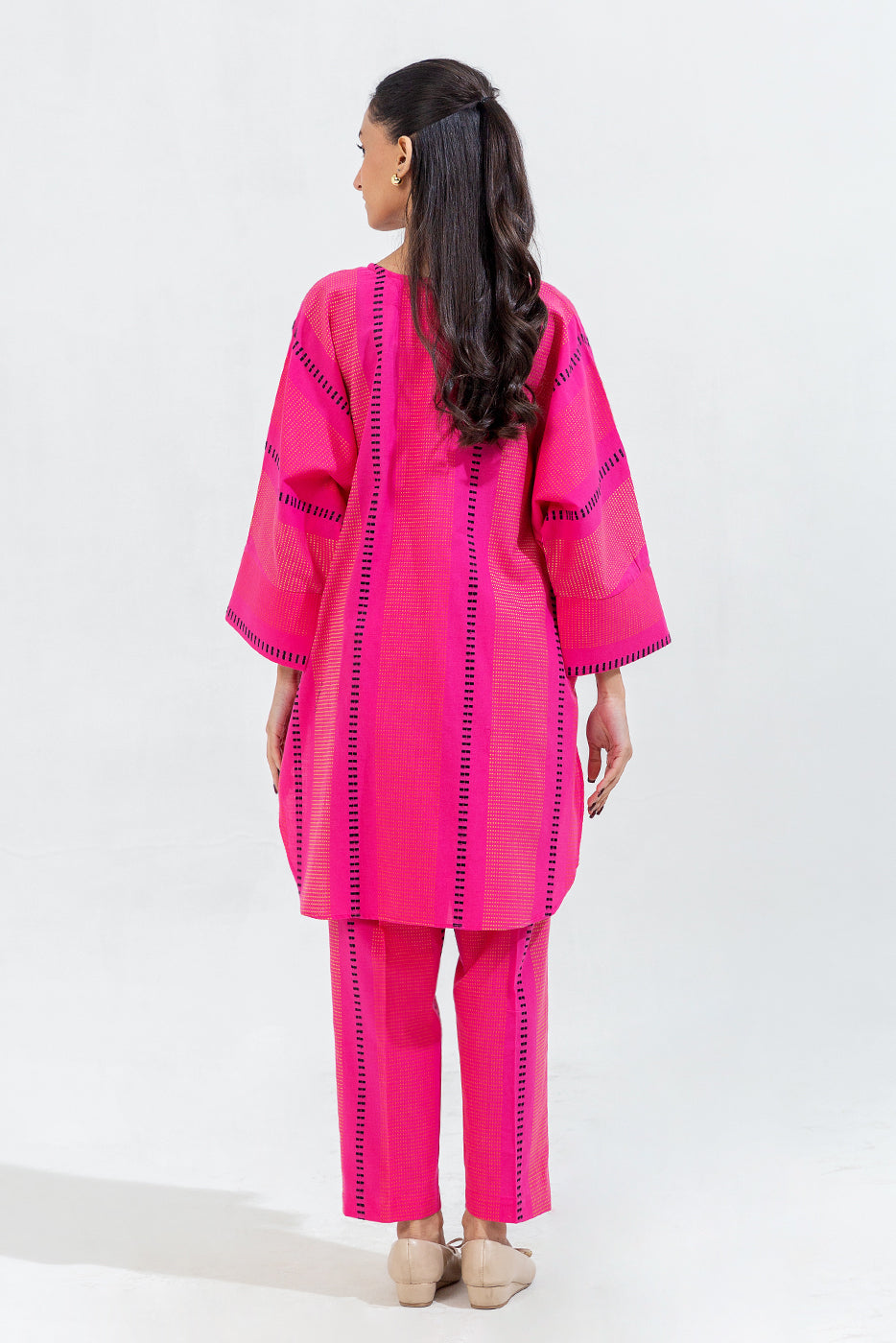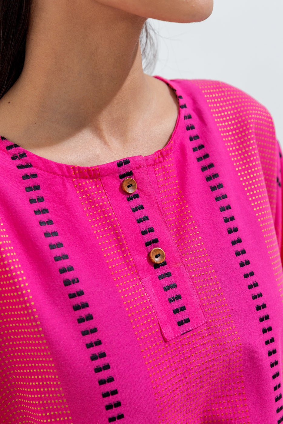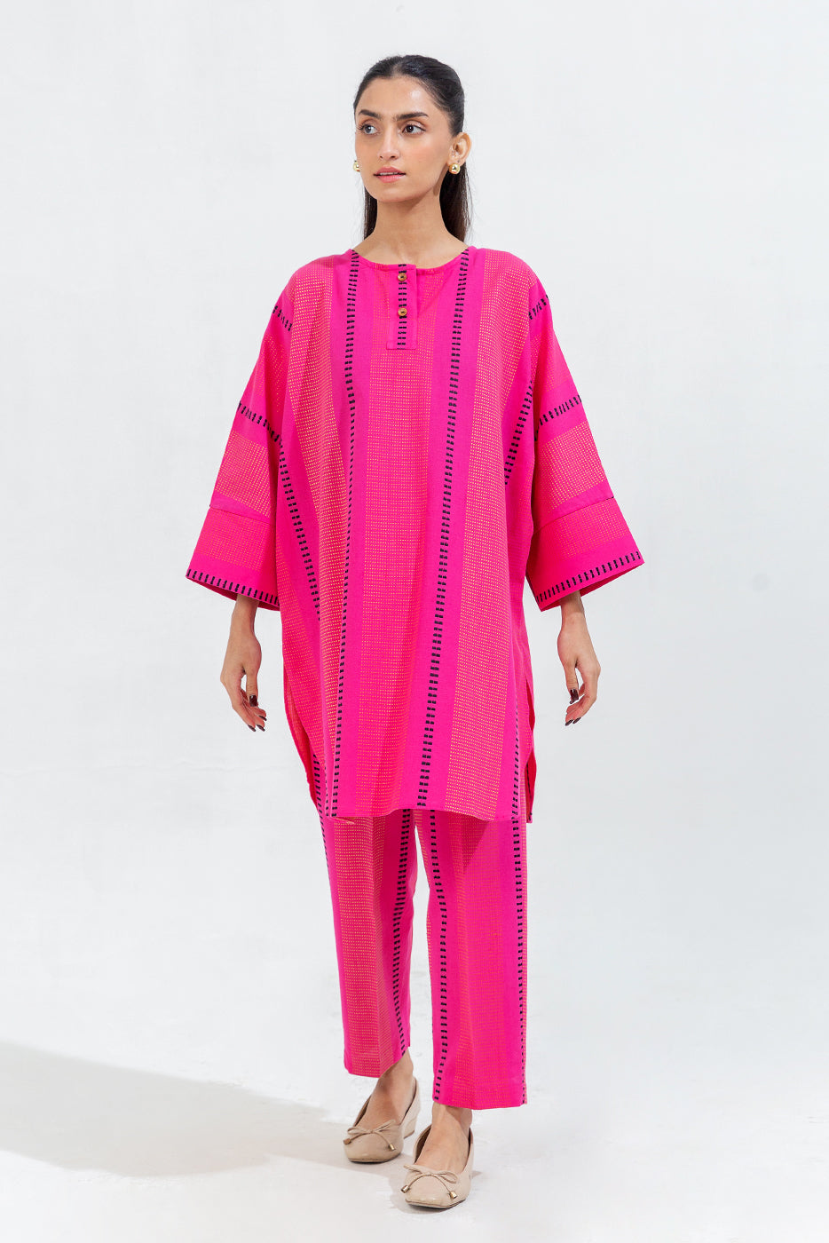 description: 2 piece shirt with round neck and placket with button detail.batwing sleeves with cuffs.round hem.paired with straight pants. fabric: jacquard what you'll get: shirt+pant fit: casual fit size & fit: model height is 5'6" model is wearing 8 size