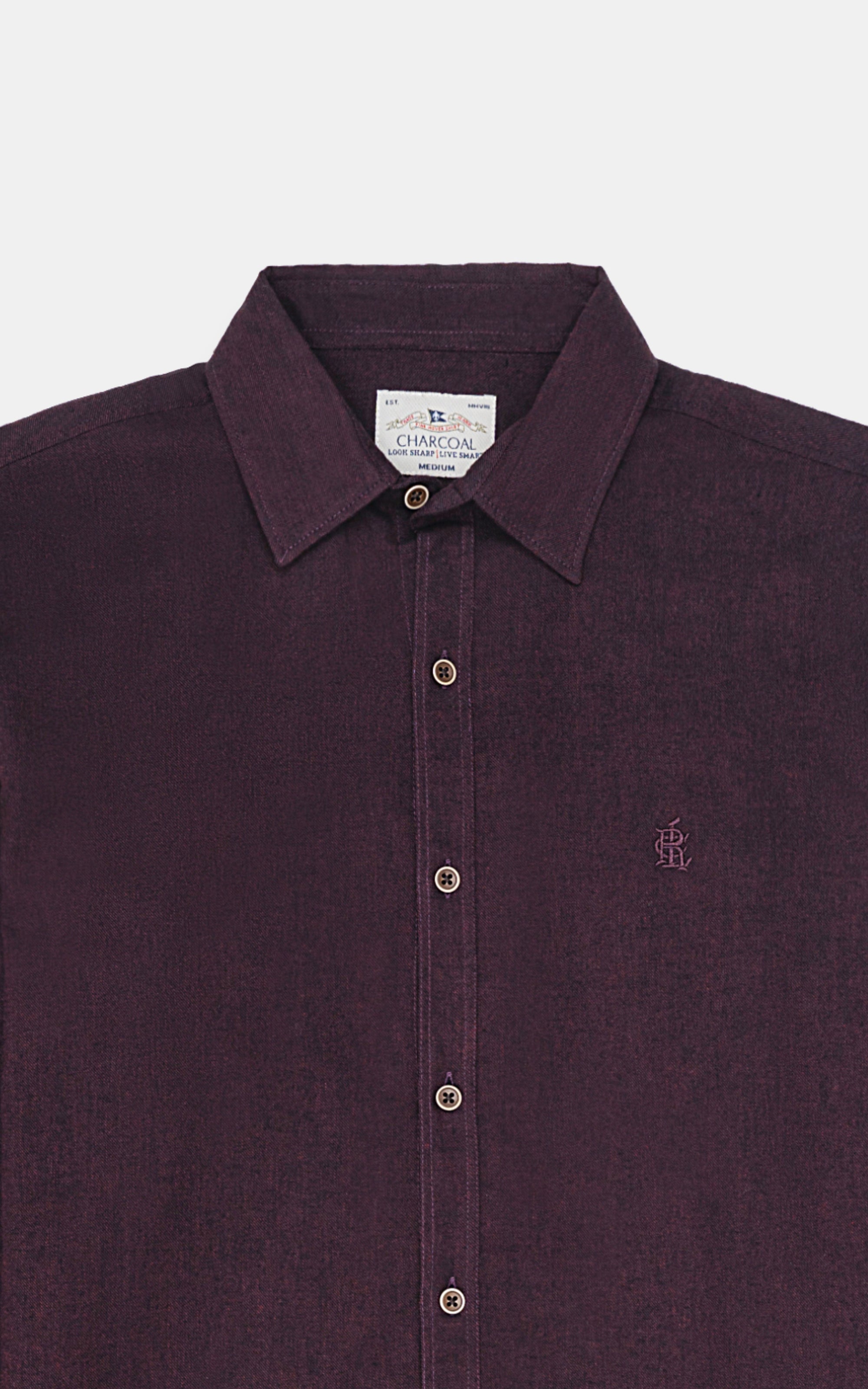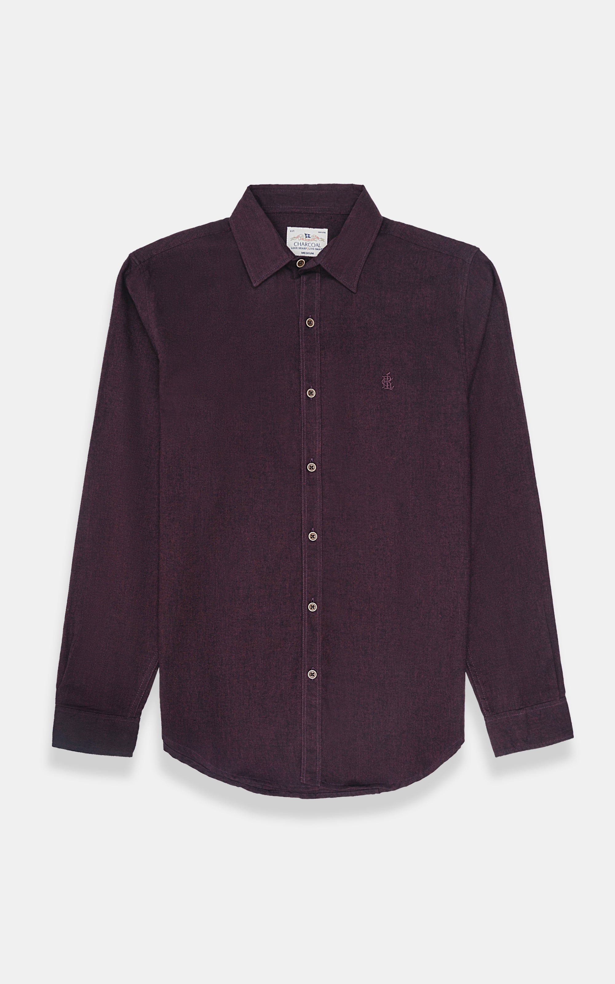 this men's casual shirt is a perfect blend of comfort and style made from cotton fabric. designed with full sleeves and a classic regular collar, it offers a polished yet laid-back look. the embroidered charcoal logo adds a touch of sophistication, while the adjustable buttons at the cuff ensure a custom fit. pleats at the back provide extra ease of movement, and the round cuffs elevate the overall finish with a convenient back loop for hanging.