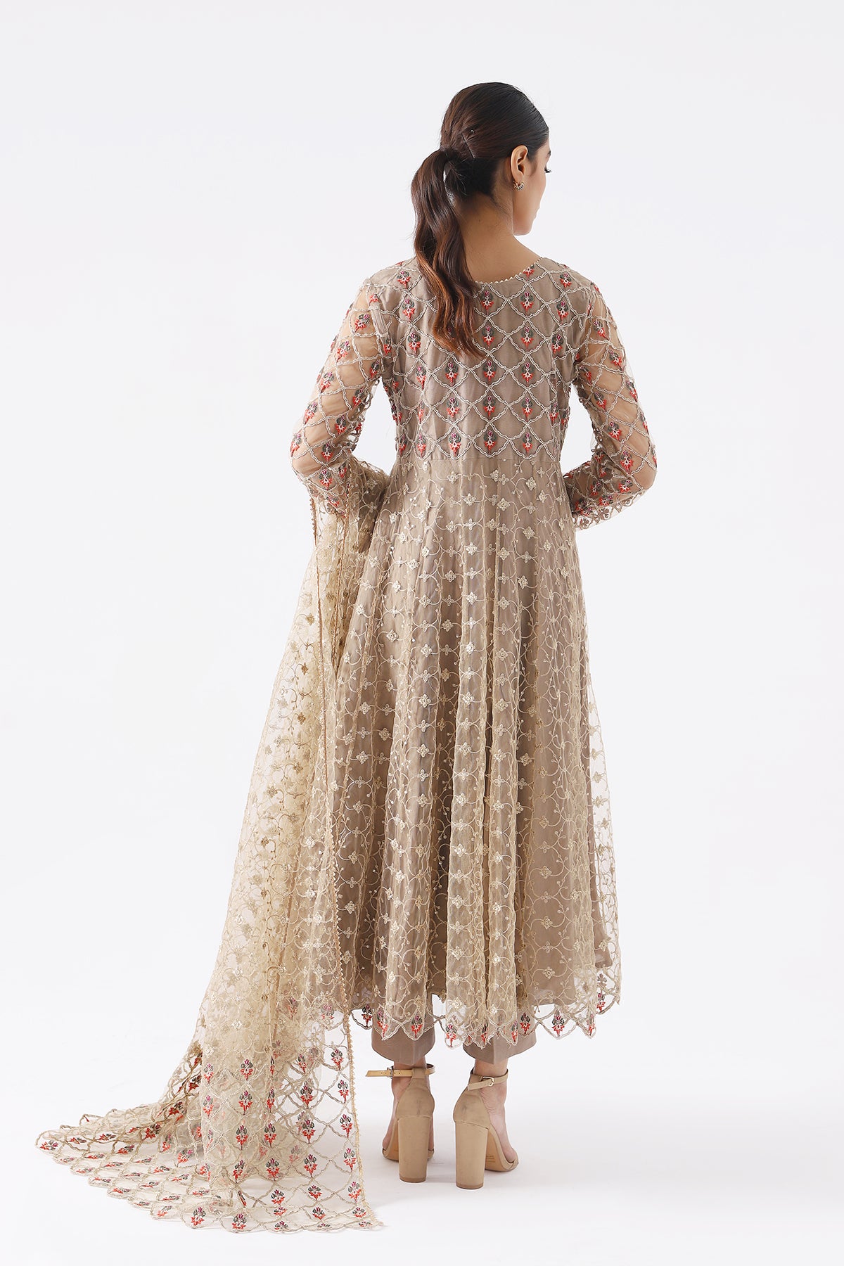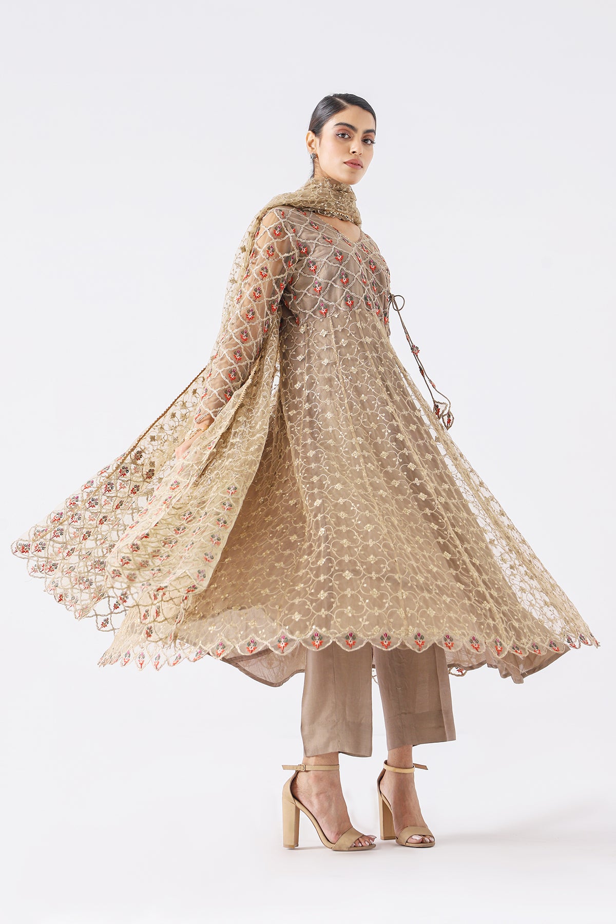 shirt : poly net shirt with embroidered front back yok,embroidered front back sleeves. raw silk inner shirt. embellished with patch work. finished with stitching detail. trouser : raw silk trouser. finished with stitching detail. dupatta : poly net embroidered dupatta." size : s m l measurement length (body length) 49" 51" 53"