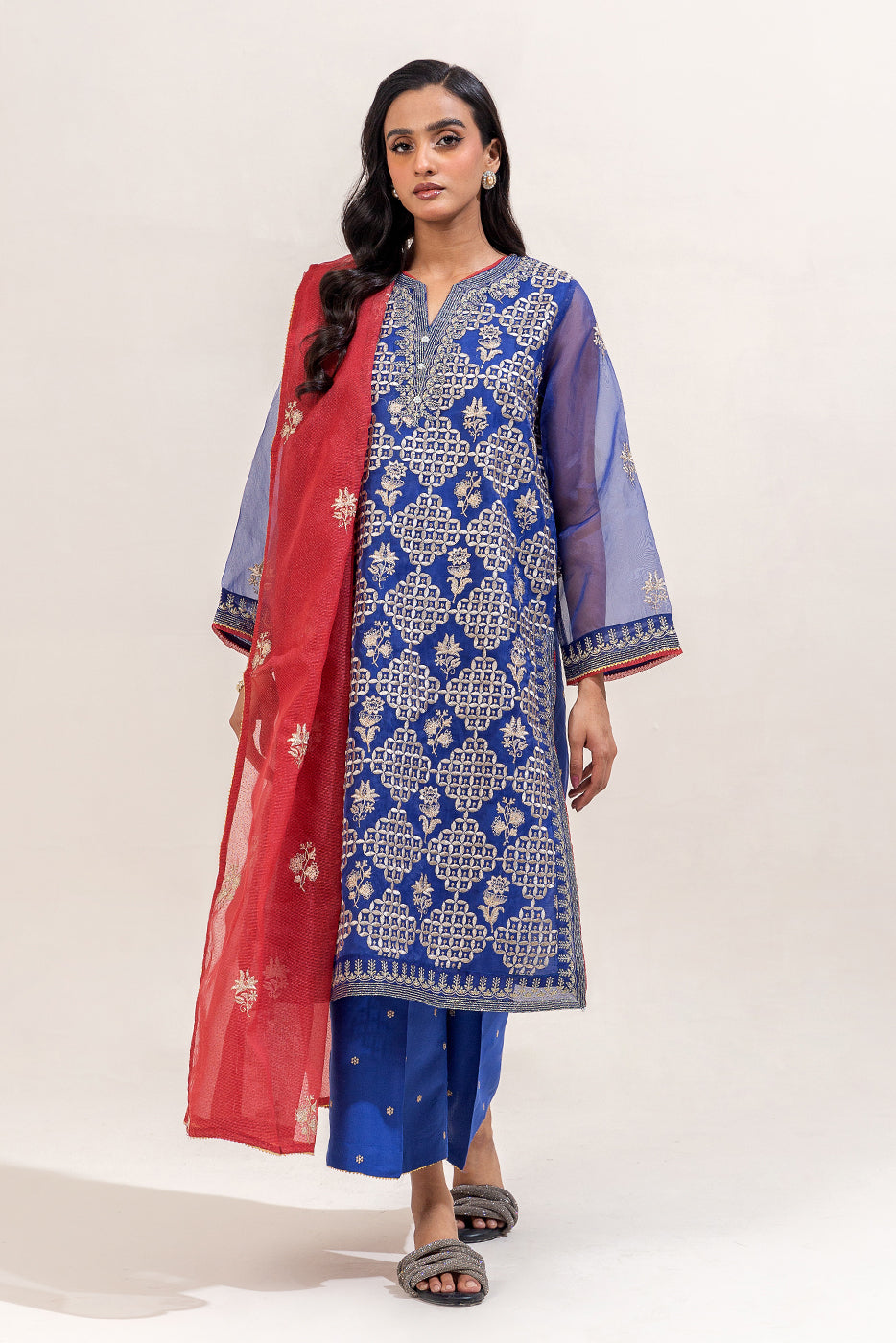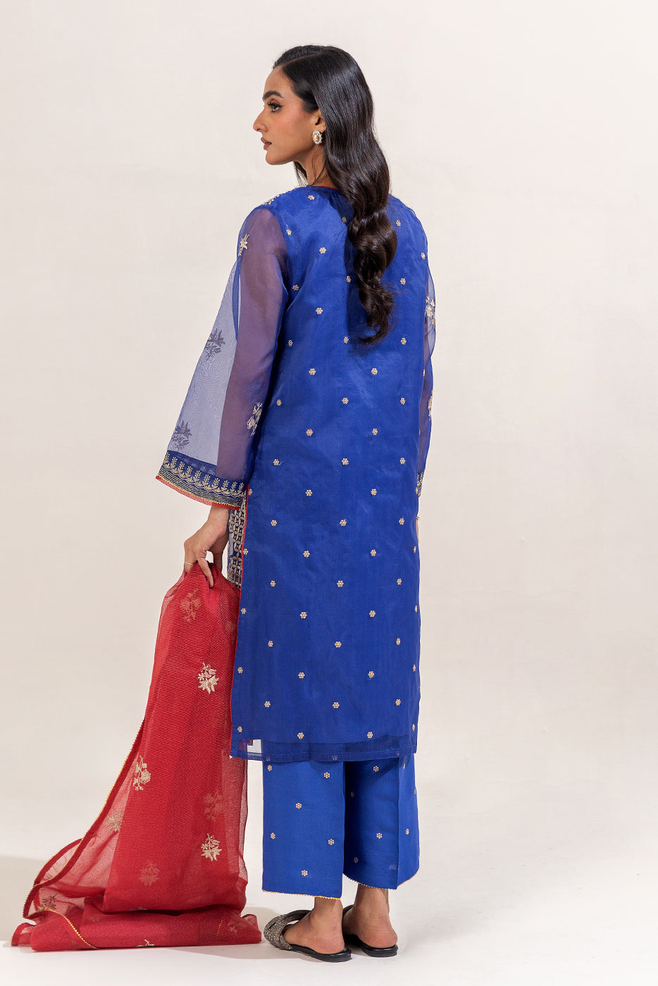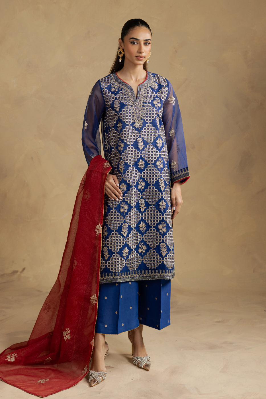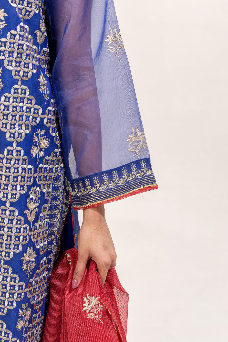 description: all over embroidered shirt with round neckline and v-slit with handwork detail,and contrasting trim and lace detail on front and sleeves.paired with embroidered culotte pants and embroidered dupatta to complete the look. fabric: organza what you'll get: shirt+pant+dupatta fit: casual fit size & fit: model height is 5'6" model is wearing 8 size