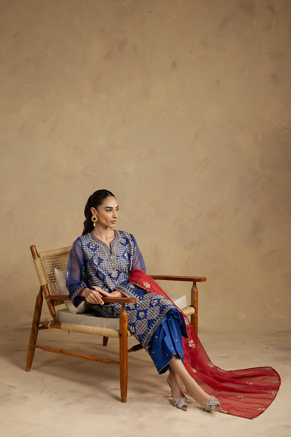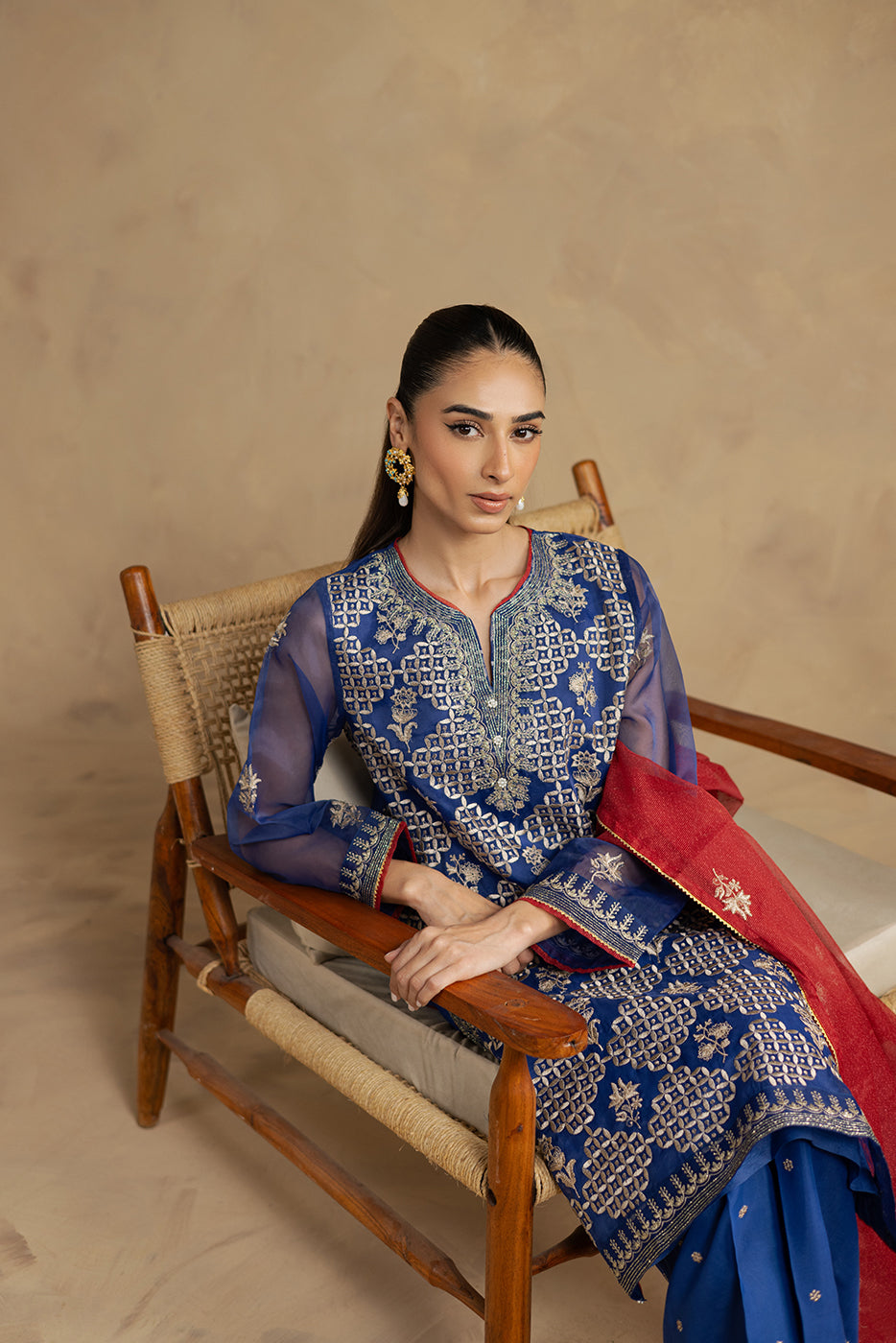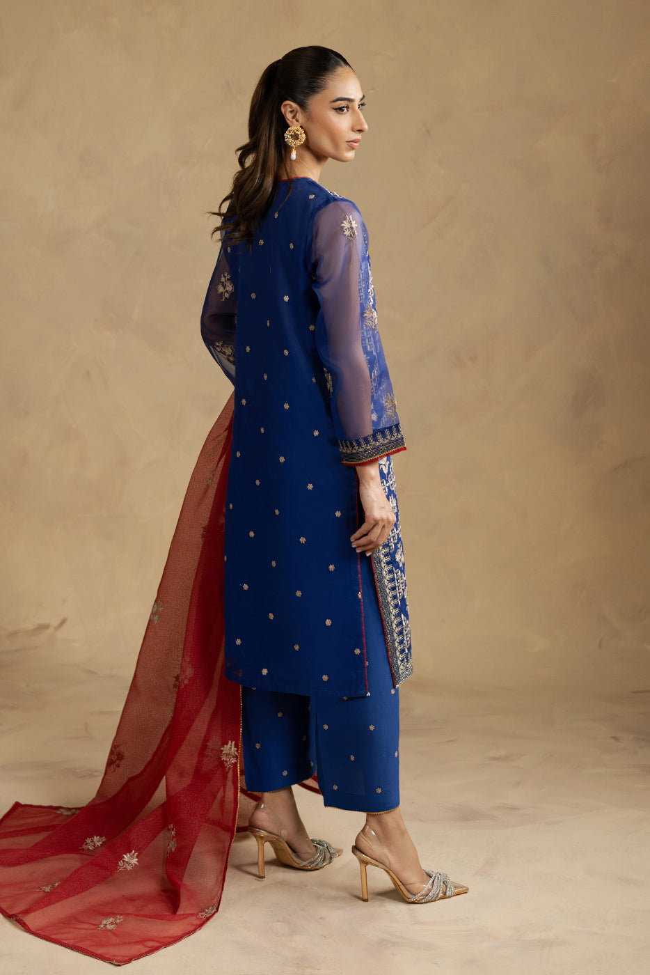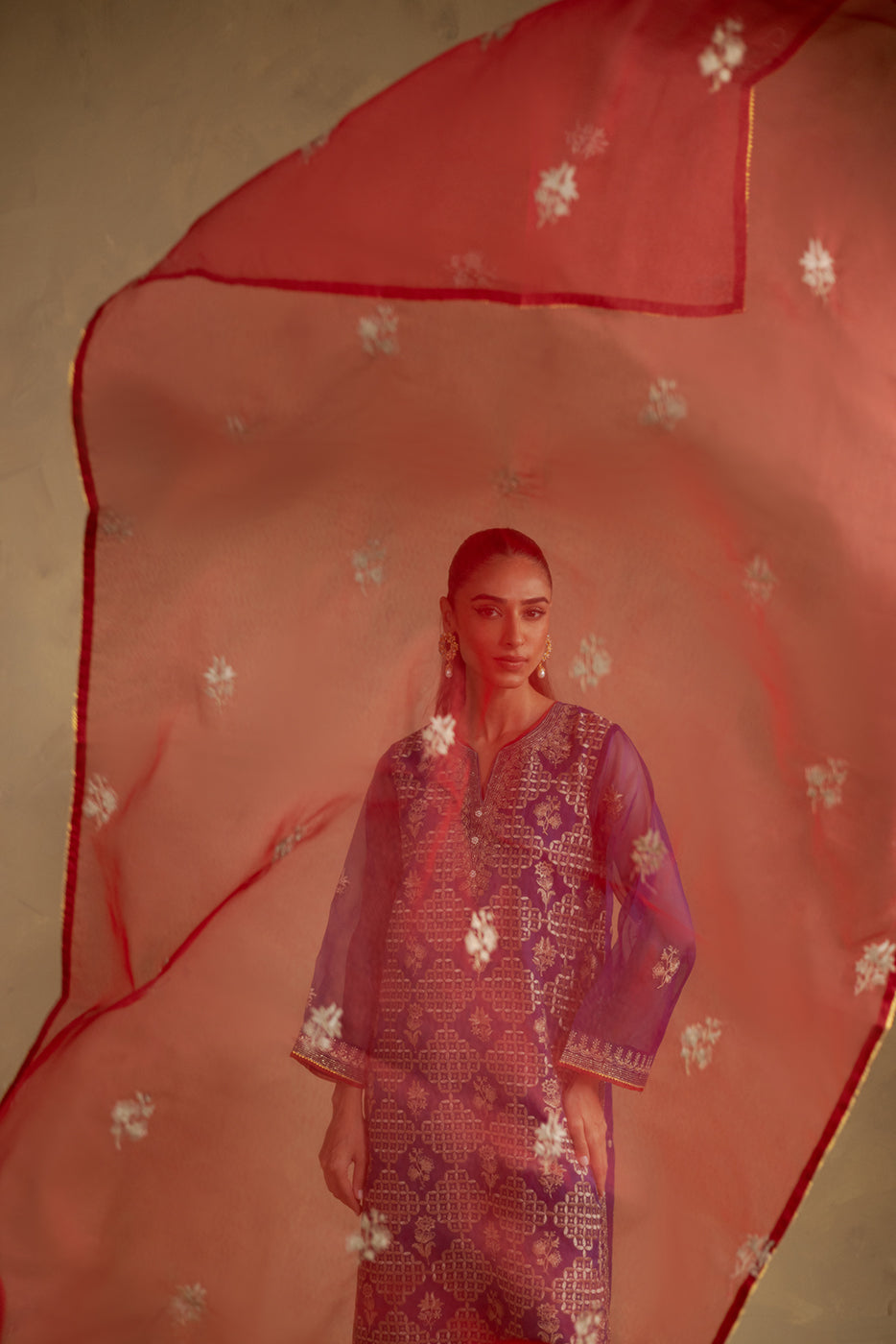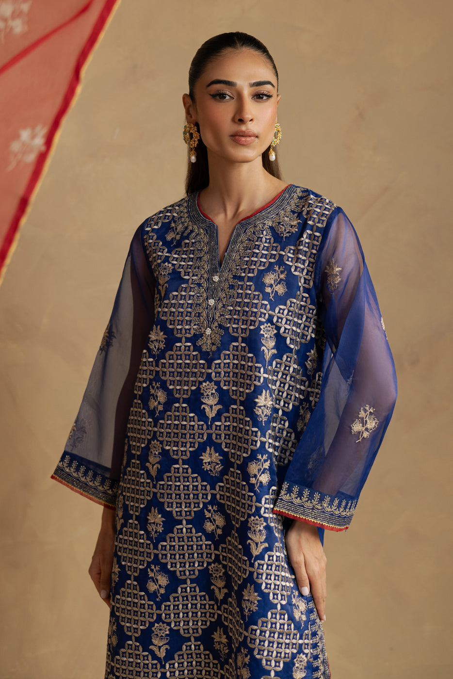 description: all over embroidered shirt with round neckline and v-slit with handwork detail,and contrasting trim and lace detail on front and sleeves.paired with embroidered culotte pants and embroidered dupatta to complete the look. fabric: organza what you'll get: shirt+pant+dupatta fit: casual fit size & fit: model height is 5'6" model is wearing 8 size