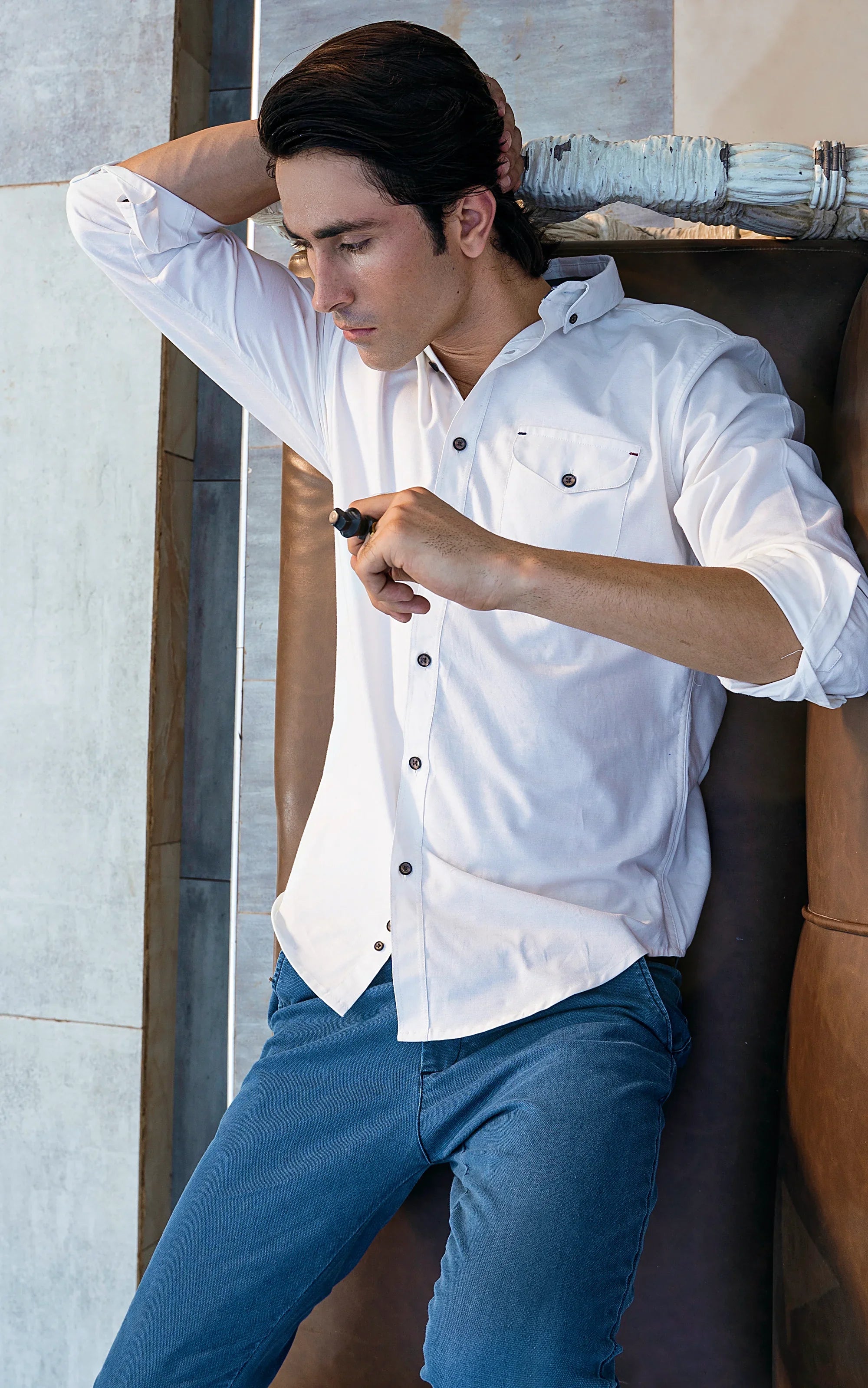 the full sleeves shirt described features a button-down collar, providing a classic and versatile look suitable for various occasions. its defining detail lies in the half contrast inside ban with piping, adding a subtle yet stylish contrast to the overall design. a front pocket adorned with contrast bartacks enhances functionality while maintaining aesthetic appeal. the shirt is further accented by contrast button threads, highlighting attention to detail and craftsmanship. round cuffs complete the sleeves, ensuring a neat and polished appearance. crafted from plain cotton rich fabric, the shirt combines simplicity with tasteful accents, making it a sophisticated choice for both formal and casual wear.